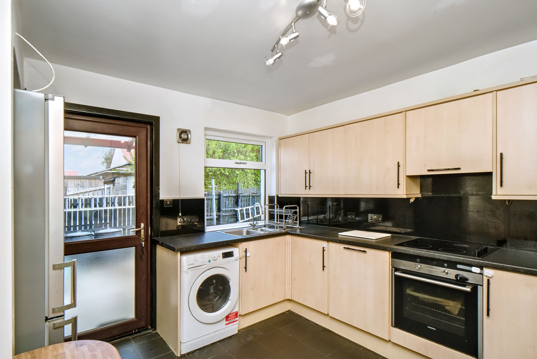 In the neighbouring kitchen, wood-styled wall and base cabinets are accompanied by spacious worktops and splashback panels, with integrated appliances comprising an oven, hob and extractor fan, whilst a freestanding fridge/freezer and washing machine are also included. A breakfast bar creates the perfect space for morning coffee, and the kitchen also affords access to the garden.