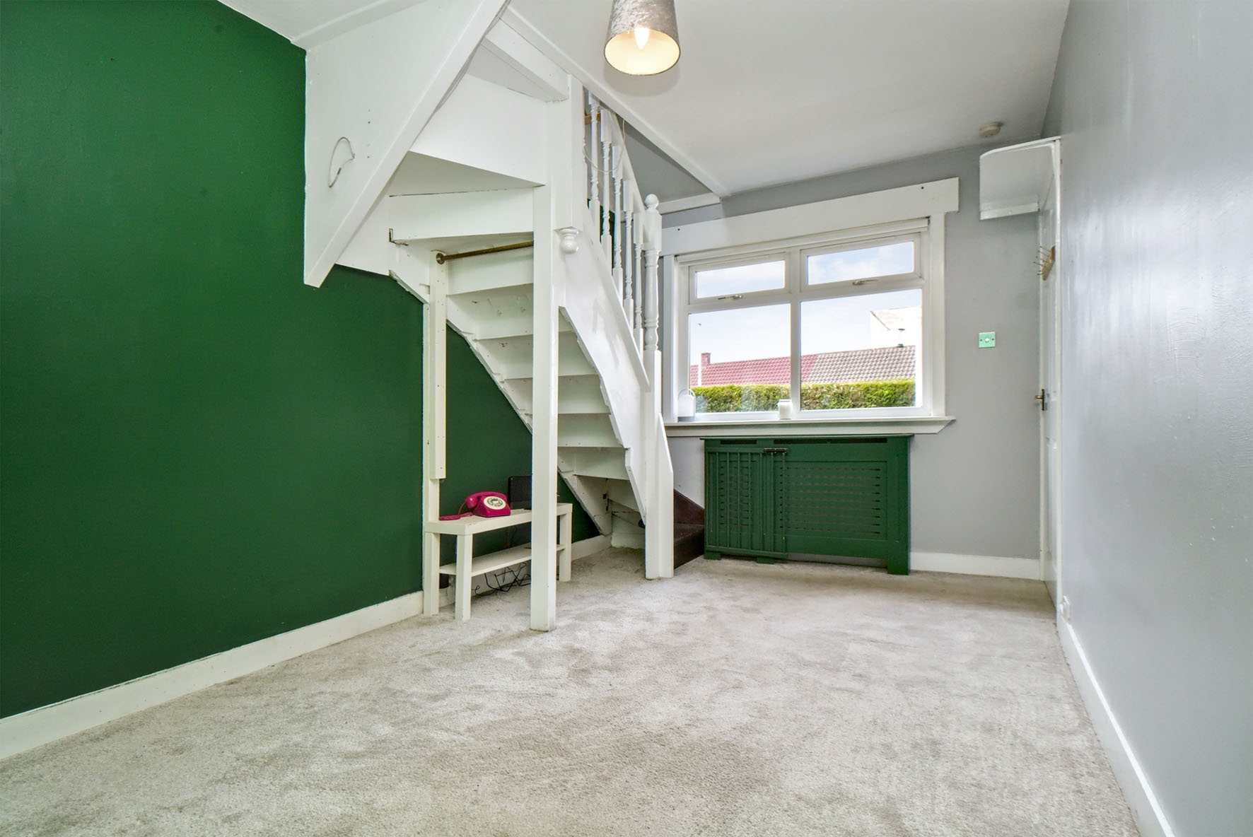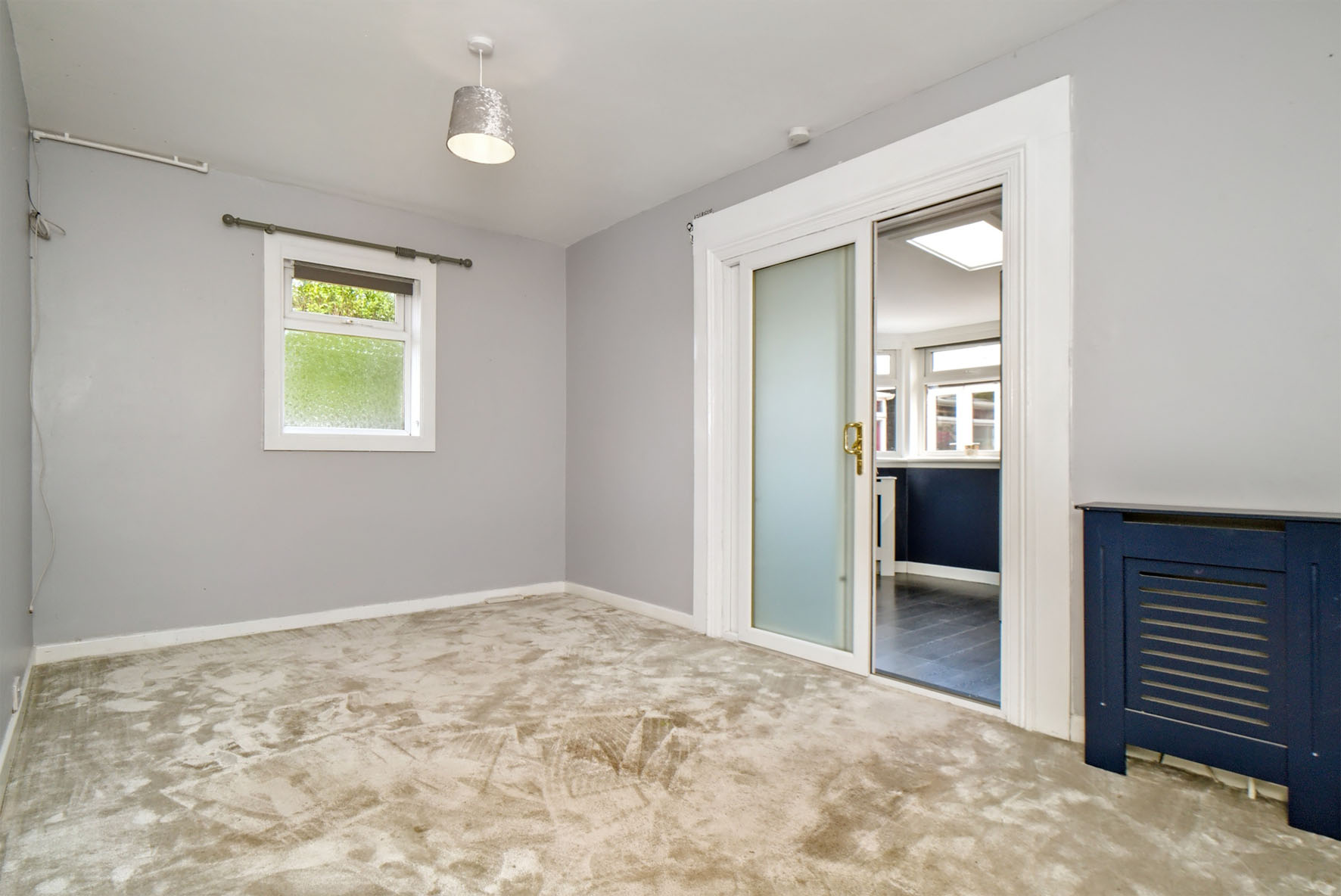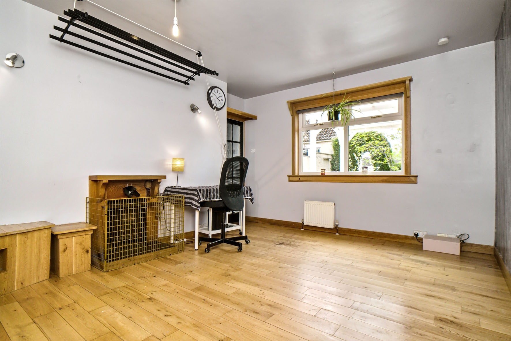 An entrance vestibule welcomes you into the home, leading through to a hallway with a good-sized, multipurpose box room. Following the hall along to the end, you reach a living room, where a southerly facing window captures sunny natural light throughout the day. The wood floored room offers plenty of space for furniture and features a fireplace and a useful clothes pulley.