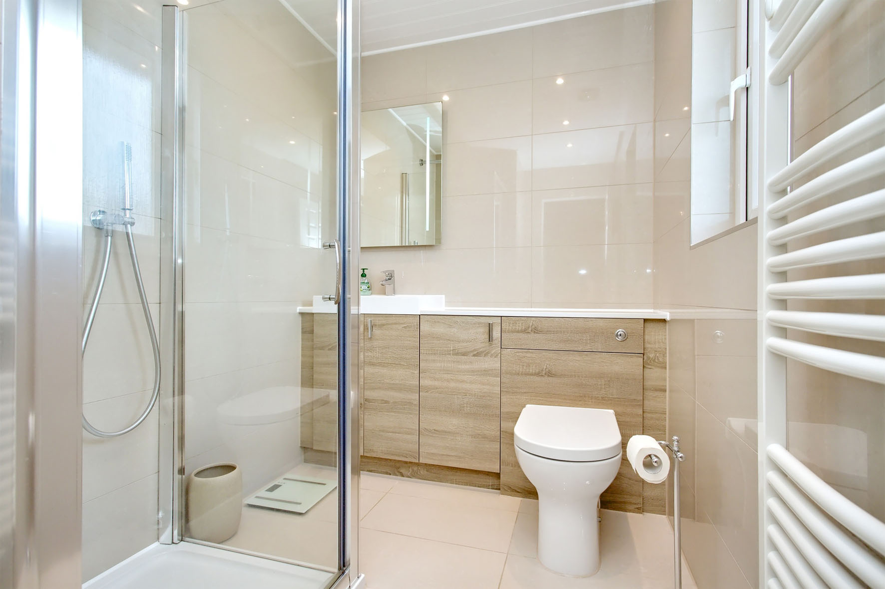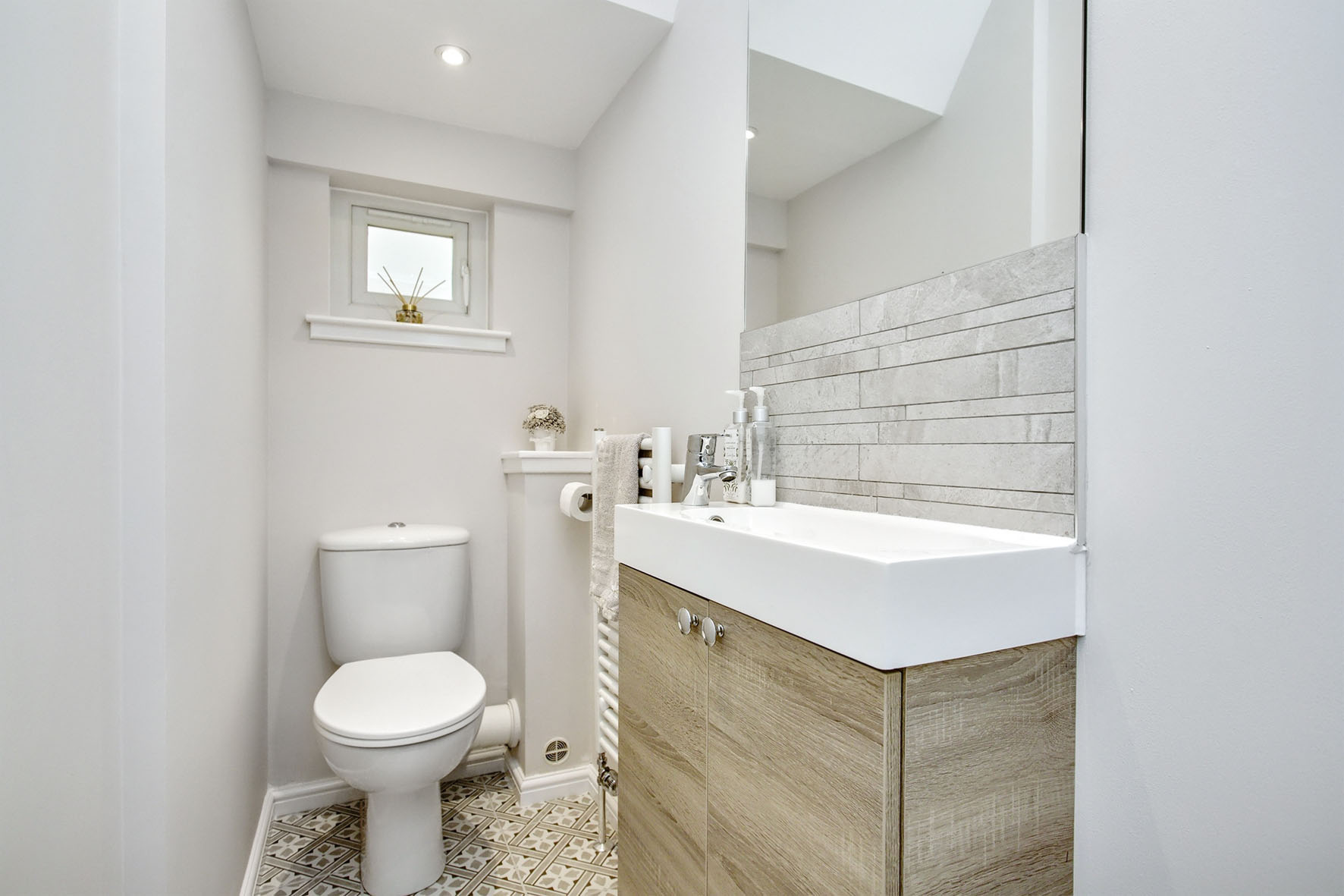 On the first floor, a naturally-lit landing (with an airing cupboard) leads to the three bedrooms, all of which are supplemented by built-in mirrored wardrobes for added convenience. The principal and second bedrooms are both large doubles, whilst the third bedroom offers the additional versatility to be used creatively, such as an office (if preferred). All three rooms are attractively decorated and laid with plush carpets. The principal bedroom also boasts a contemporary en-suite shower room. The family shower room is of an equally high specification, incorporating a storage-set WC suite (with a granite countertop like the en-suite) and a double walk-in rainfall shower. Gas central heating and double glazing ensure year-round comfort.