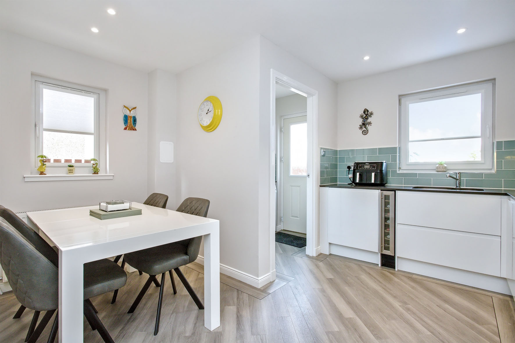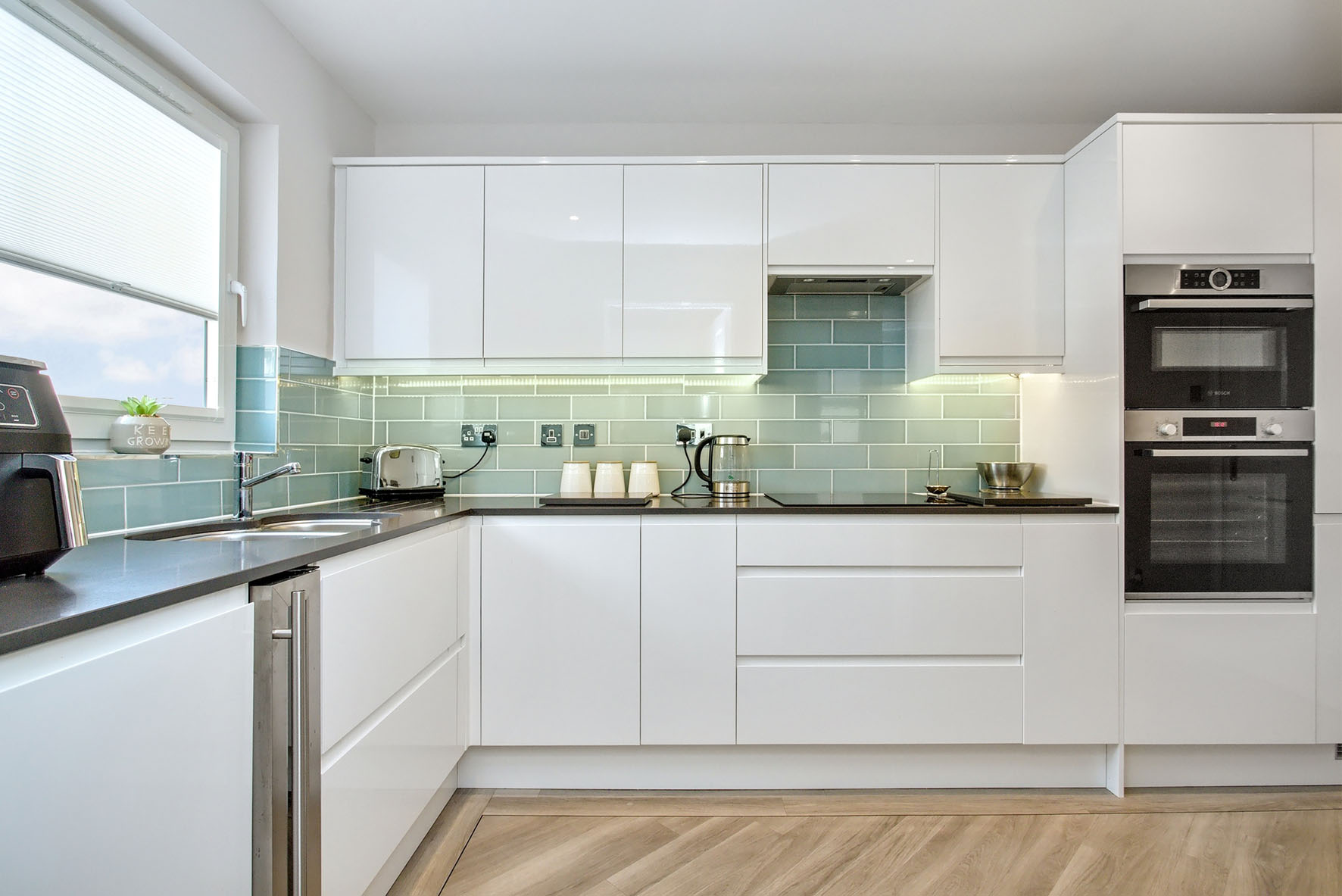 Inside, an Amtico-floored hall offers a warm welcome, along with the practicality of built-in storage and a WC. To the left is the living room. Here, on-trend neutral styling creates an inviting environment that draws you in. Spacious proportions accommodate comfy furnishings and a south-facing bay window ensures a flood of natural light throughout the entire day. Meanwhile, the dual-aspect dining kitchen is to the rear of the property, sporting an ultra-modern design. It is fitted with handle-less cabinets in white and solid granite worksurfaces for a monochrome-inspired aesthetic that is brightened by colourful splashbacks. Undercabinet lighting and integrated appliances complete the sophisticated look (induction hob, concealed extractor, oven, combi microwave oven, fridge/freezer, wine fridge, and dishwasher). A utility room with Amtico flooring provides a quiet space for laundry.