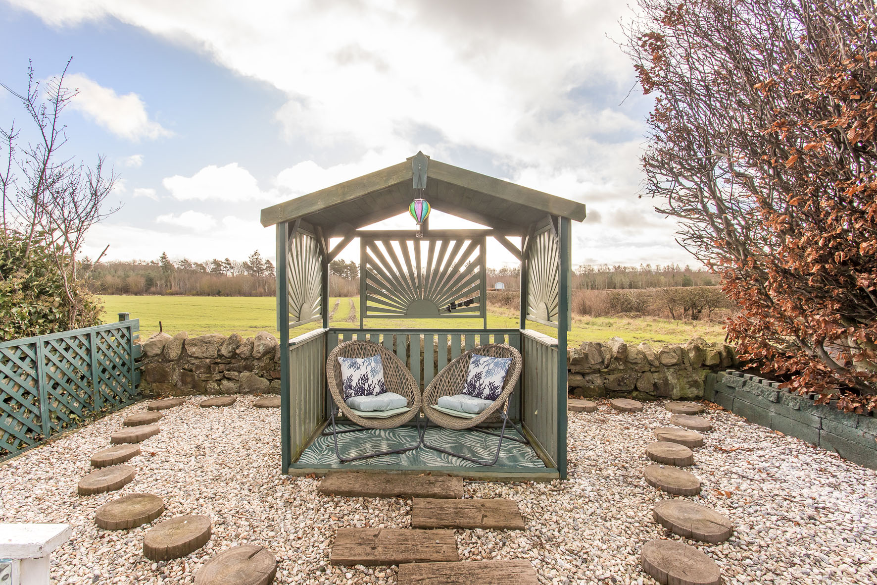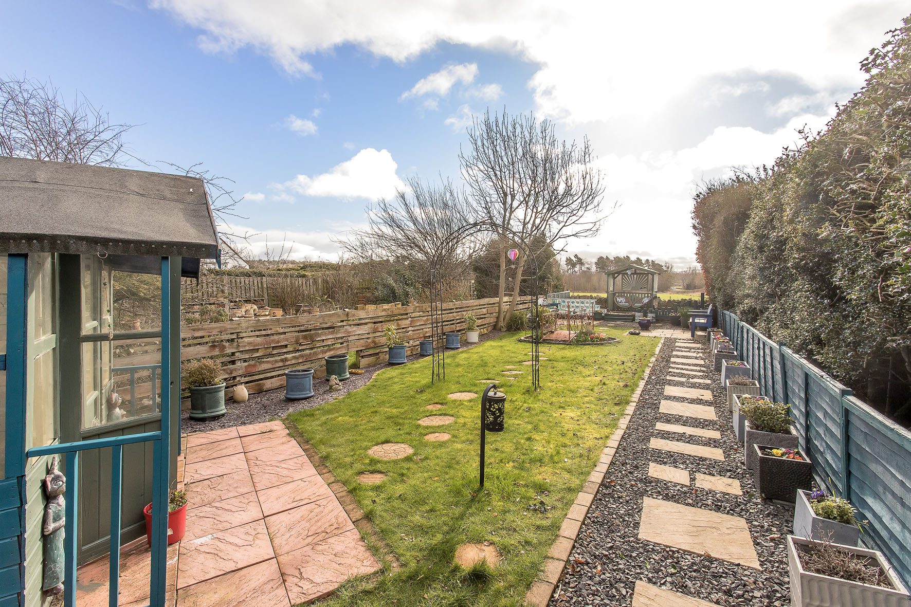 Positioned to the side of the terrace, the impressive detached garden offers a generous lawn, a summer house, and multiple seating areas to enjoy the open countryside views. Here, there is also a shed and a detached single garage for private parking.