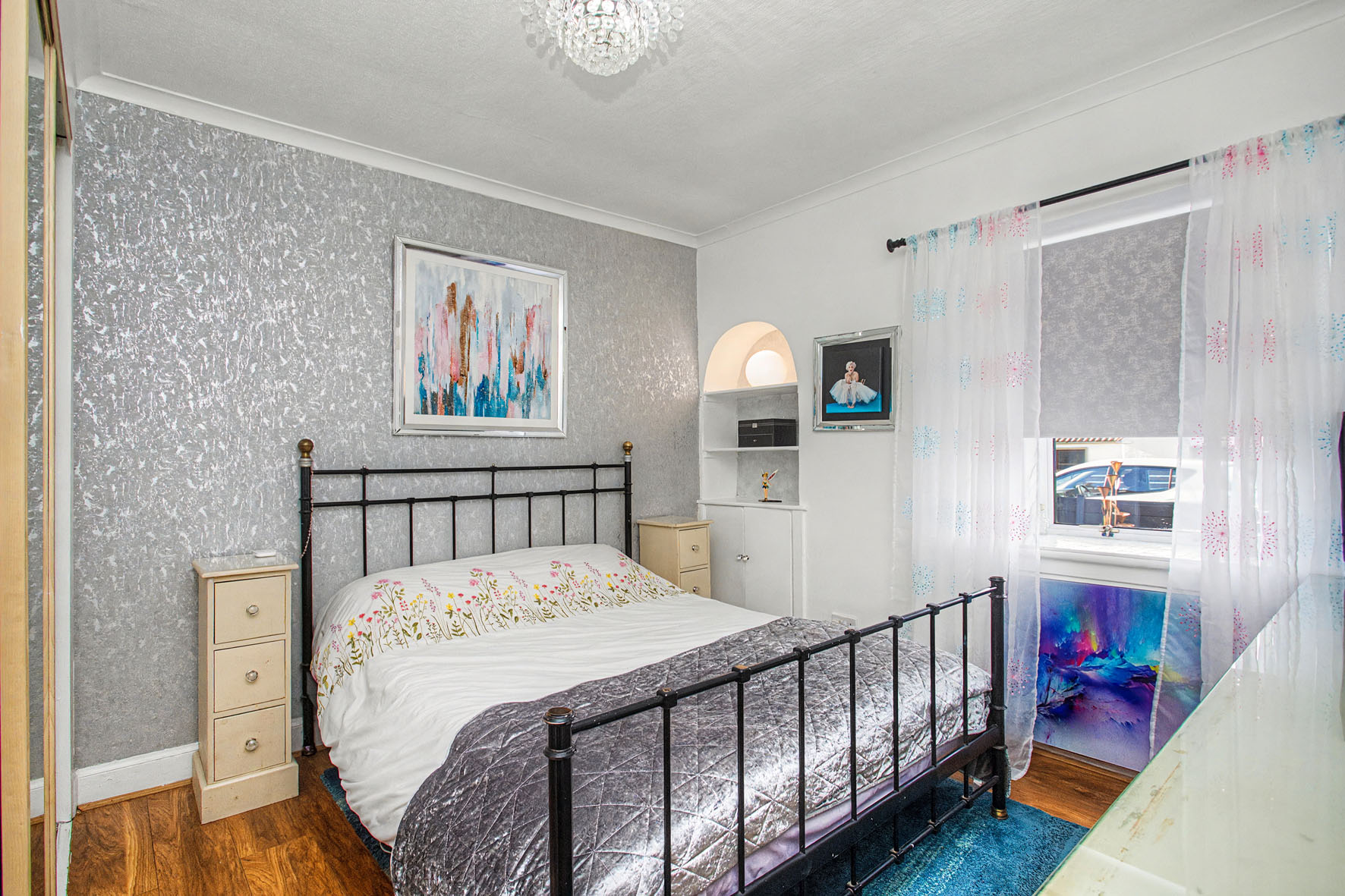 The reception room flows into the sunny kitchen, which is attractively appointed in a classic shaker-inspired style, enhanced by iridescent mosaic tiling. Integrated appliances include a fridge freezer, second freezer, microwave, oven, and gas hob, alongside an undercounter washing machine and tumble dryer.