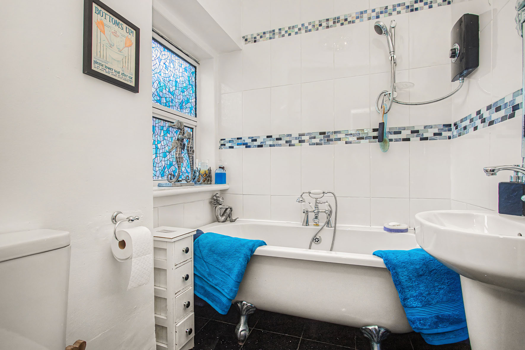 The bright bathroom is fitted with a claw-foot bath and overhead shower, framed by white tiling with aqua-toned accents. A hatch in the hall provides access to the large floored attic, which includes additional cupboard storage.