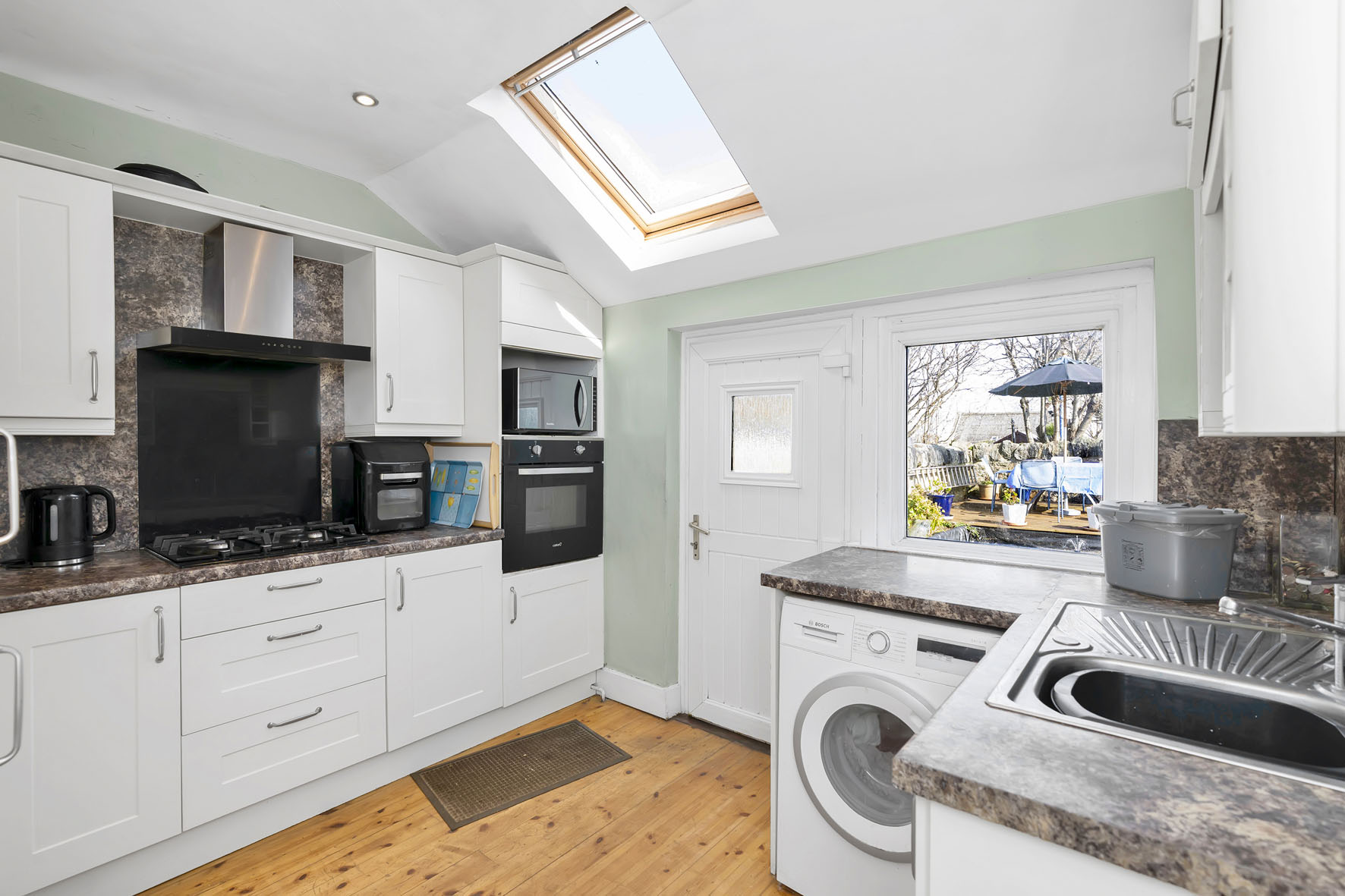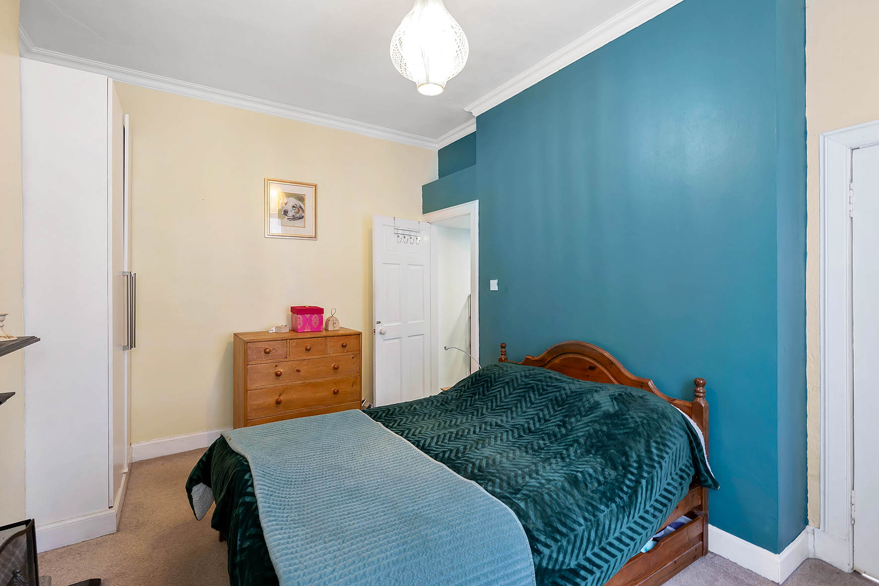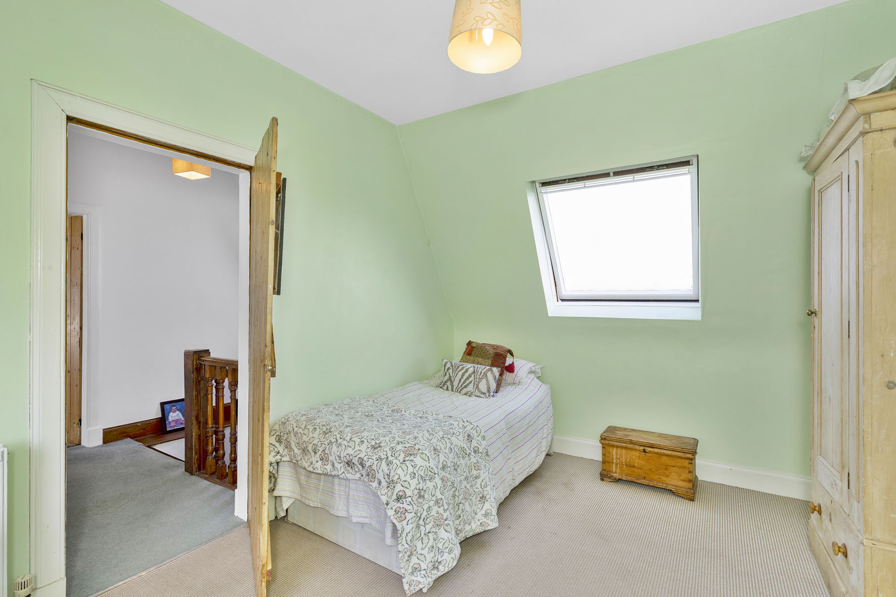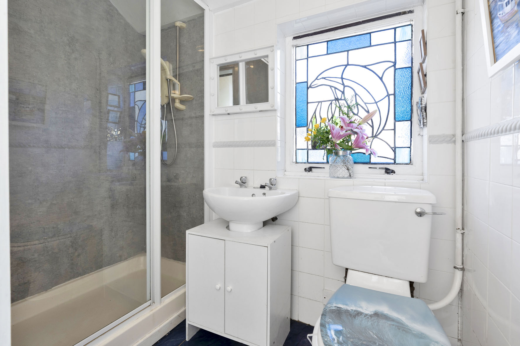 The kitchen offers excellent storage and workspace, as well as a range of integrated appliances and access to the rear garden. There is also a neighbouring three-piece shower room with a lovely dolphin-themed stained-glass window. The principal bedroom completes the ground floor, providing a generously proportioned room which is supplemented by built-in storage and a three-piece en-suite bathroom. The two remaining bedrooms are upstairs, off a bright landing with an airing cupboard. They are also spacious doubles which are attractively presented.
