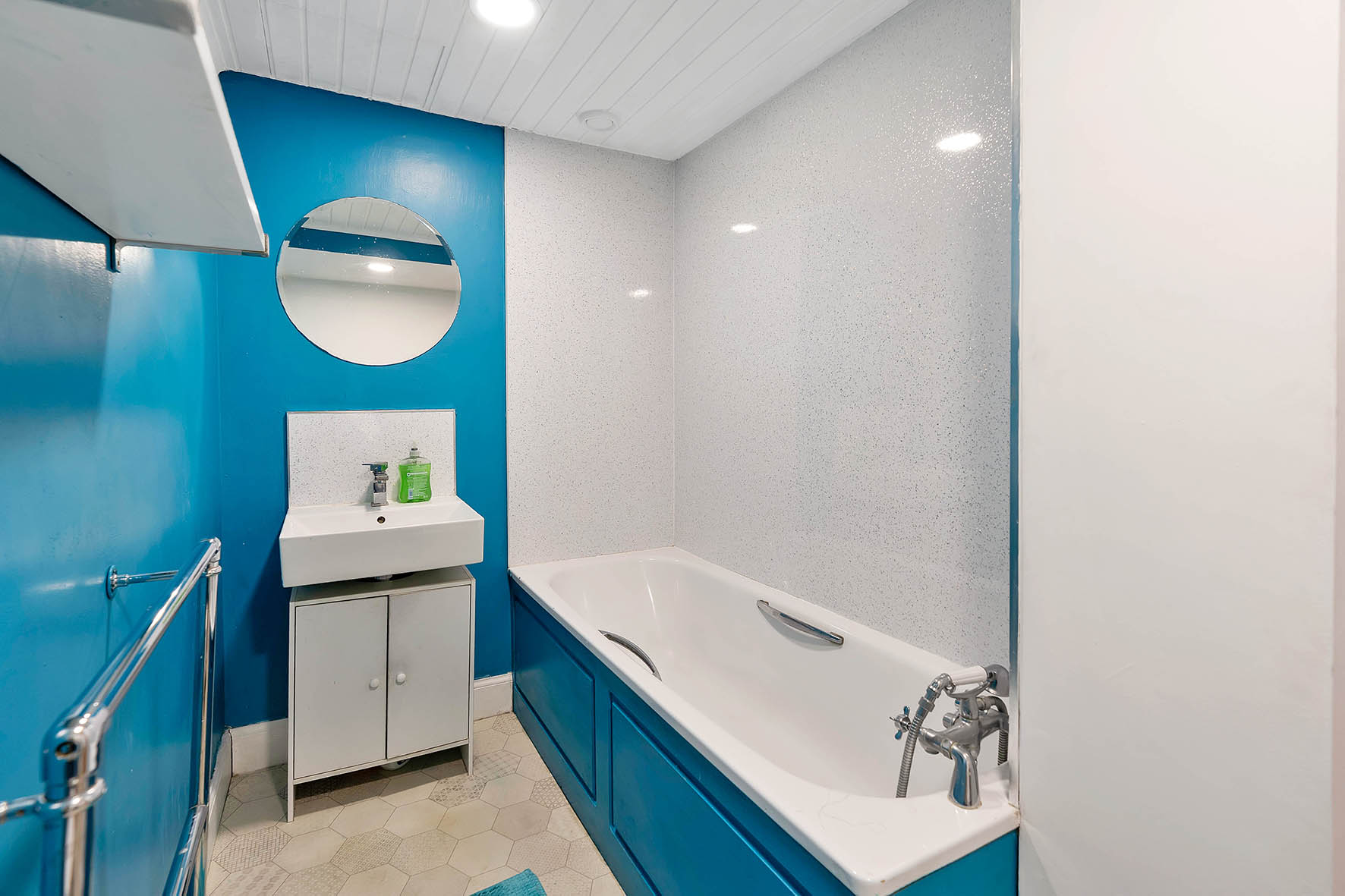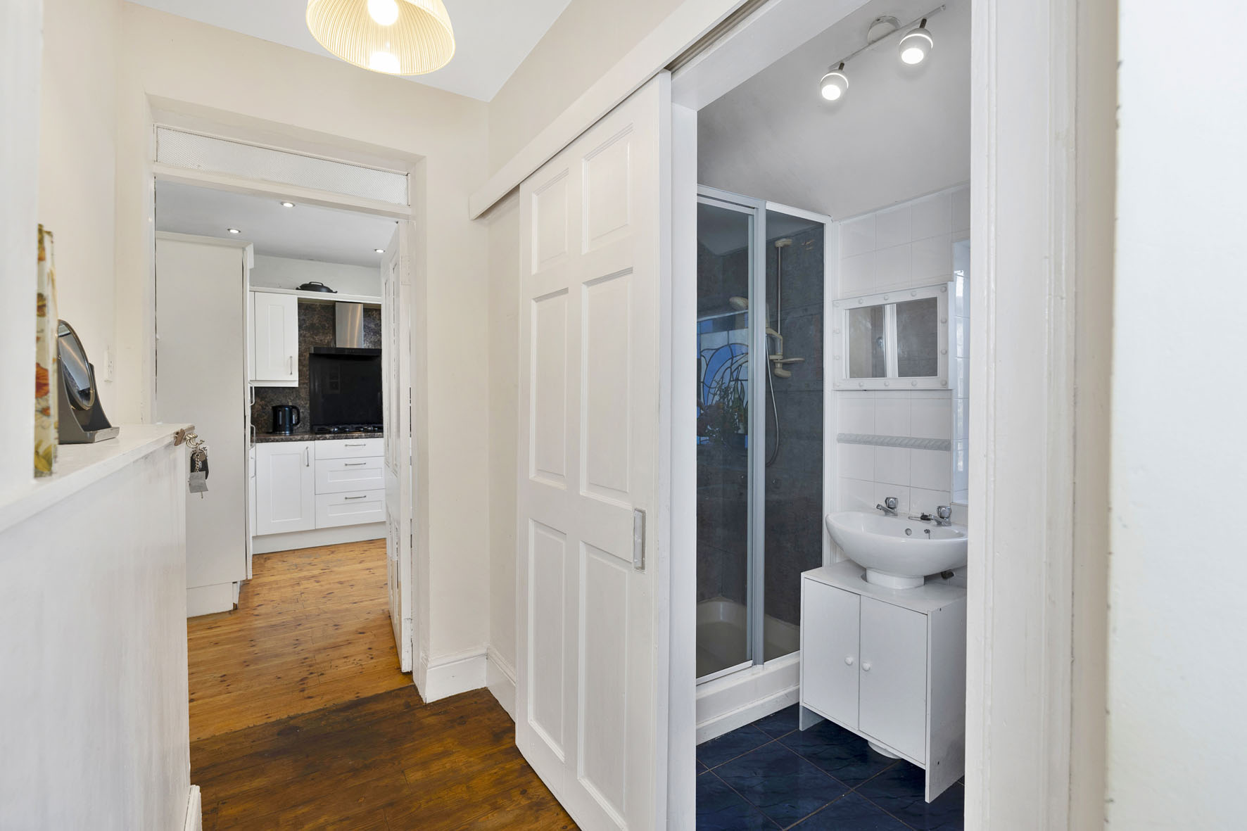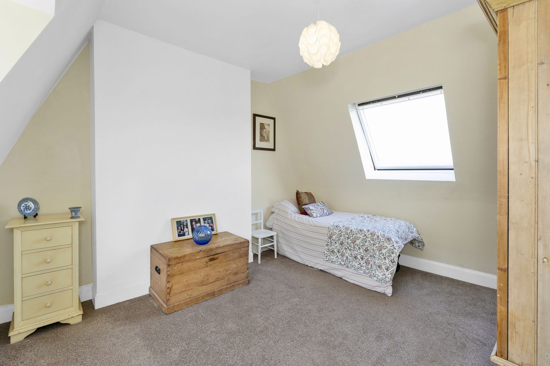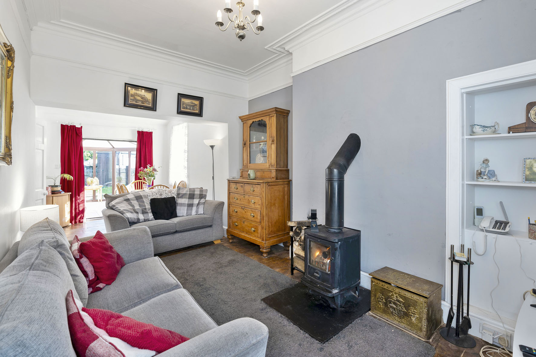 The kitchen offers excellent storage and workspace, as well as a range of integrated appliances and access to the rear garden. There is also a neighbouring three-piece shower room with a lovely dolphin-themed stained-glass window. The principal bedroom completes the ground floor, providing a generously proportioned room which is supplemented by built-in storage and a three-piece en-suite bathroom. The two remaining bedrooms are upstairs, off a bright landing with an airing cupboard. They are also spacious doubles which are attractively presented.