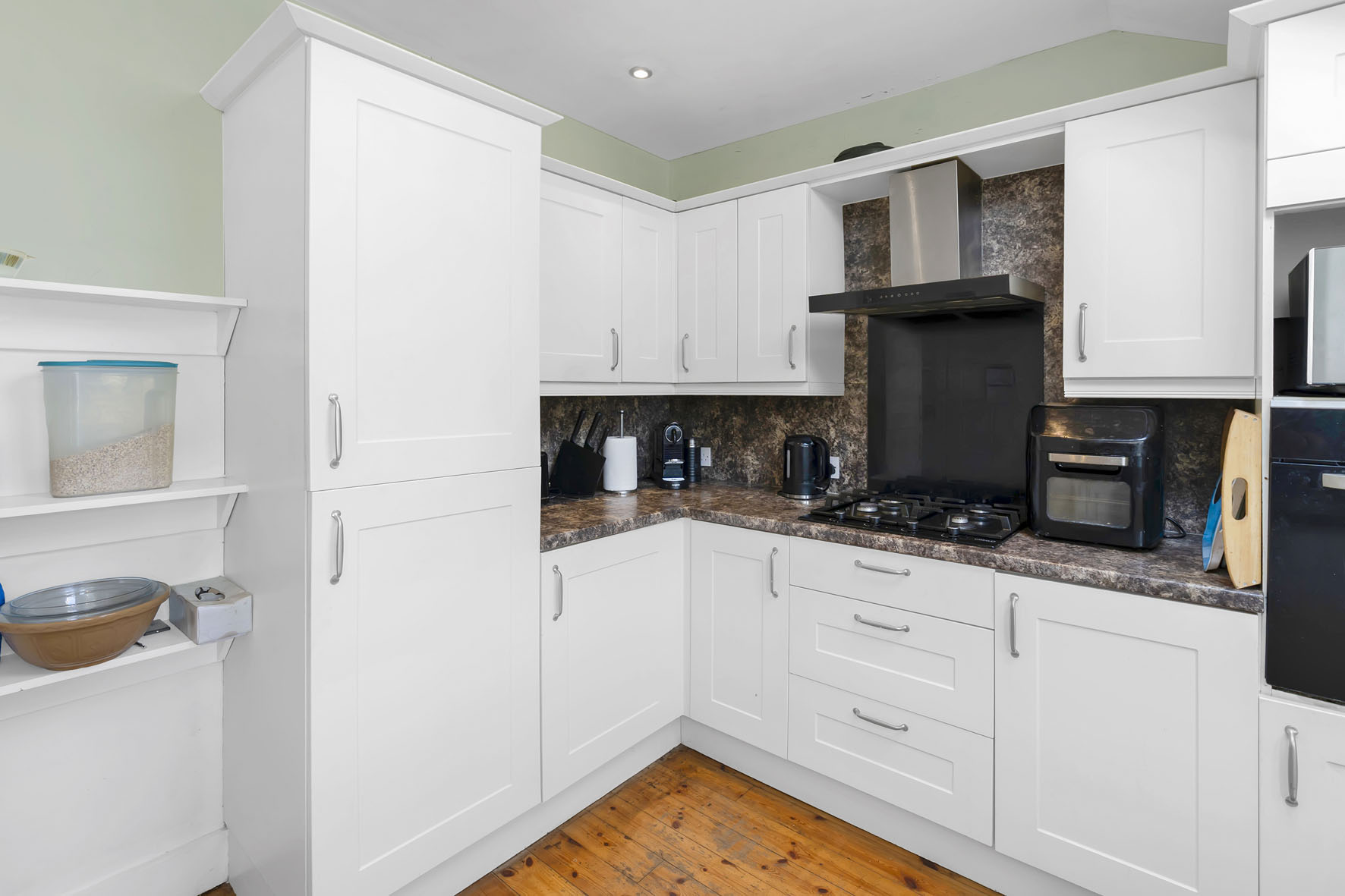 Stepping inside, you are greeted by an entrance hall that leads right into the living and dining room. This large reception area spans over 237 square feet offering plenty of room for a wide choice of furnishings. It elegantly pairs neutral décor with a subtle accent wall and varnished wooden floorboards, creating an inviting aesthetic which is enhanced by a picture rail and a cosy log-burning stove. A shelved recess adds practicality, while dual-aspect windows ensure a flood of daily sun. An openly accessed conservatory brings even more light into the space, providing a delightful area for unwinding amidst the garden ambience. Meanwhile, the Shaker-inspired kitchen has cream-coloured cabinets and stone-inspired worktops backed by matching splashbacks.