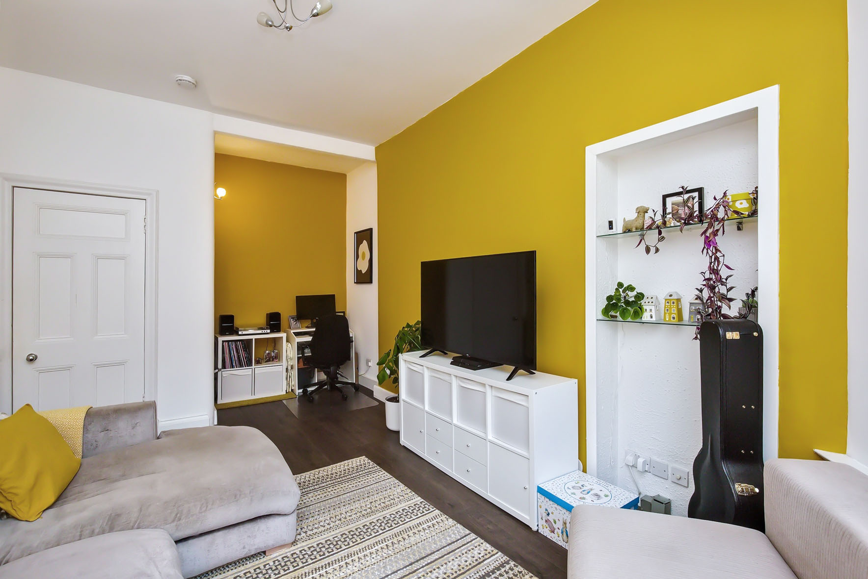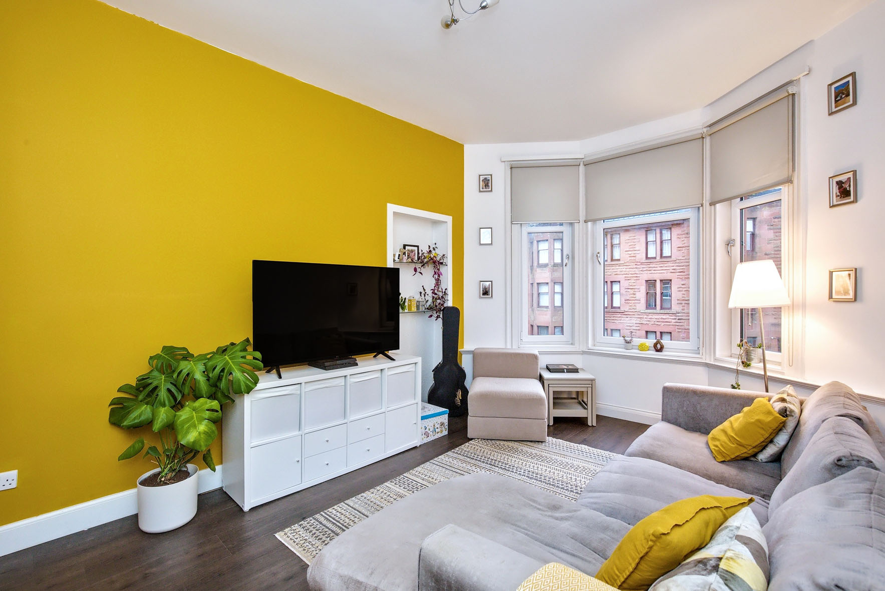 The home features an inviting entrance hall with storage, a sunny living room with press shelving and a large bay window, and a stylish dining kitchen fitted with contemporary units.