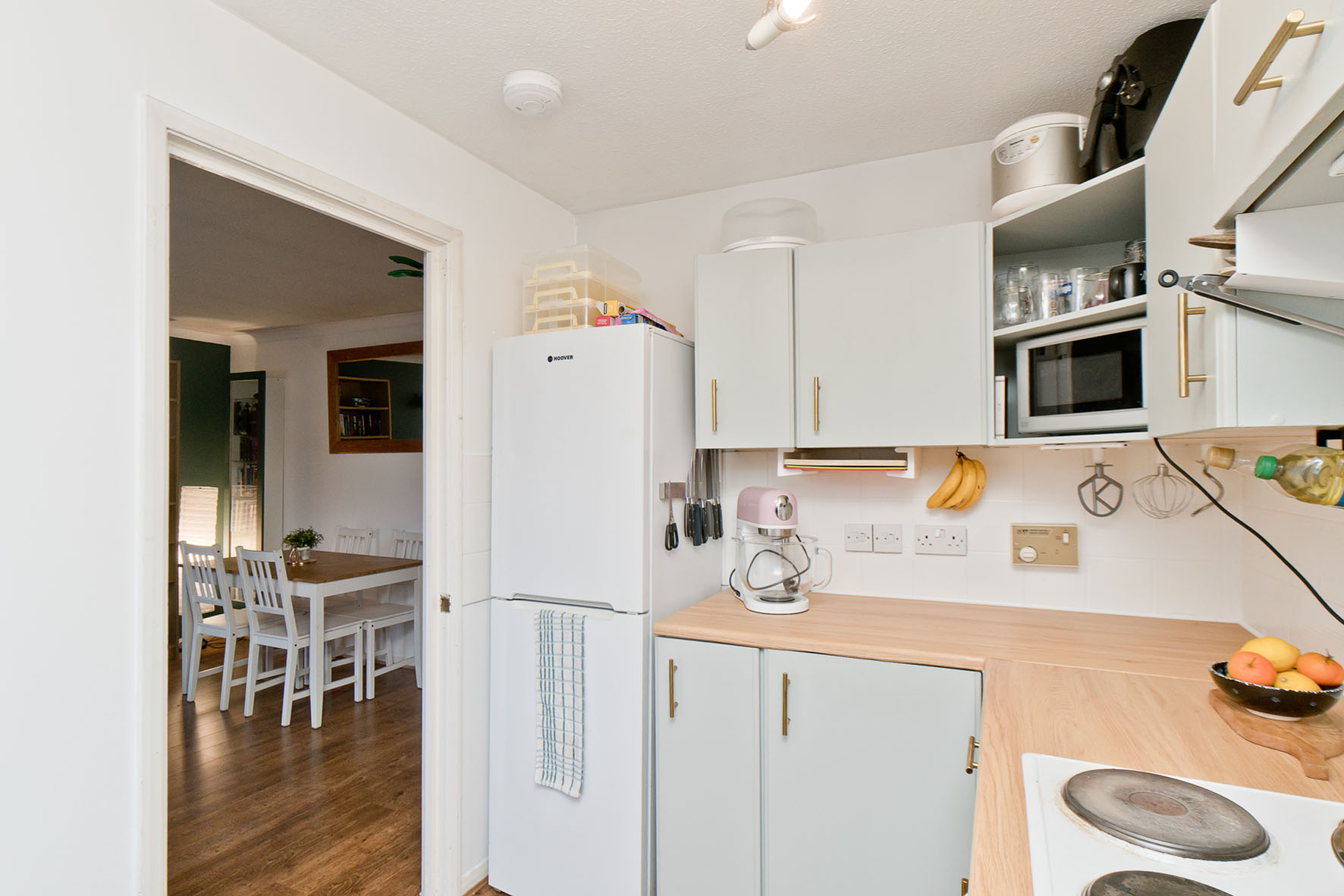 The kitchen is openly accessed from here, sporting a well-appointed range of cabinets in mix-and-match tones alongside complementary worktops. It comes with an integrated oven and electric hob, an undercounter dishwasher, and space for further appliances.