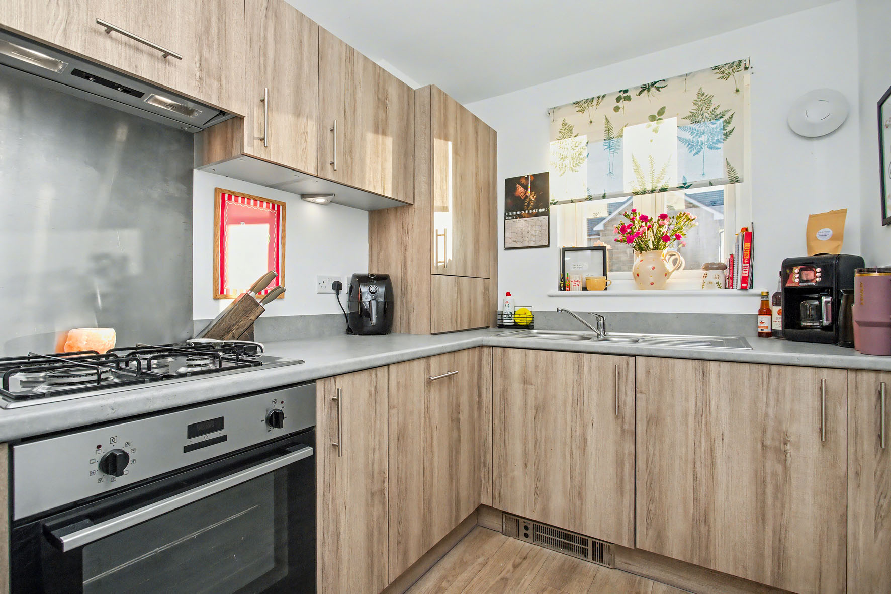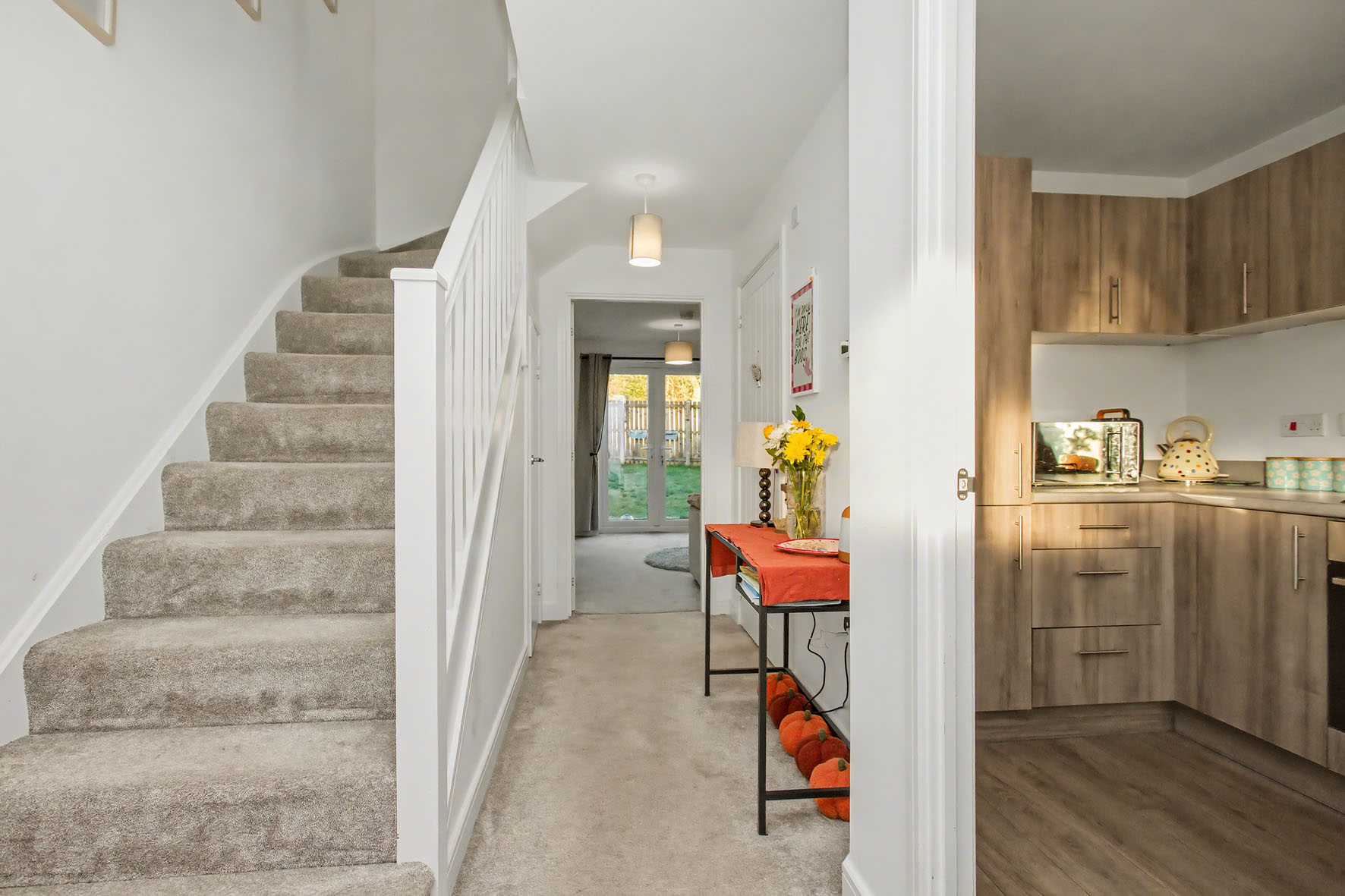 Upon entering, you are greeted by a hall that sets an inviting first impression. It offers understairs storage and a convenient WC before leading directly ahead into the living/dining room. This rear-facing reception area continues the hall’s neutral palette and soft carpet, creating a minimalist-inspired aesthetic that is homely and easy to style. The room is well proportioned for comfy furniture and it extends out via French doors into the rear garden, which is the ideal setup for summer entertaining.