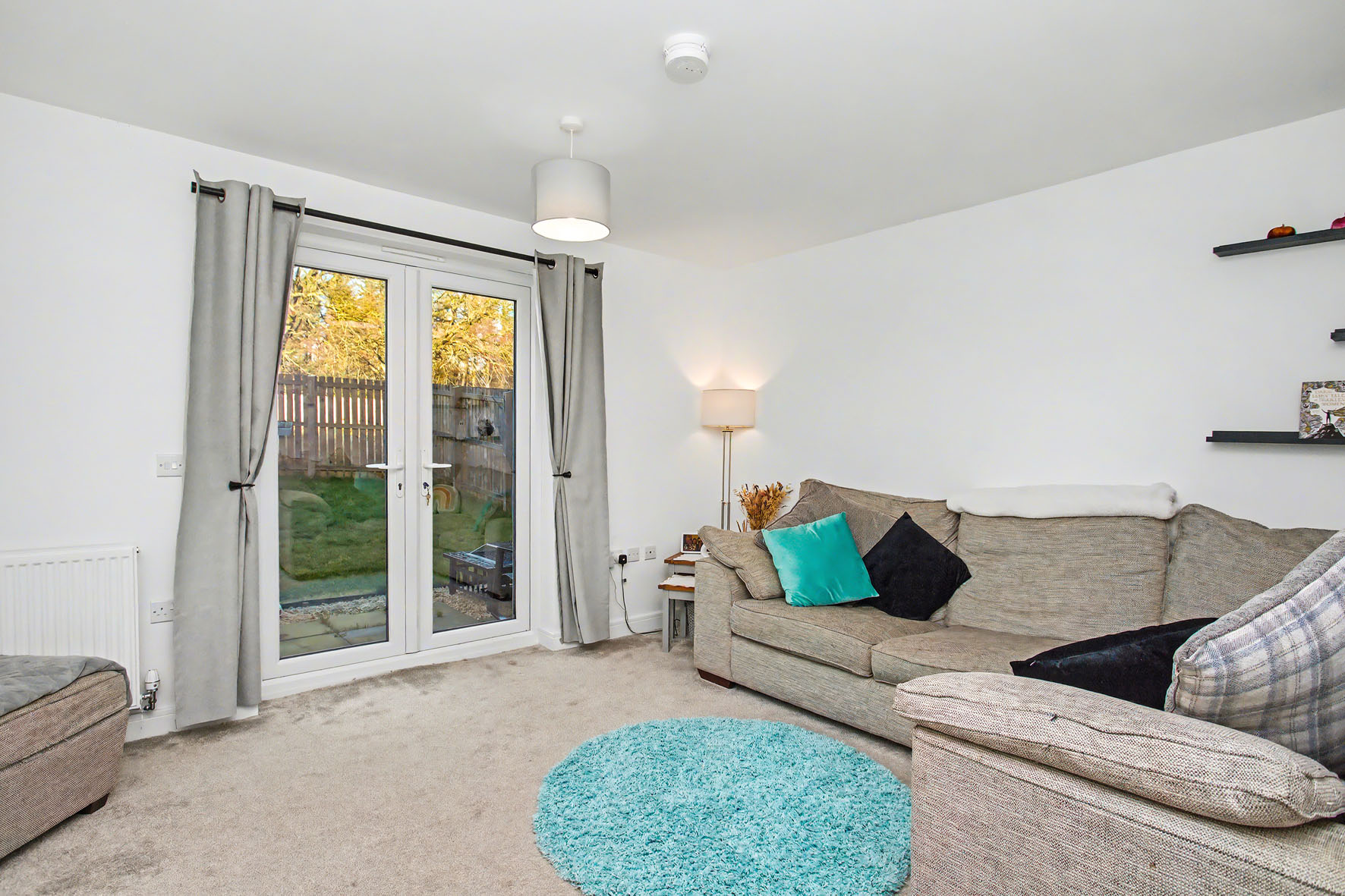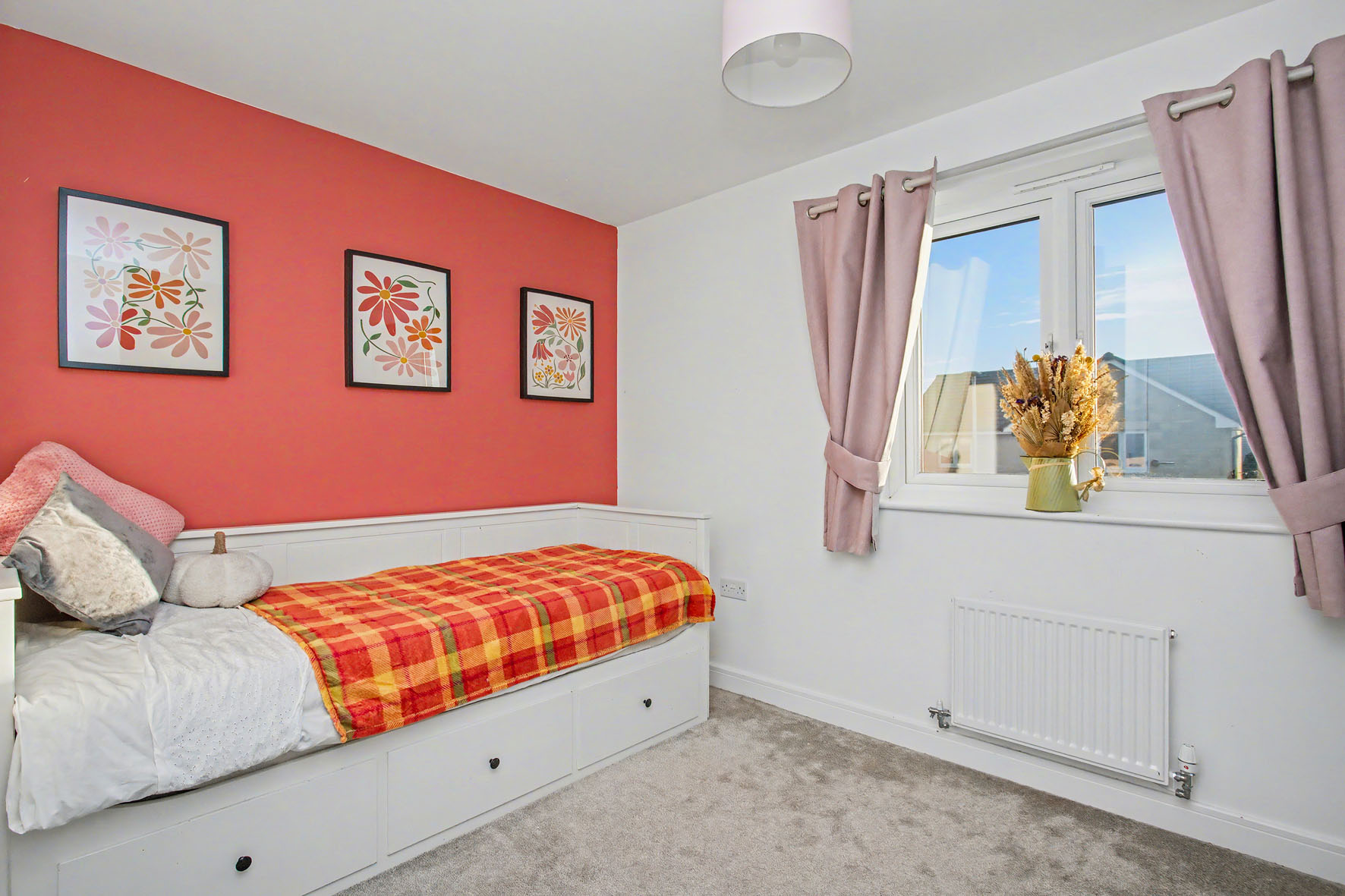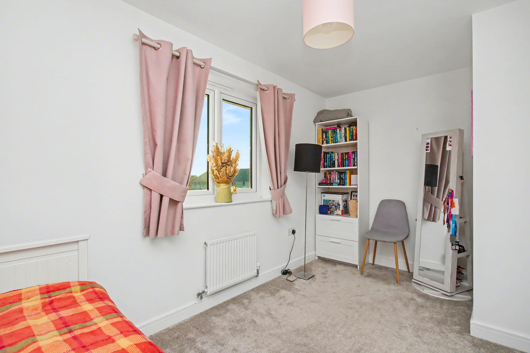 Upstairs, the two double bedrooms are havens of calm and comfort. Each room is attractively styled, pairing an accent wall with neutral tones and plush carpeting. The principal bedroom also features a built-in wardrobe and inspiring open views to the Pentland Hills – a magnificent backdrop to wake up to.