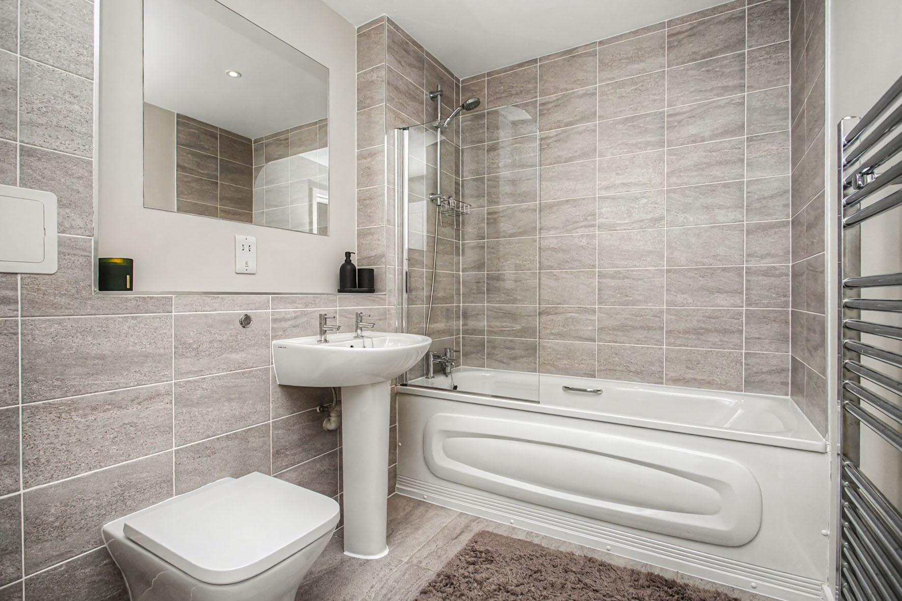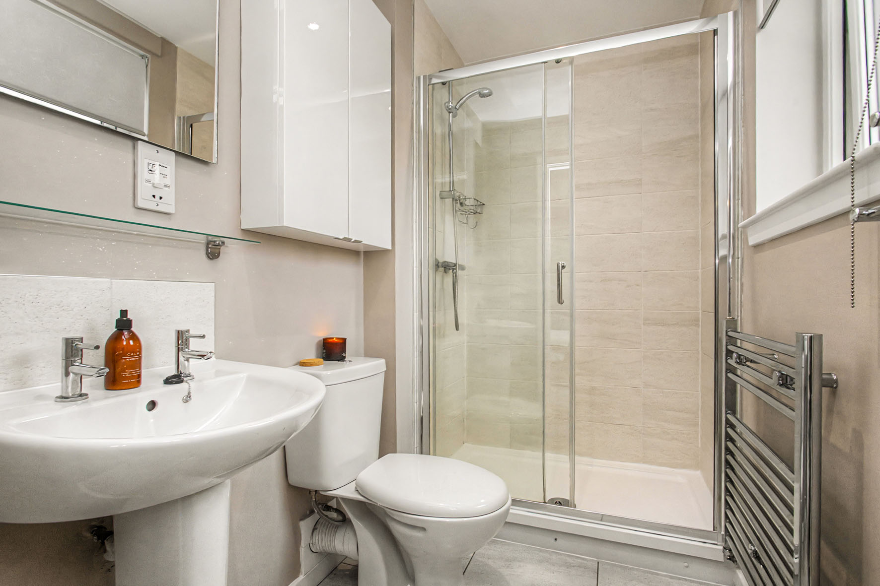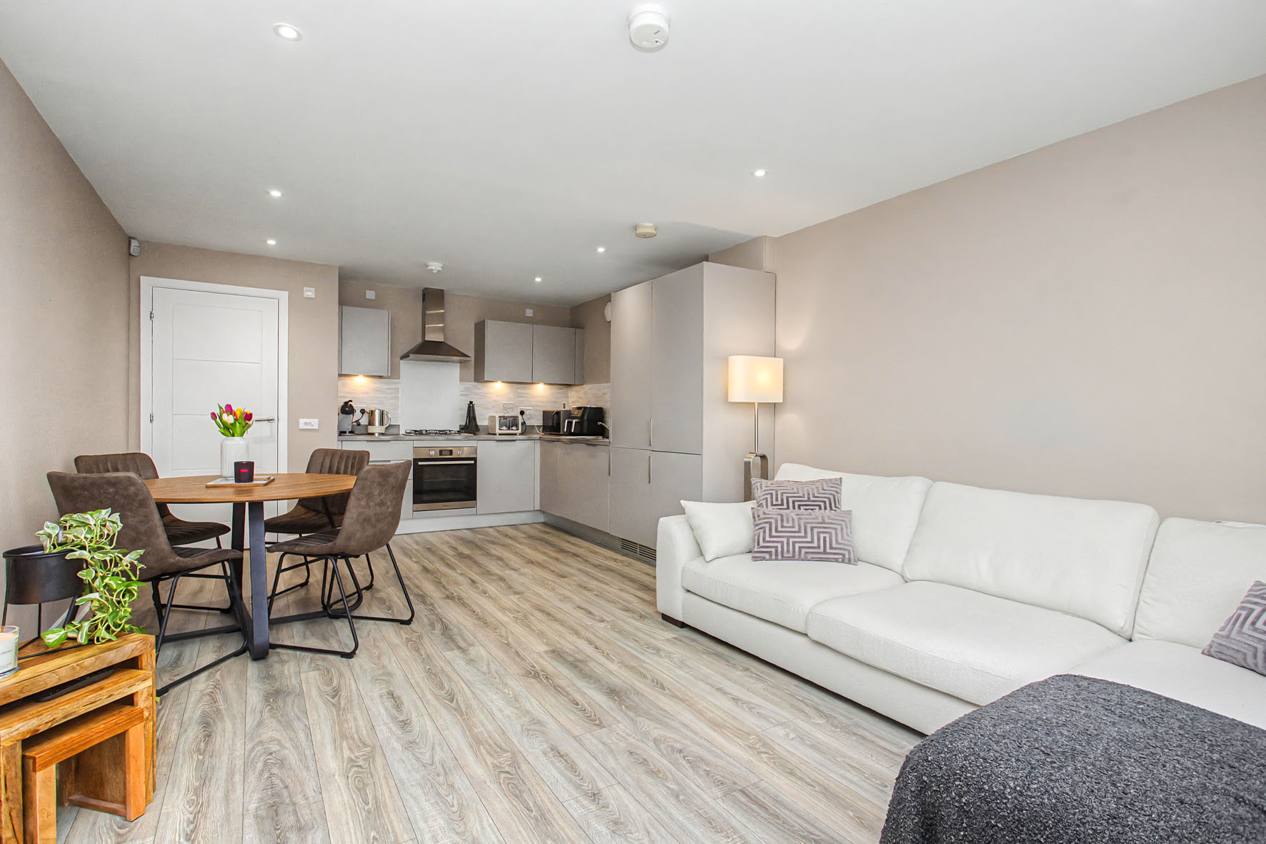 The bright, well-designed accommodation includes a sunny dual-aspect reception room open to an ultra-modern fitted kitchen, two bedrooms (including a principal suite with a walk-in wardrobe and en-suite shower room), and a sleek bathroom with a wall-hung mirror, overhead shower and towel warmer.