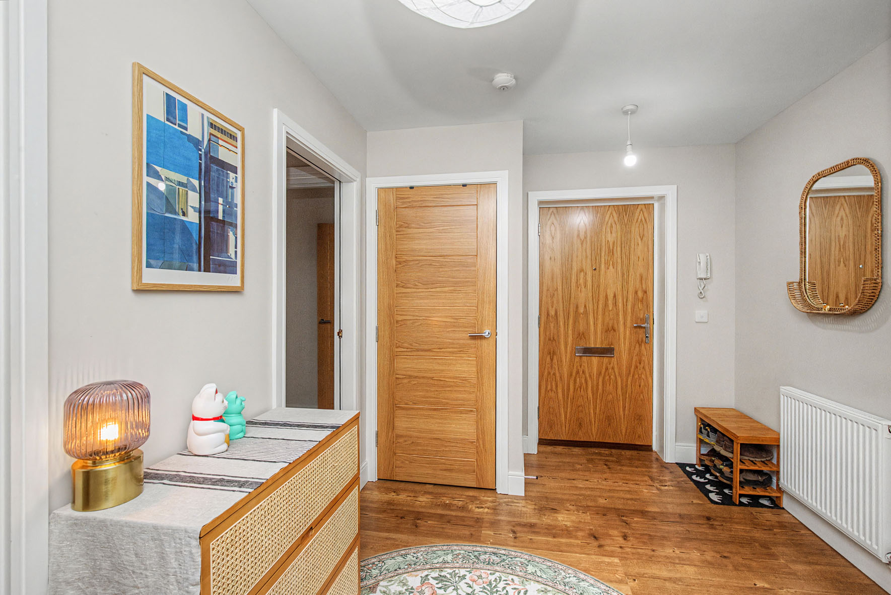 Two well-proportioned double bedrooms sit quietly at the rear, including a principal with an en-suite shower room, while the second offers home working flexibility. A separate bathroom features a shower-over-bath.