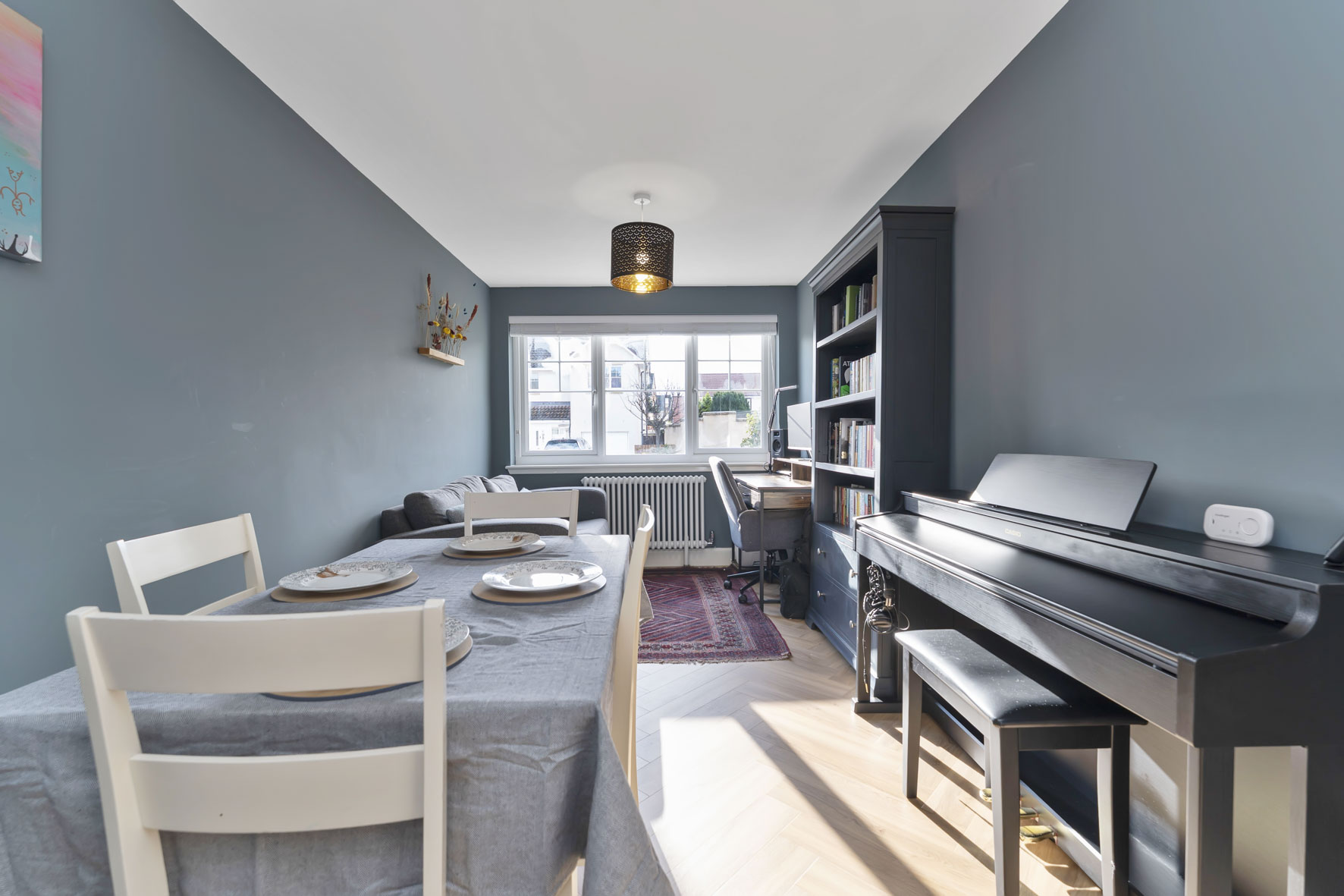 To the rear, a comfortable living room enjoys direct access to the enclosed rear garden via French doors, creating a natural flow between indoor and outdoor living.