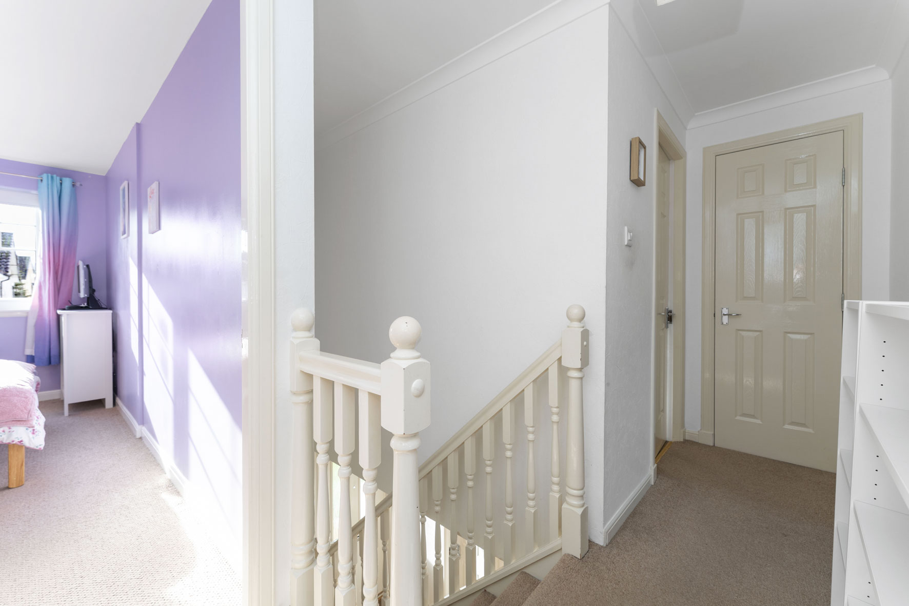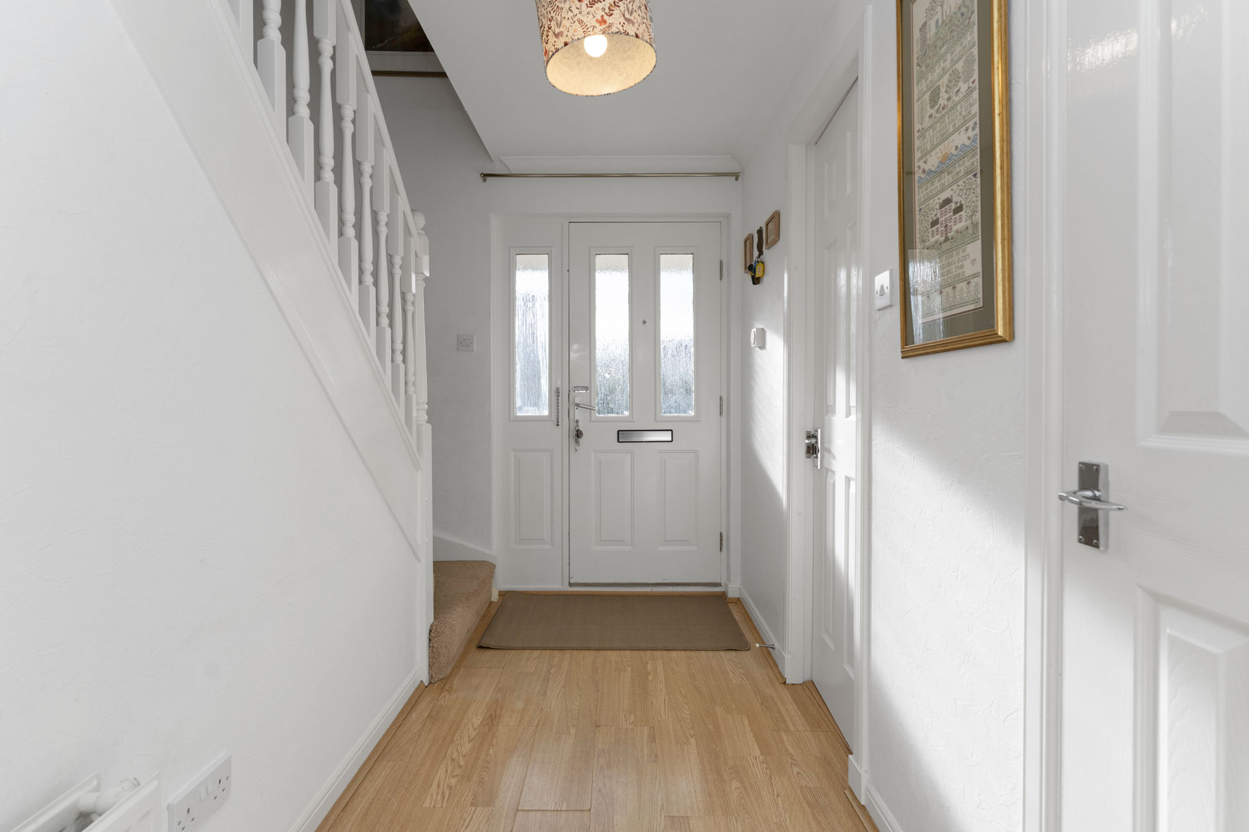 The front door opens into a welcoming entrance hall, finished in crisp neutral décor and providing access to a ground-floor WC and practical built-in storage.