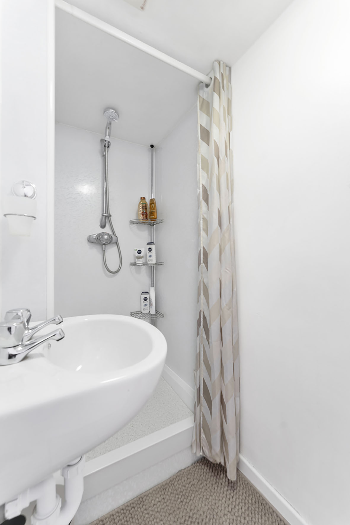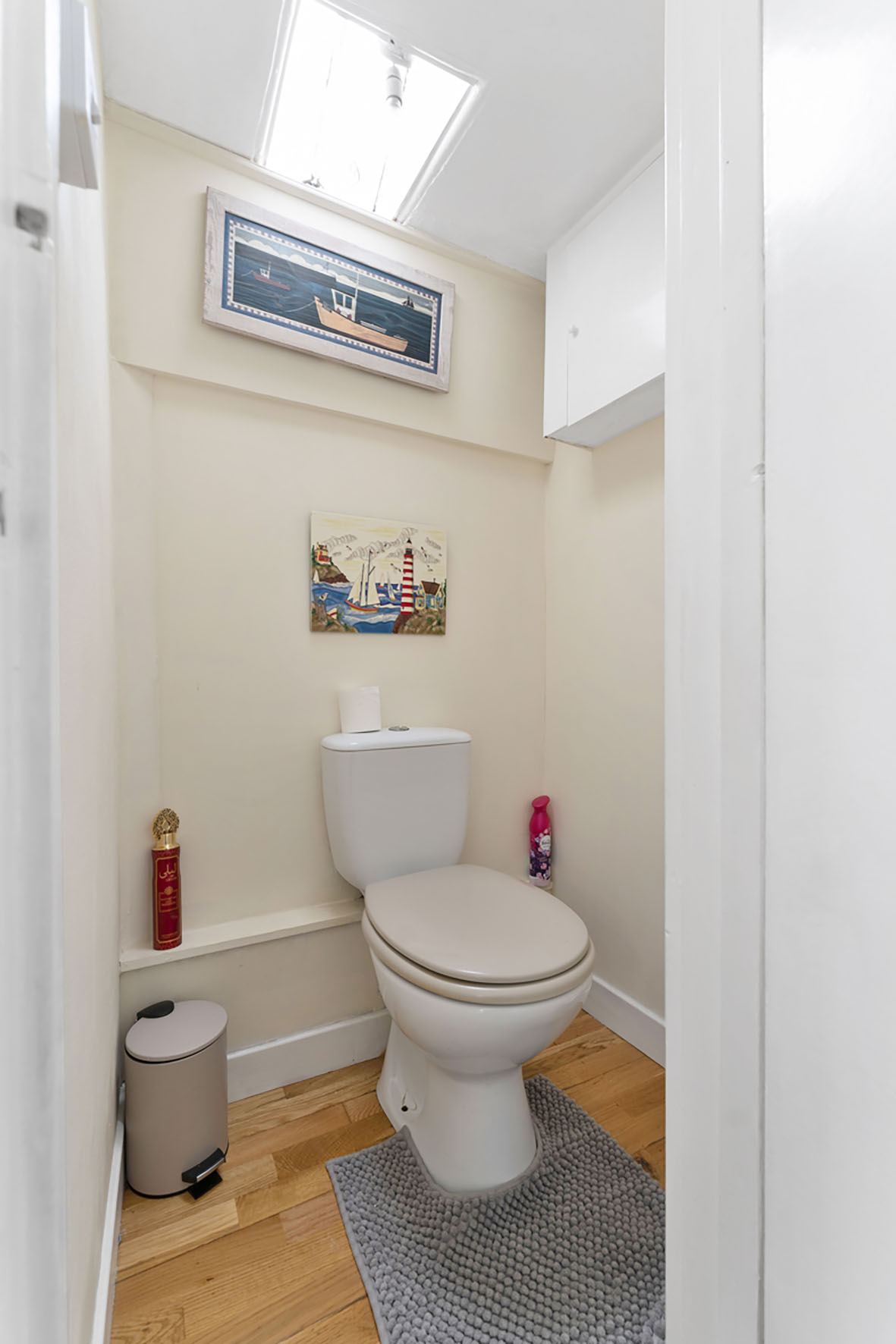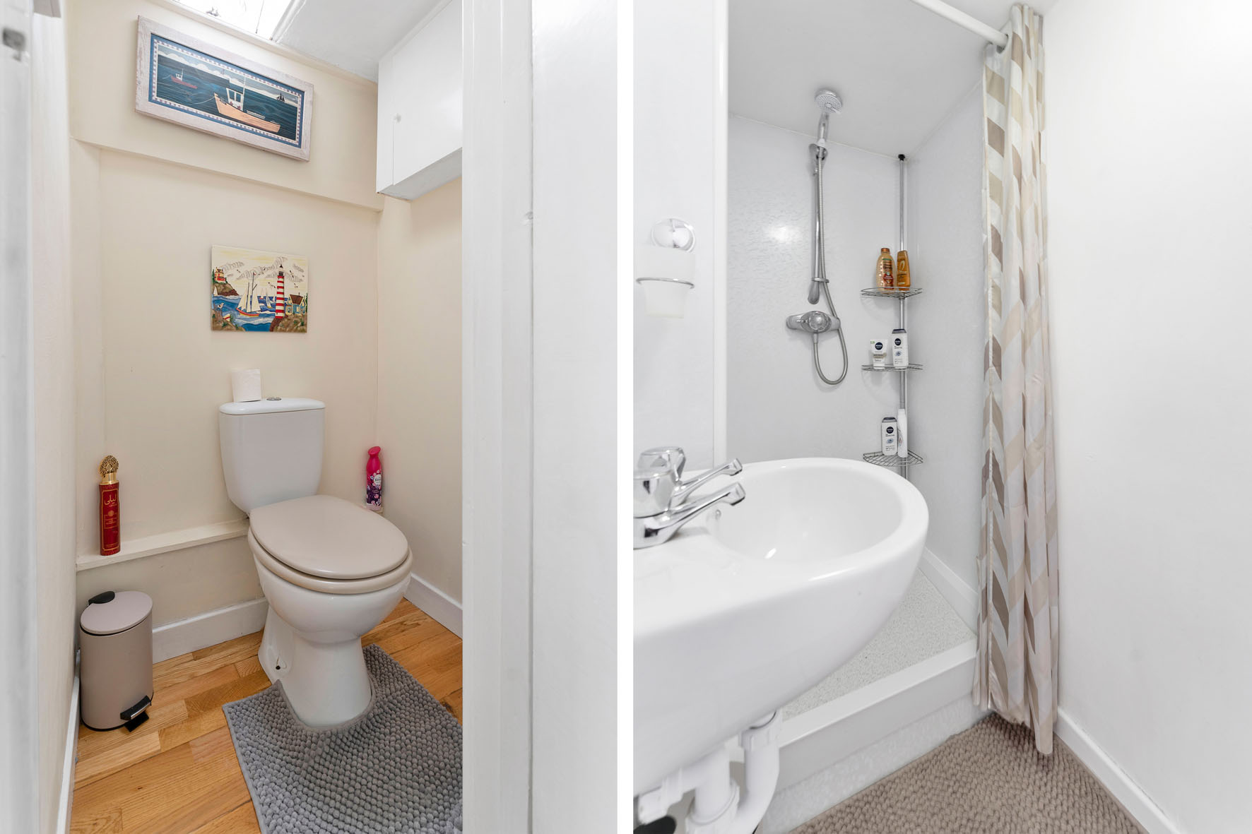 A neatly appointed shower room and separate naturally-lit WC complete the accommodation, featuring a modern white suite and practical fittings.