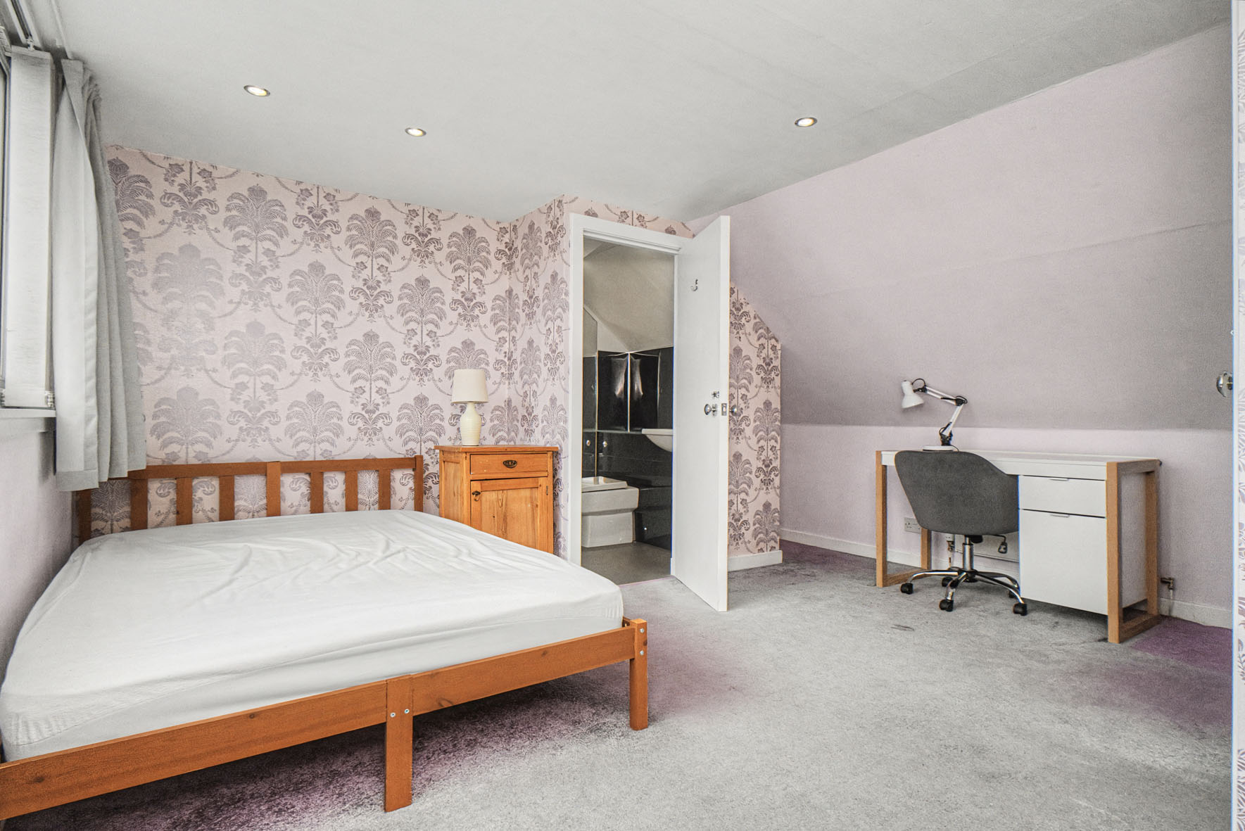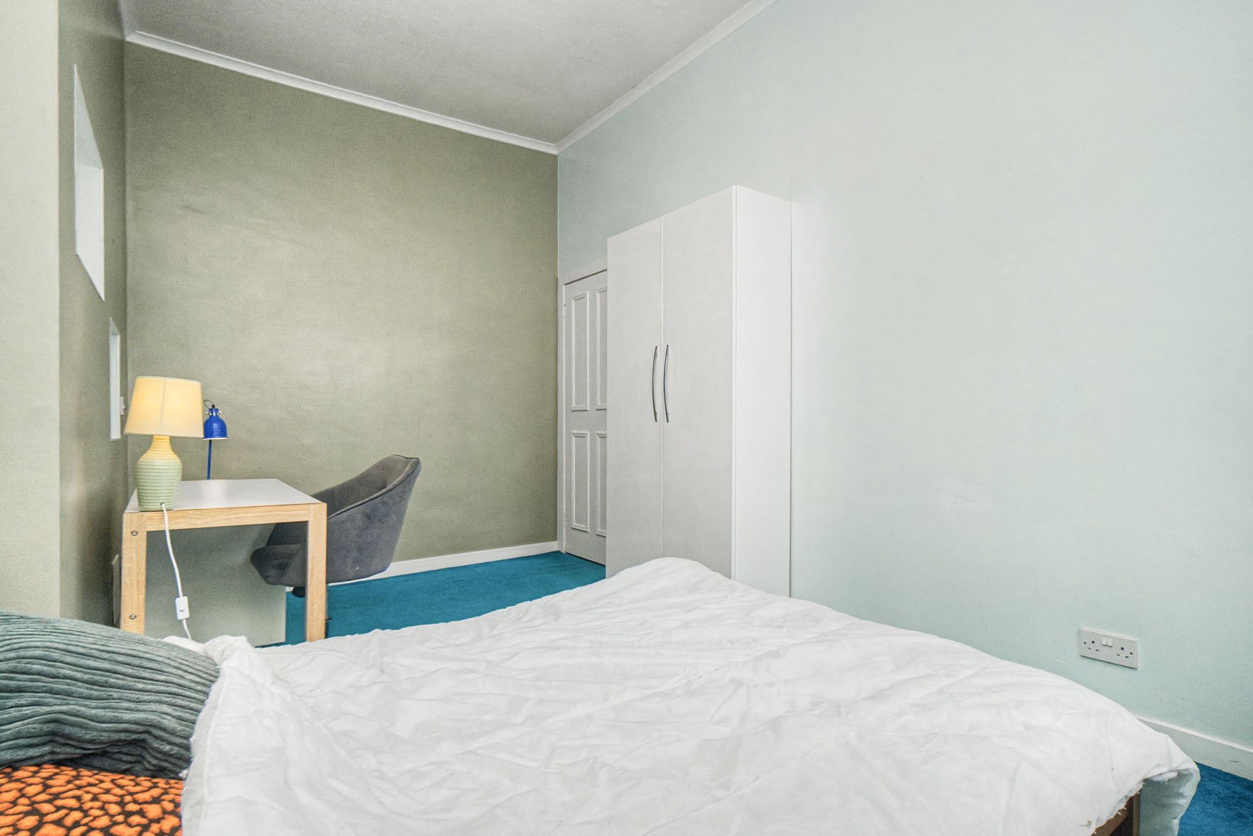 Meanwhile, the two bedrooms are both large doubles with soft carpets and modern decoration, each pairing a neutral backdrop with tasteful accent walls.