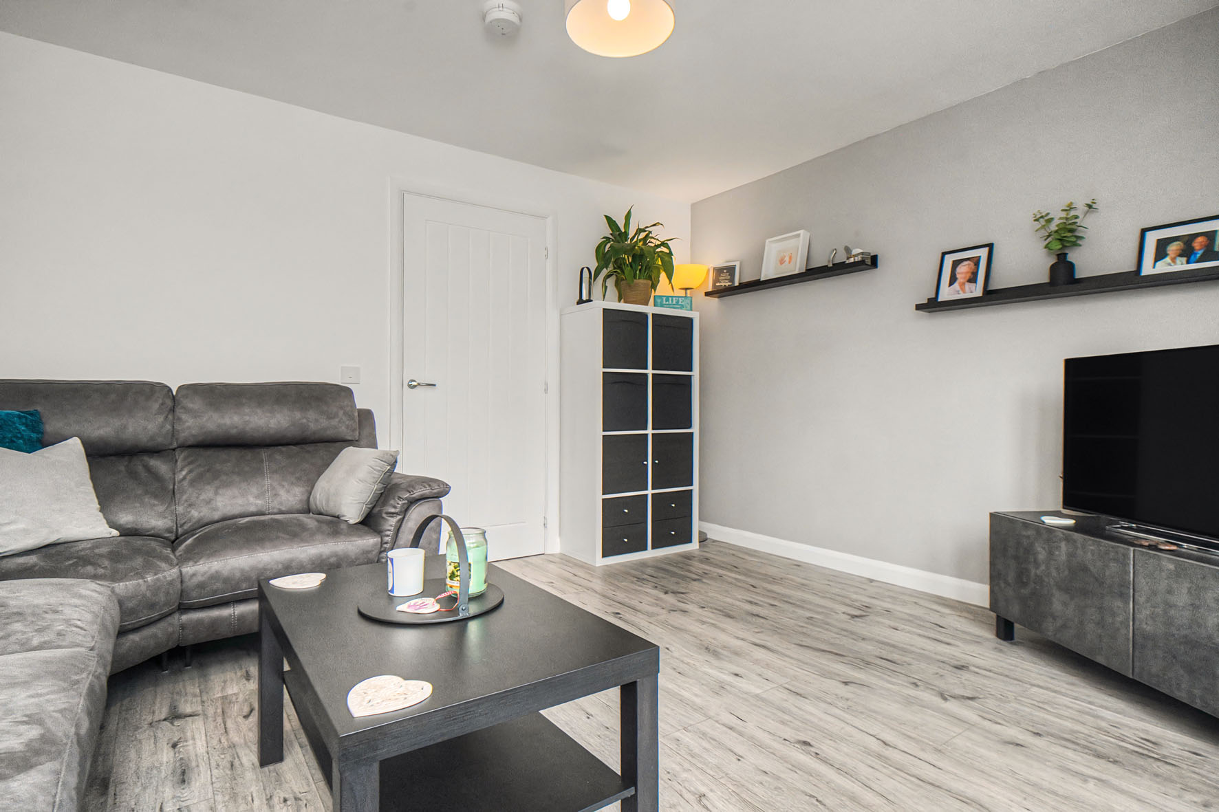 Stepping inside, you are greeted by a hall offering a lovely first impression with its neutral décor and premium wood-textured floor – desirable styling found throughout the ground level. It provides built-in storage and a WC before leading directly into the living/dining room.