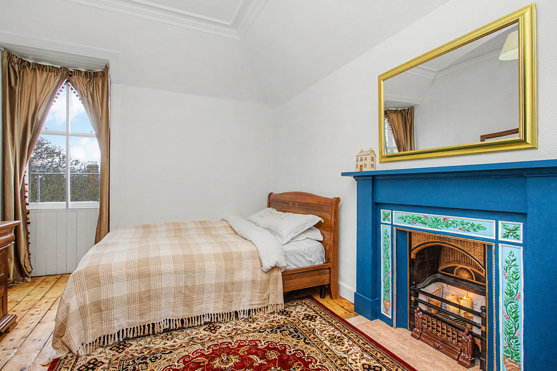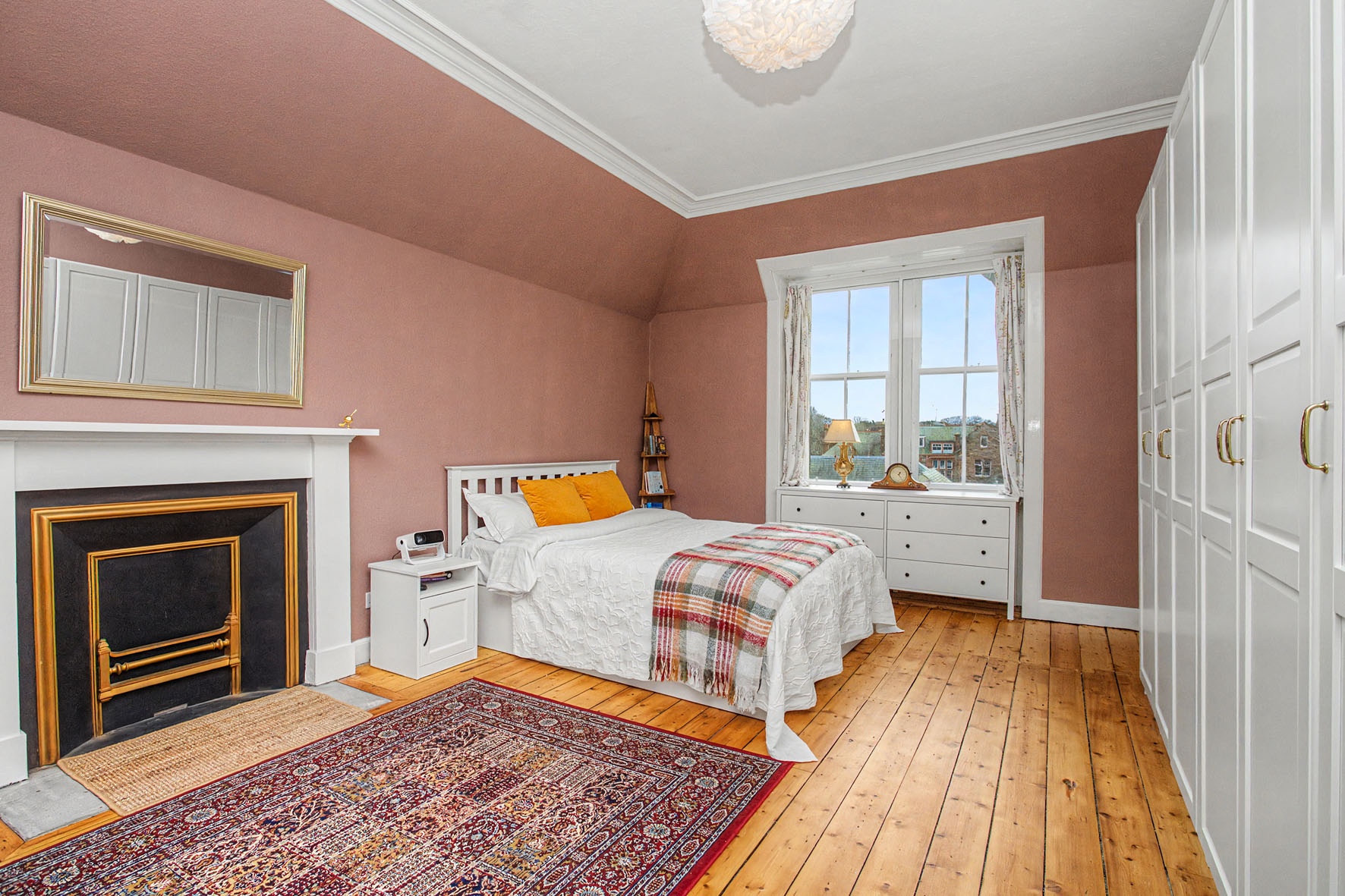 Meanwhile, the three double bedrooms all enjoy attractive décor and wooden floorboards. The south-facing principal bedroom boasts a very large footprint, as well as built-in storage and a feature fireplace.