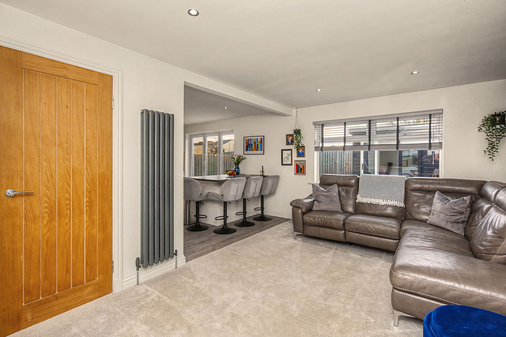 A practical enclosed porch leads into an entrance hall with a WC cloakroom, ideal for everyday use and guests alike. The ground floor is thoughtfully designed for modern family life and entertaining, with a spacious, comfortably carpeted living/dining room flowing openly into the kitchen. This sociable space is filled with all-day sun and connects seamlessly to the rear garden.