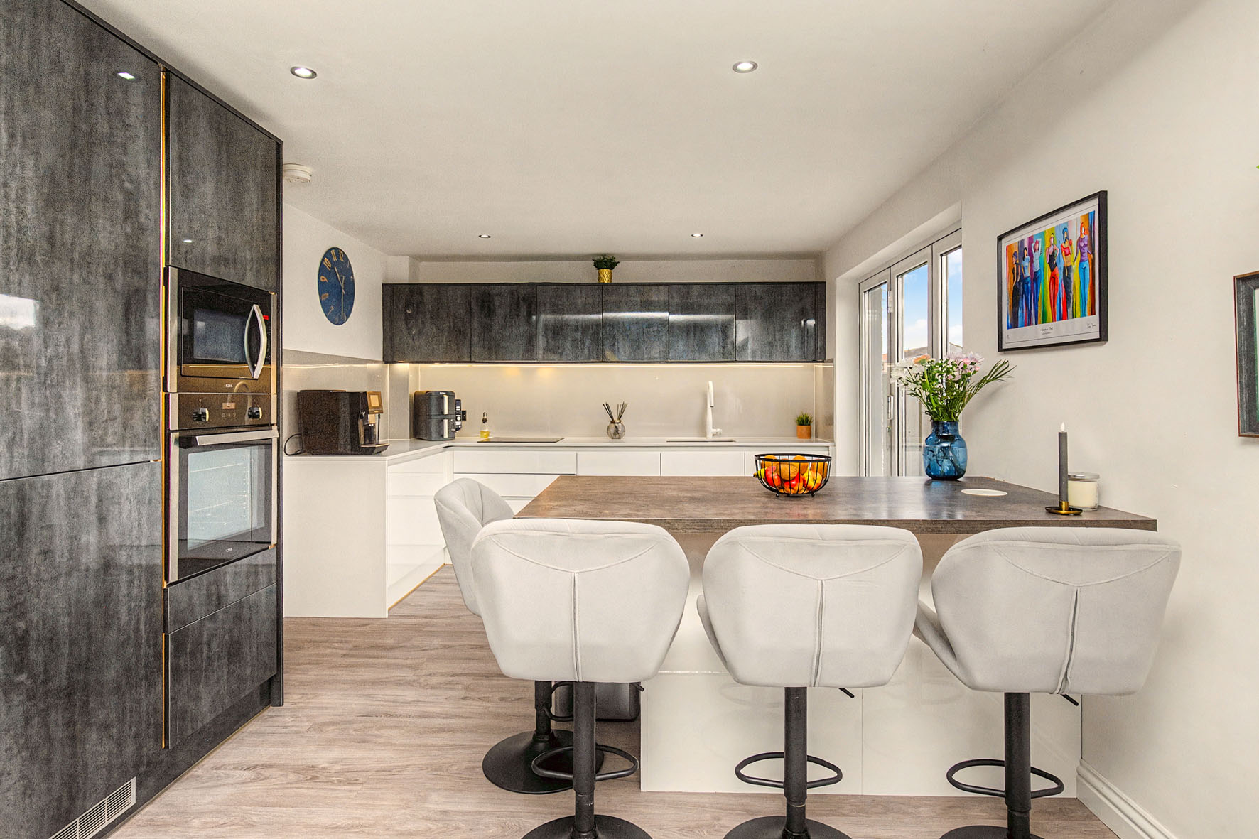 Centred around a breakfasting peninsula, the kitchen is exceptionally stylish and well equipped, finished in contrasting white, stone, and oak-effect tones, with sleek gloss cabinetry, illuminated workspace, and an integrated induction hob, raised oven and microwave, fridge freezer, wine fridge, dishwasher, and washing machine.