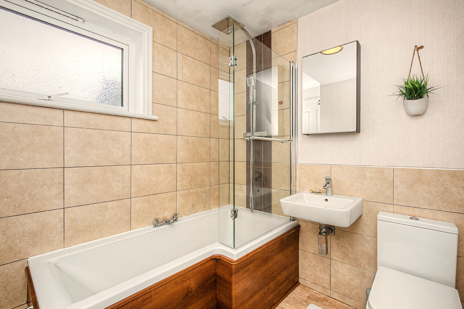 Completing the first floor is a bright, contemporary bathroom featuring a WC suite and an L-shaped bath with an overhead rainfall shower, framed by neutral large-format tiling.