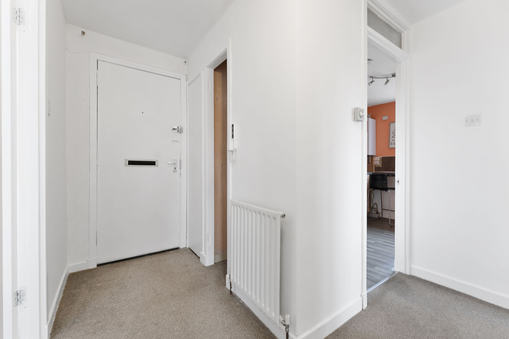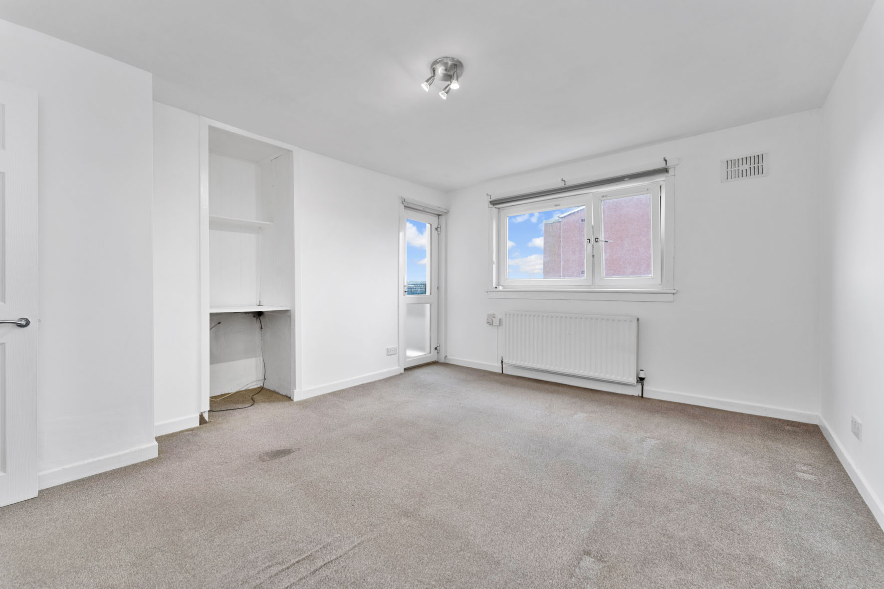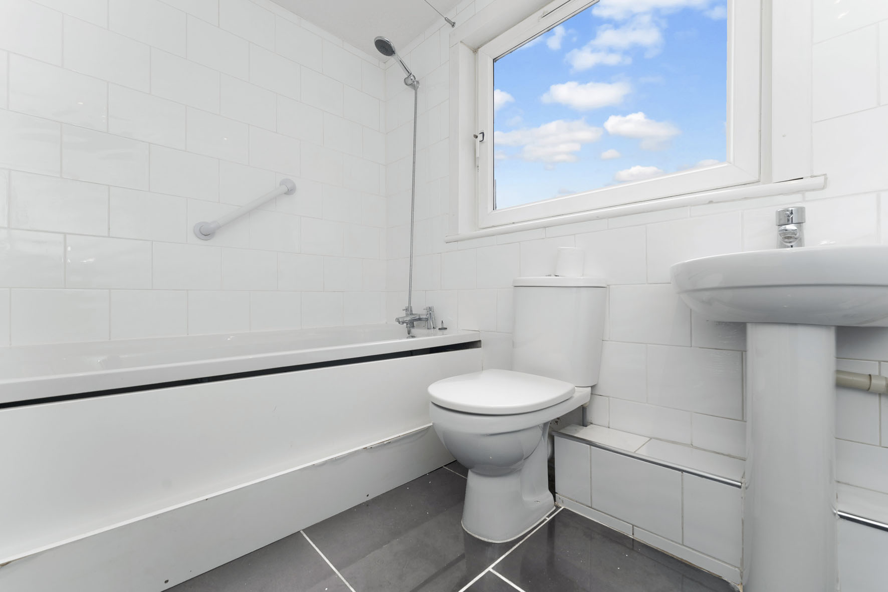 Overlooking the balcony, the comfortably carpeted double bedroom benefits from square proportions and built-in storage, whilst the bright bathroom is simply styled in all-white with a shower-over-bath, WC, and basin.