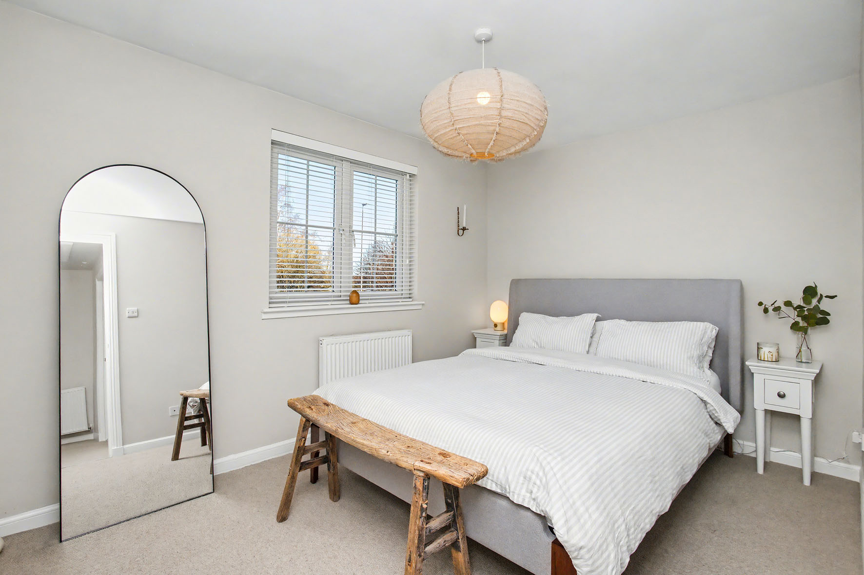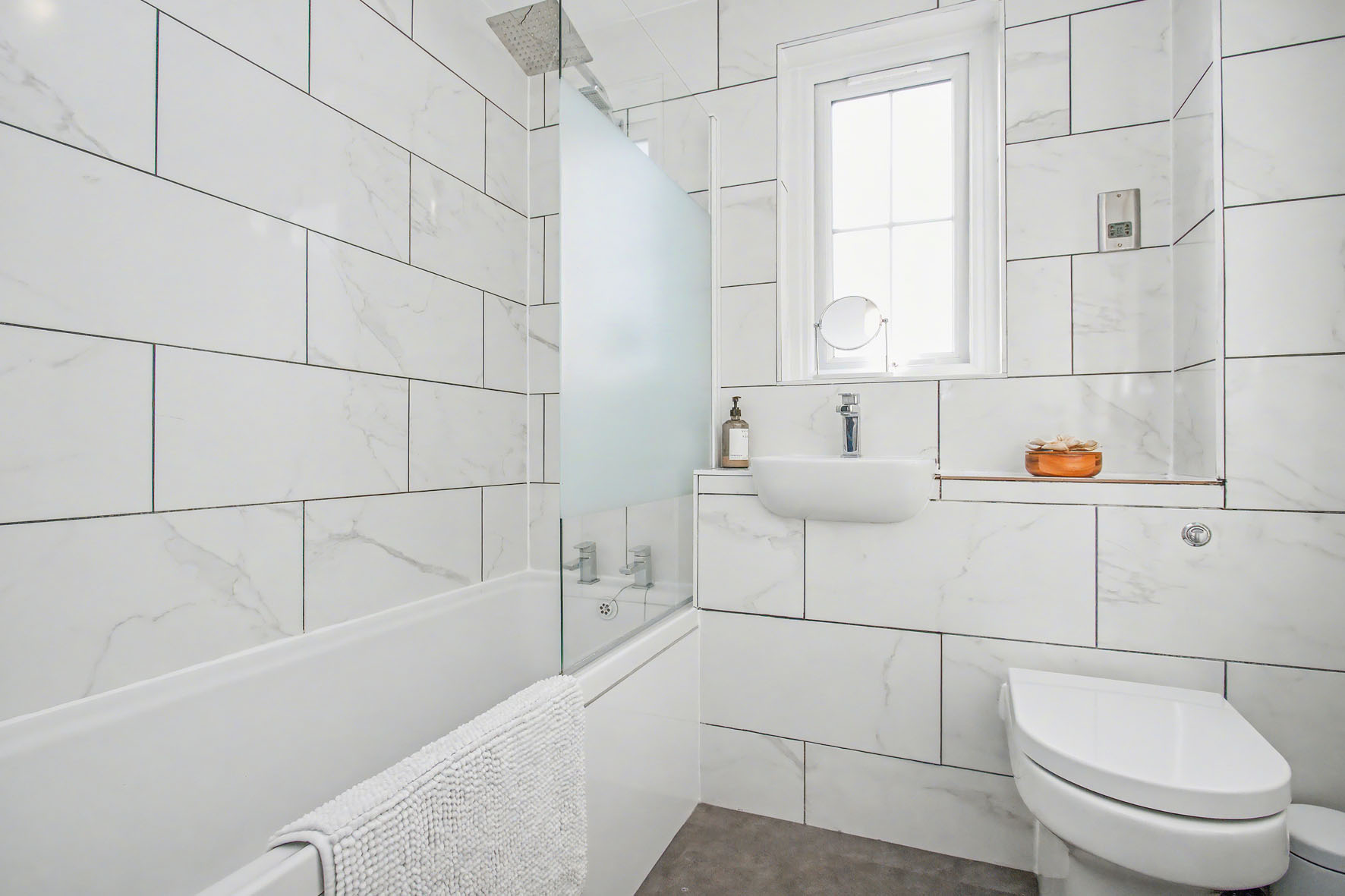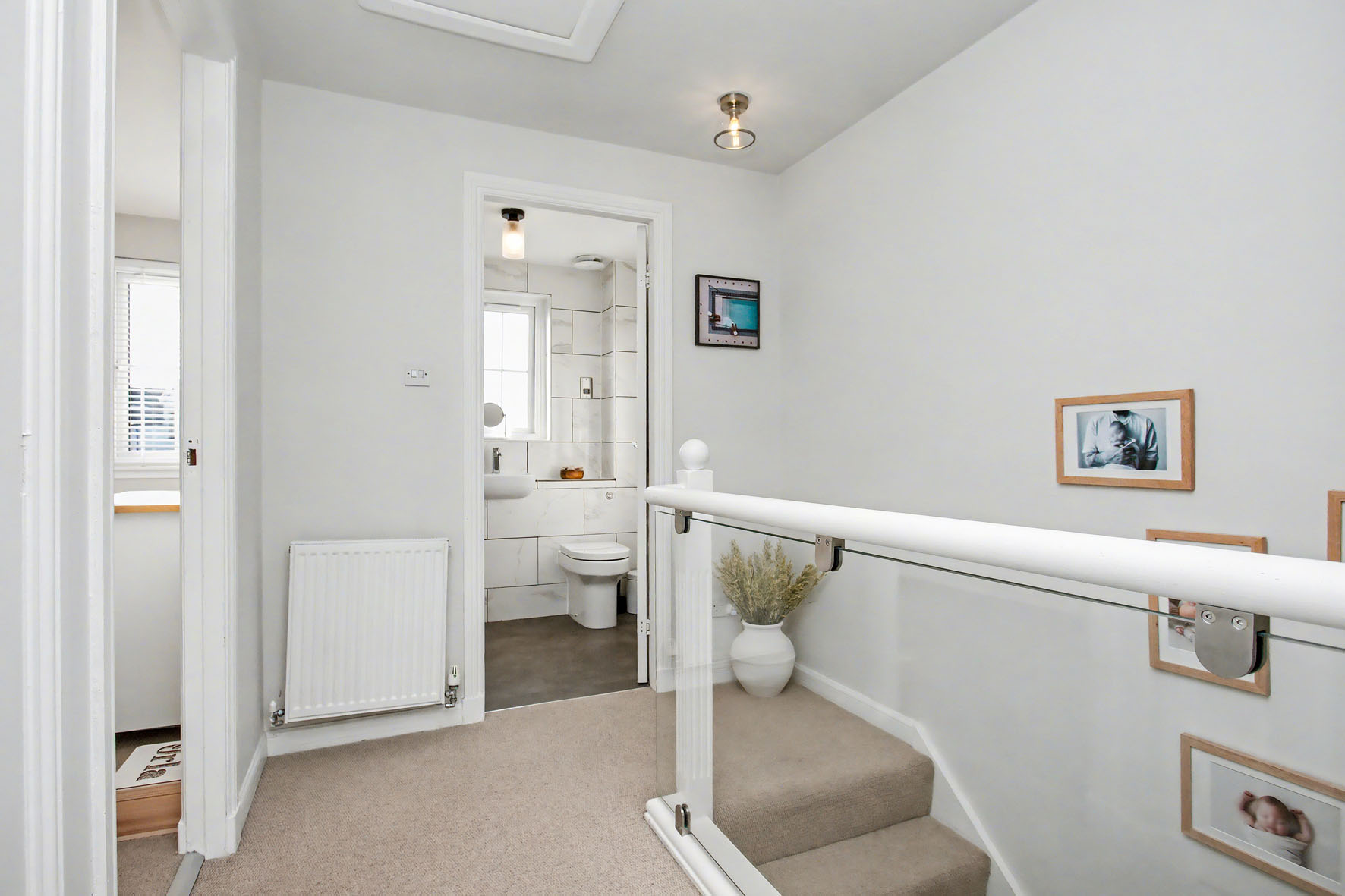 A bright bathroom completes the accommodation, mirroring the tiled finish of the downstairs WC and featuring a bath with an overhead rainfall shower.