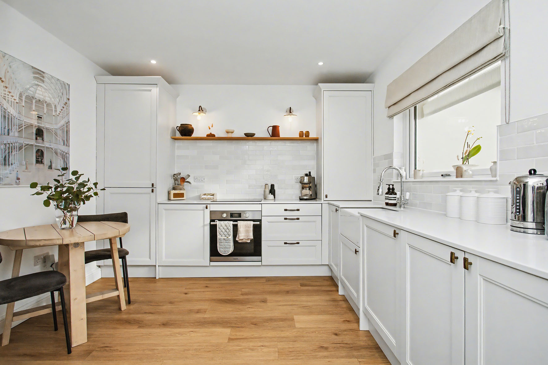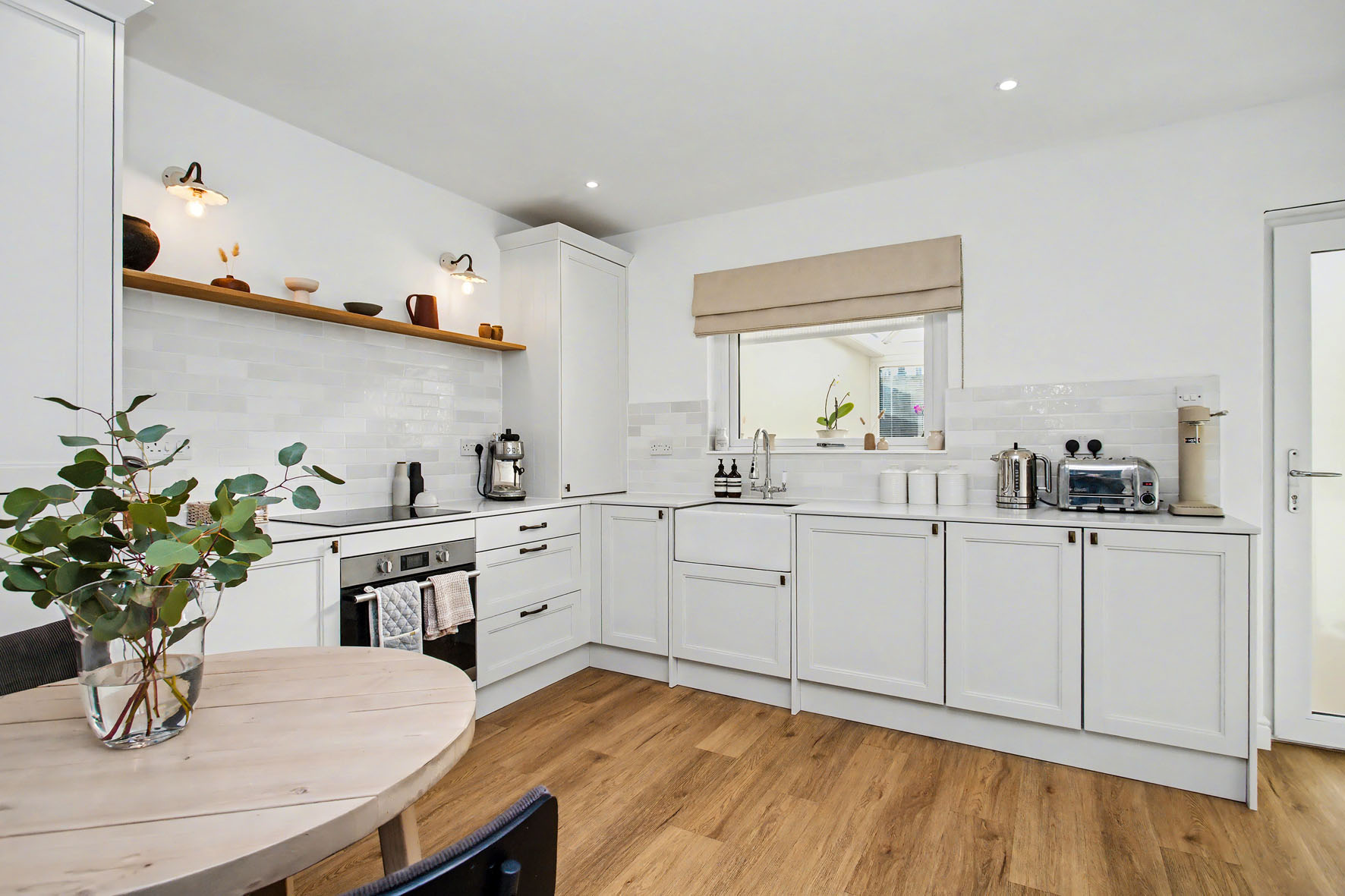 The kitchen has a classic shaker-style design in light beige, complemented by subway tiling and a deep Belfast sink. Neatly integrated appliances include an oven, induction hob, washing machine, and fridge freezer, while space for seated dining enhances the relaxed, sociable feel.