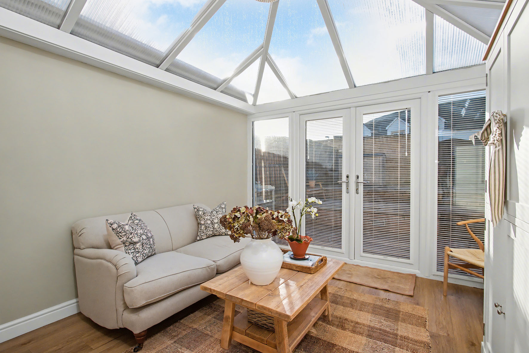 The light-filled living room connects directly to the dining kitchen, which in turn leads into a versatile, south-facing conservatory opening onto the garden — a well-considered layout for everyday living and easy entertaining.