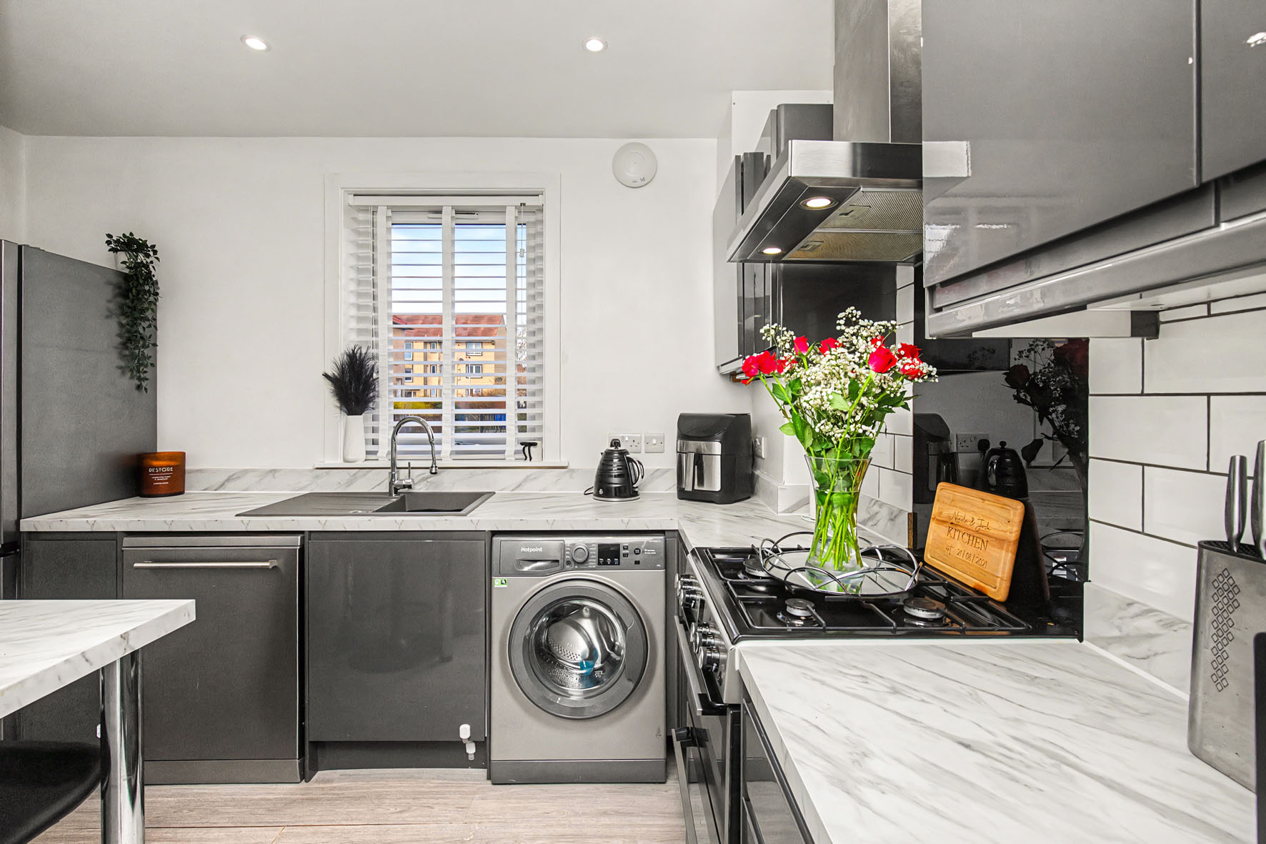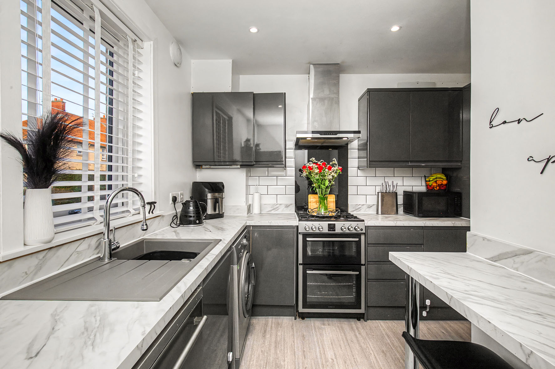 Next door, the kitchen also benefits from excellent natural light and is stylishly appointed with glossy charcoal-grey cabinets, a subway-tiled splashback, and illuminated marble-effect worktops, plus a breakfast seating bar. Freestanding appliances with a matching metallic finish include a gas cooker (with a fitted hood), a tall fridge freezer, a washing machine, and a dishwasher.