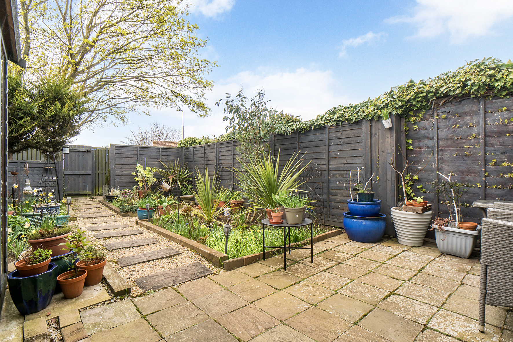 Outside, the enclosed south-facing rear garden has been neatly landscaped for ease of maintenance, with a paved seating area, planted beds, and a delightful summer house.