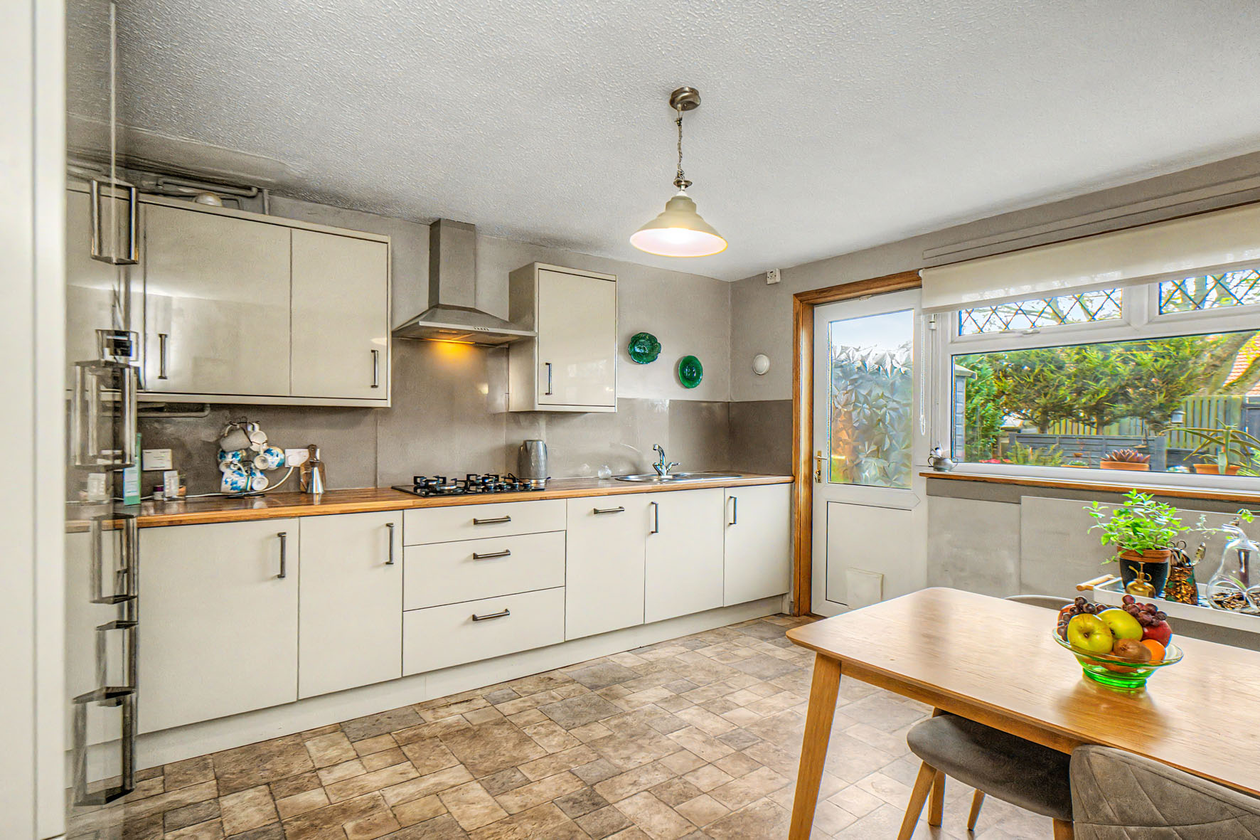 To the rear, the spacious dining kitchen spans the width of the home and provides an excellent social hub with space for a table and chairs alongside sleek cream-coloured cabinets and wood-inspired worktops. Integrated appliances add convenience, whilst a glazed door opens directly onto the garden.