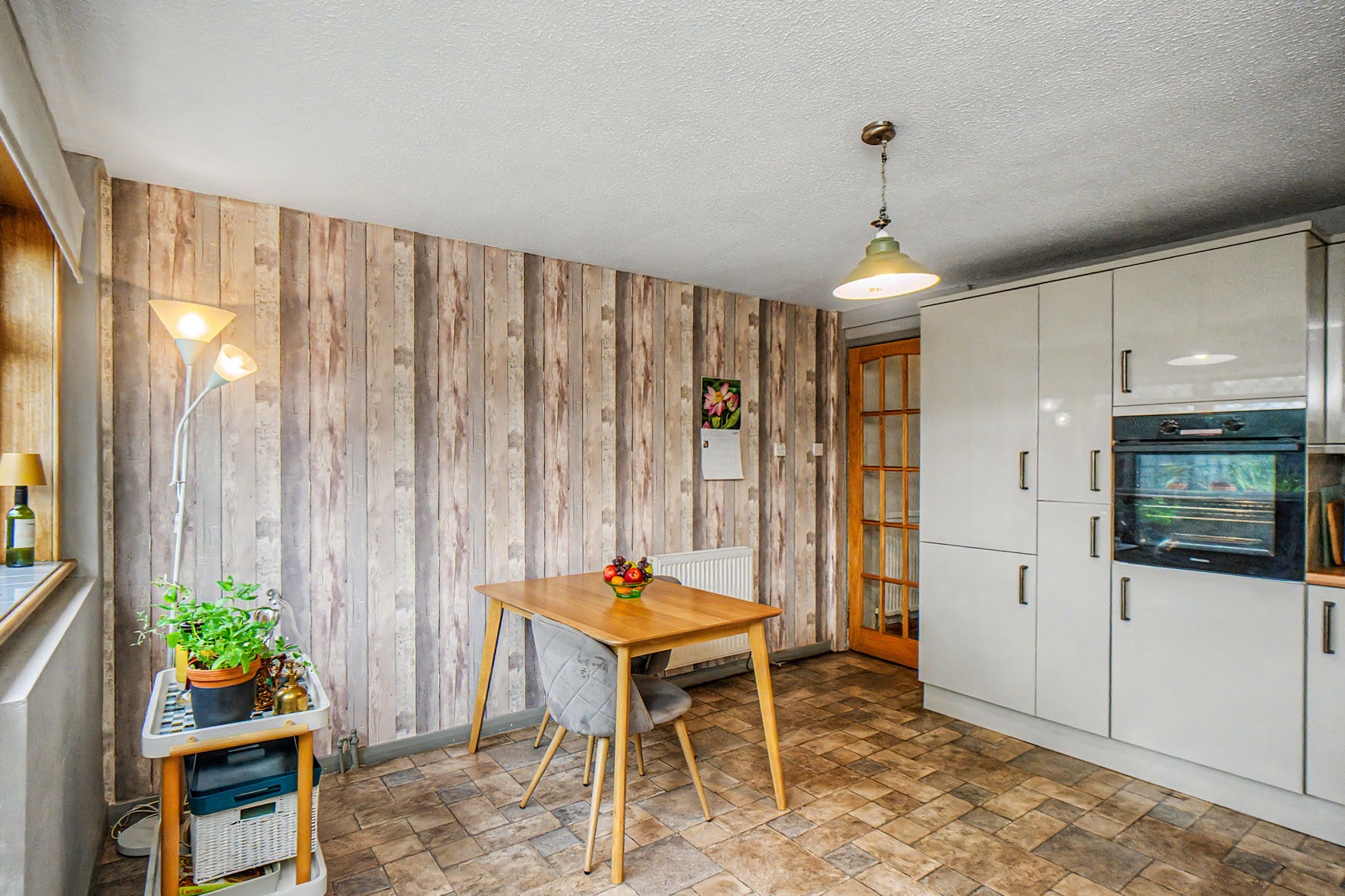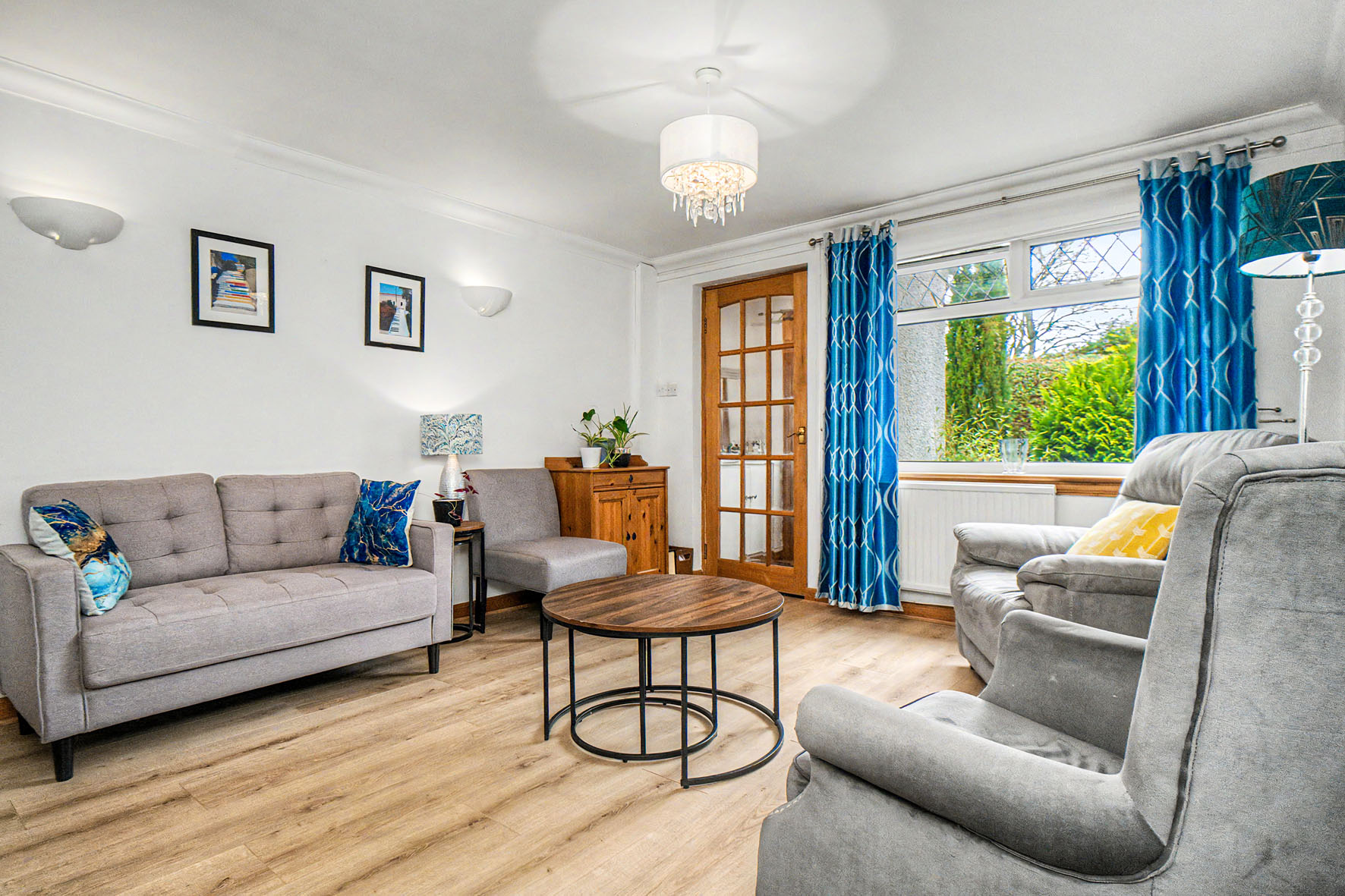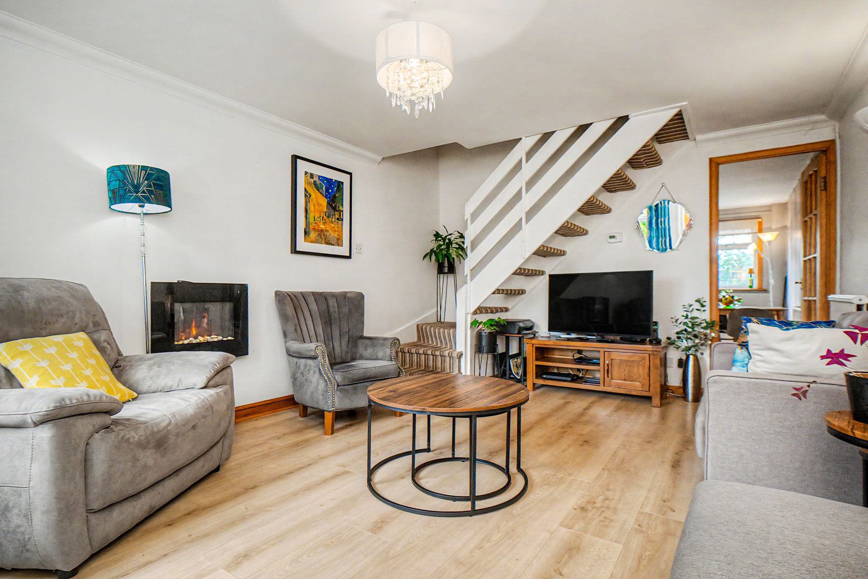 The front door opens into a practical entrance porch leading into a generously proportioned living room. Finished with soft neutral décor and wood-toned flooring, this inviting reception space offers plenty of room for comfortable seating and enjoys a bright front-facing position.