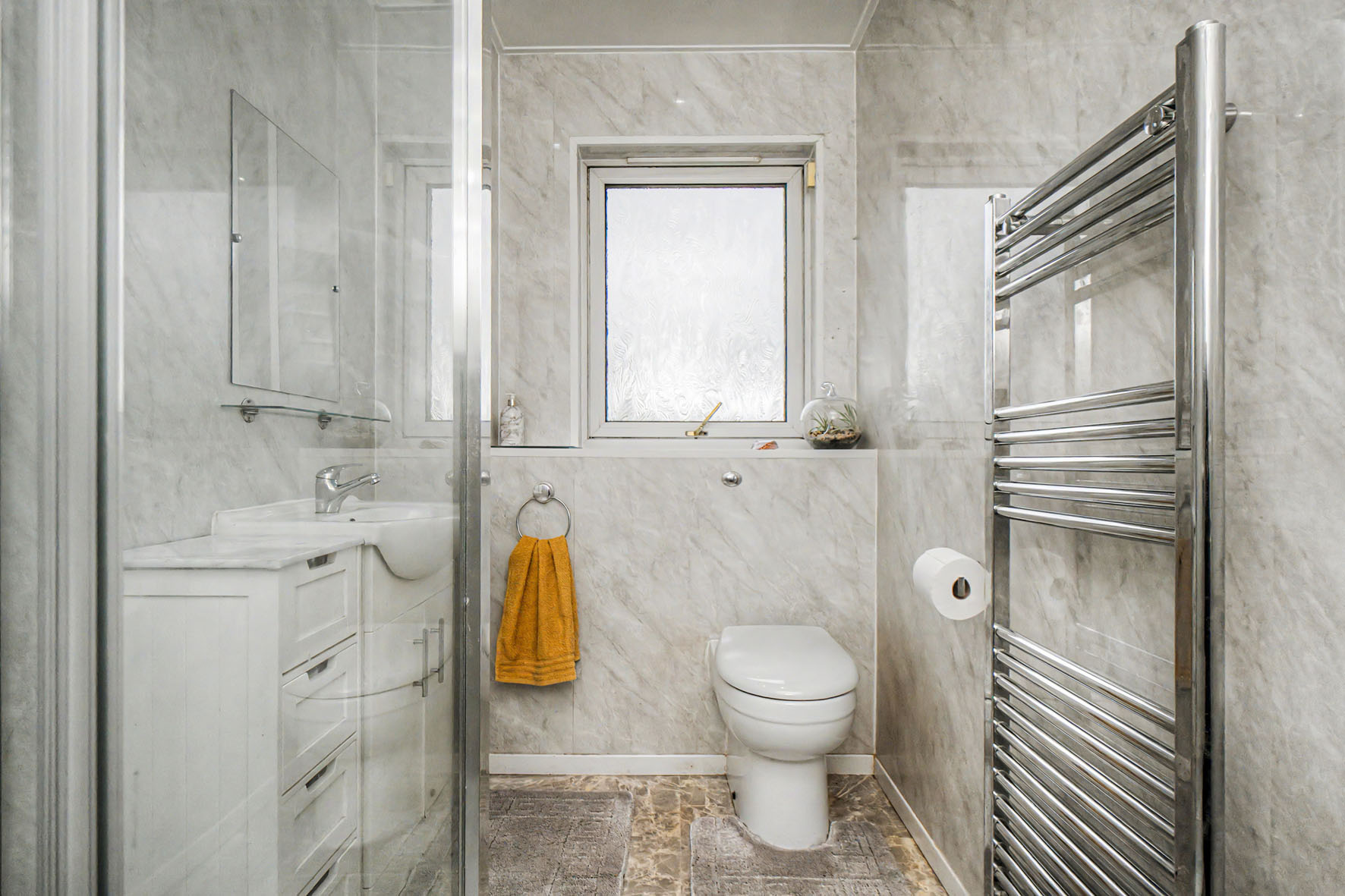 Completing the accommodation is a bright contemporary shower room fitted with a WC-suite, vanity storage, a towel radiator, and a walk-in shower enclosure.