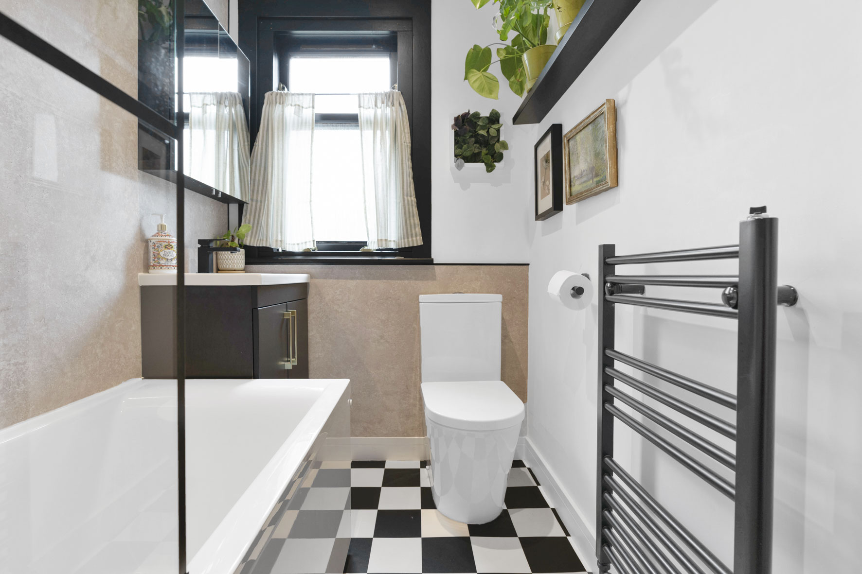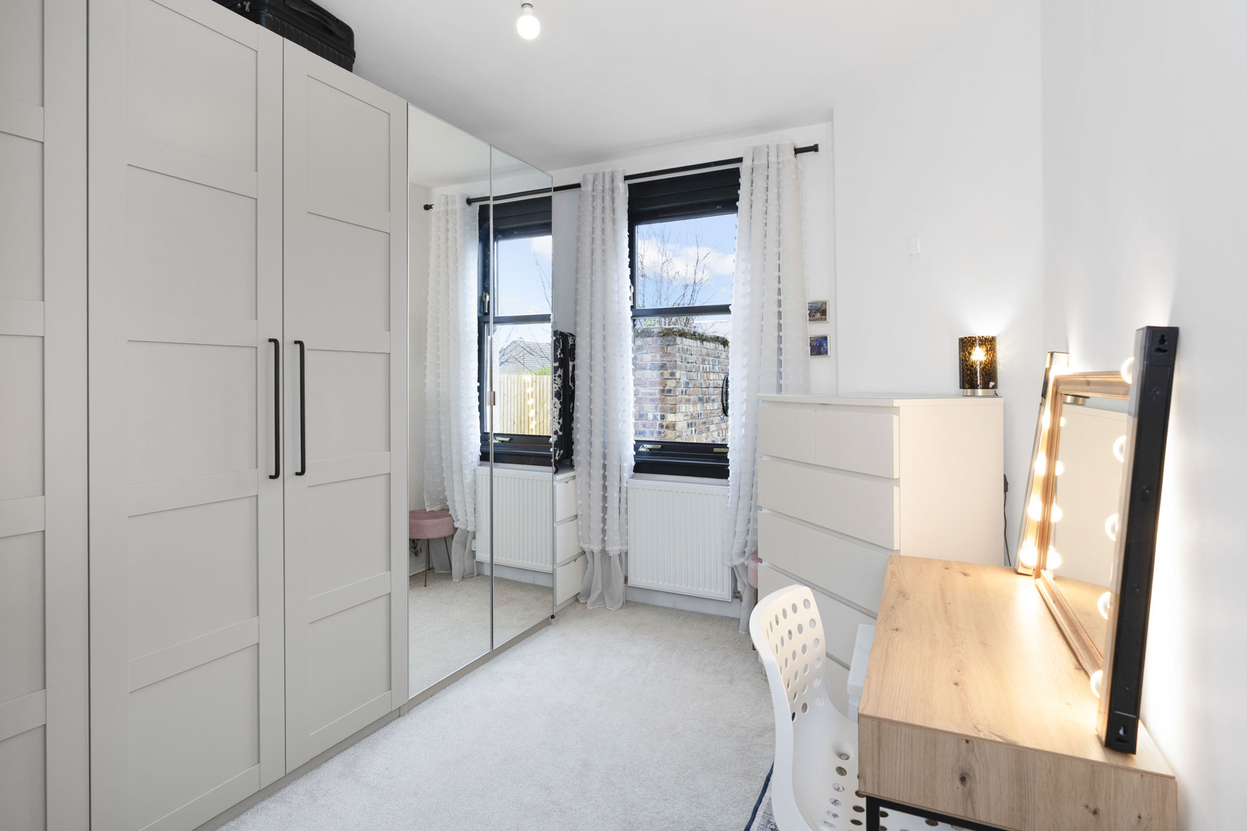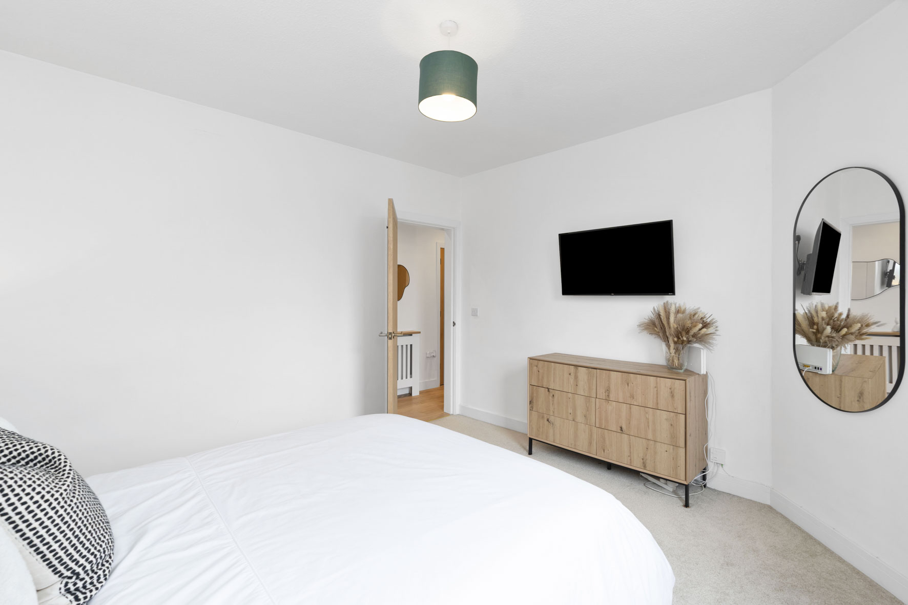 The two double bedrooms off the hall both enjoy a sunny rear garden outlook, soft carpeting for added comfort, and calm neutral décor. Completing the home, and also accessed from the hall, is a bright and stylish bathroom with a shower-over-bath and vanity storage, enhanced by on-trend black accents and a classic chequered floor. Gas central heating and double glazing ensure year-round comfort and efficiency.