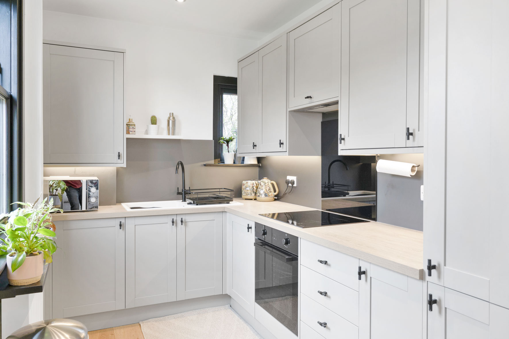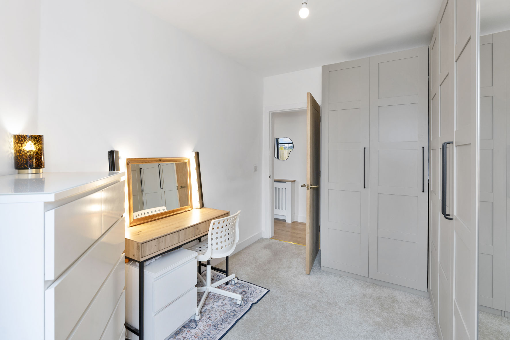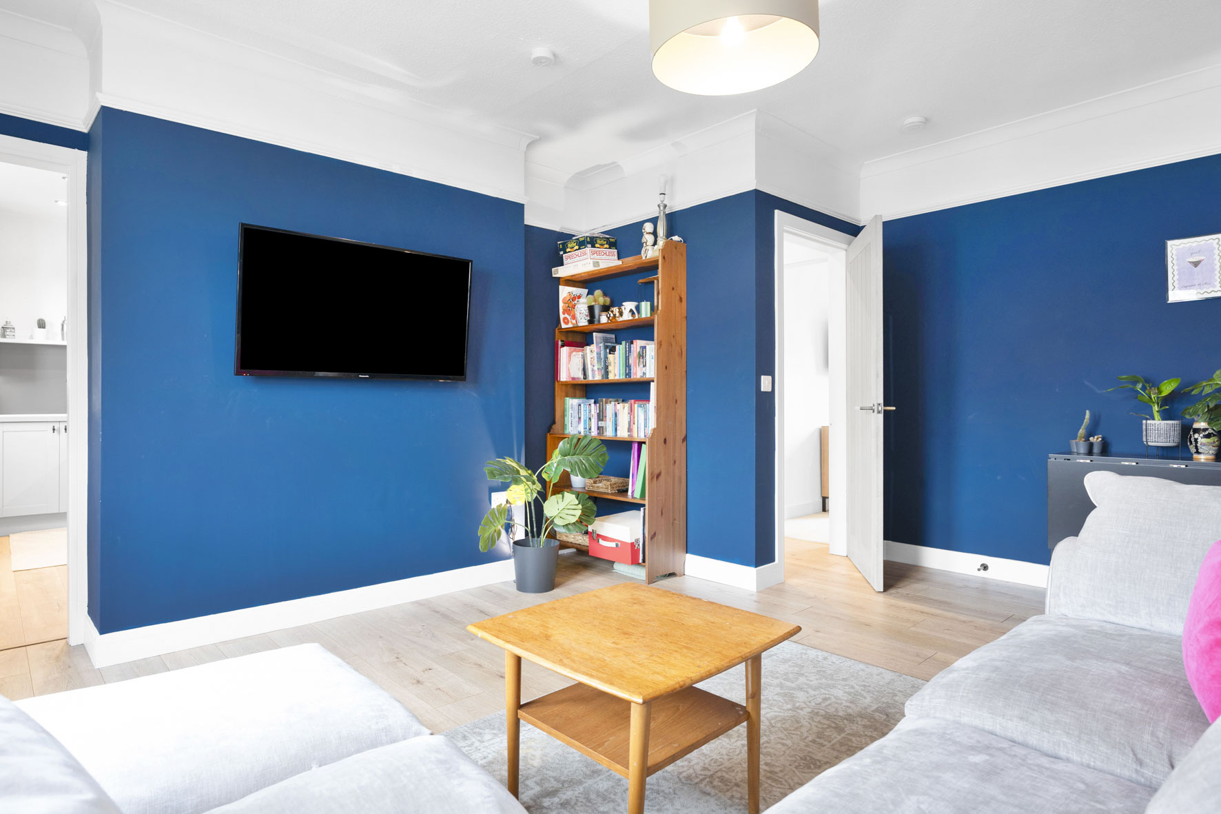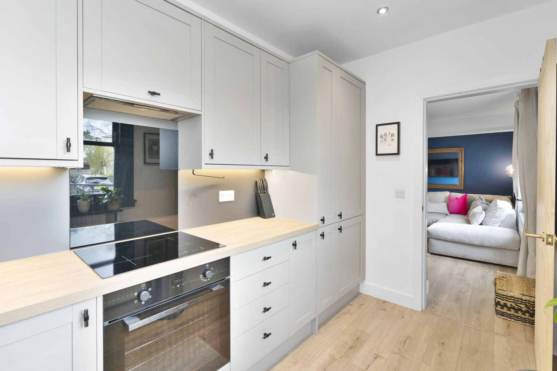 The side front door opens into a vestibule and adjoining hall, both providing useful storage. The hall is neutrally presented with durable wood-toned flooring that flows seamlessly into the reception room and kitchen. The light-filled reception room, with a spacious, flexible layout for relaxation and dining, is stylishly presented with striking deep-blue décor contrasted by crisp white detailing. It is an exceptionally convivial space, with convenient and sociable access to the kitchen. The immaculate modern kitchen is tastefully appointed in a classically inspired soft taupe design and benefits from a dual-aspect, welcoming excellent natural light. Fully integrated appliances include an induction hob, oven, fridge freezer, and washing machine, while wood-toned worktops with under-cabinet lighting add practicality.