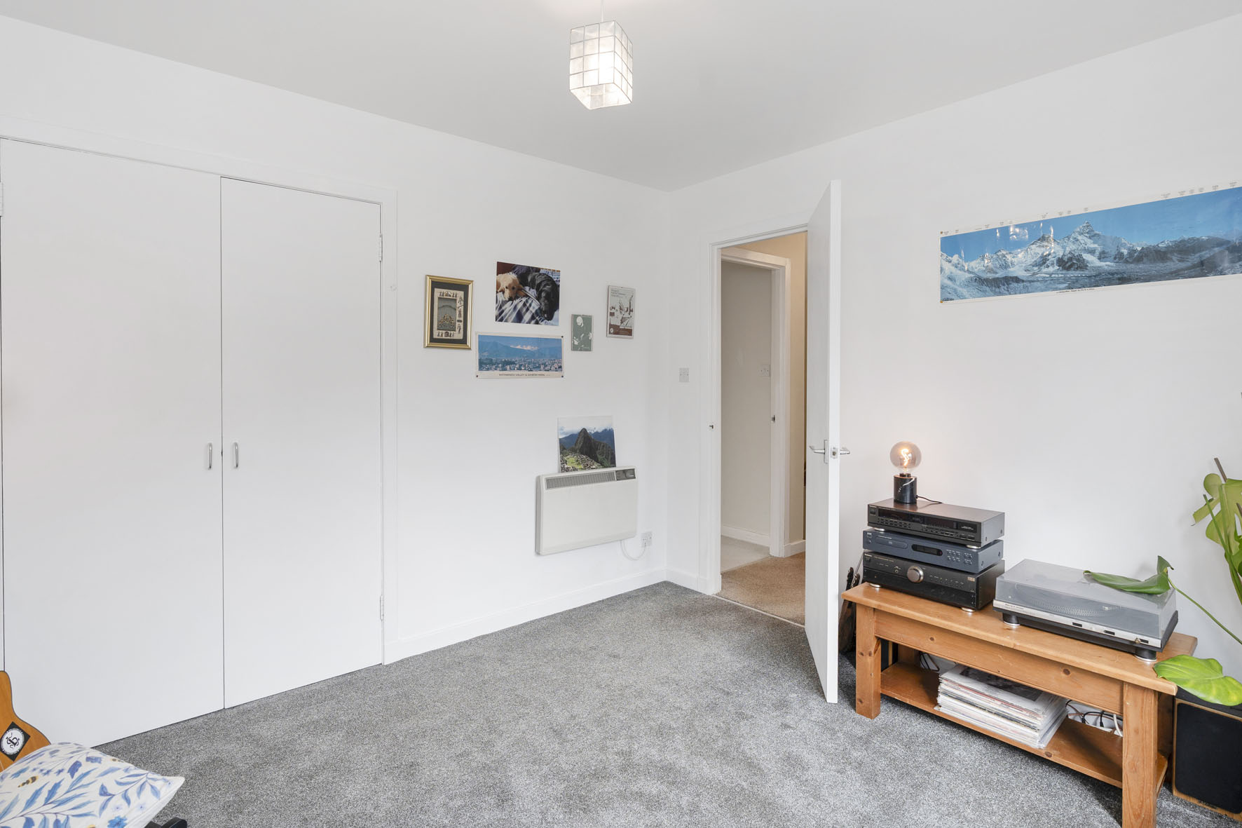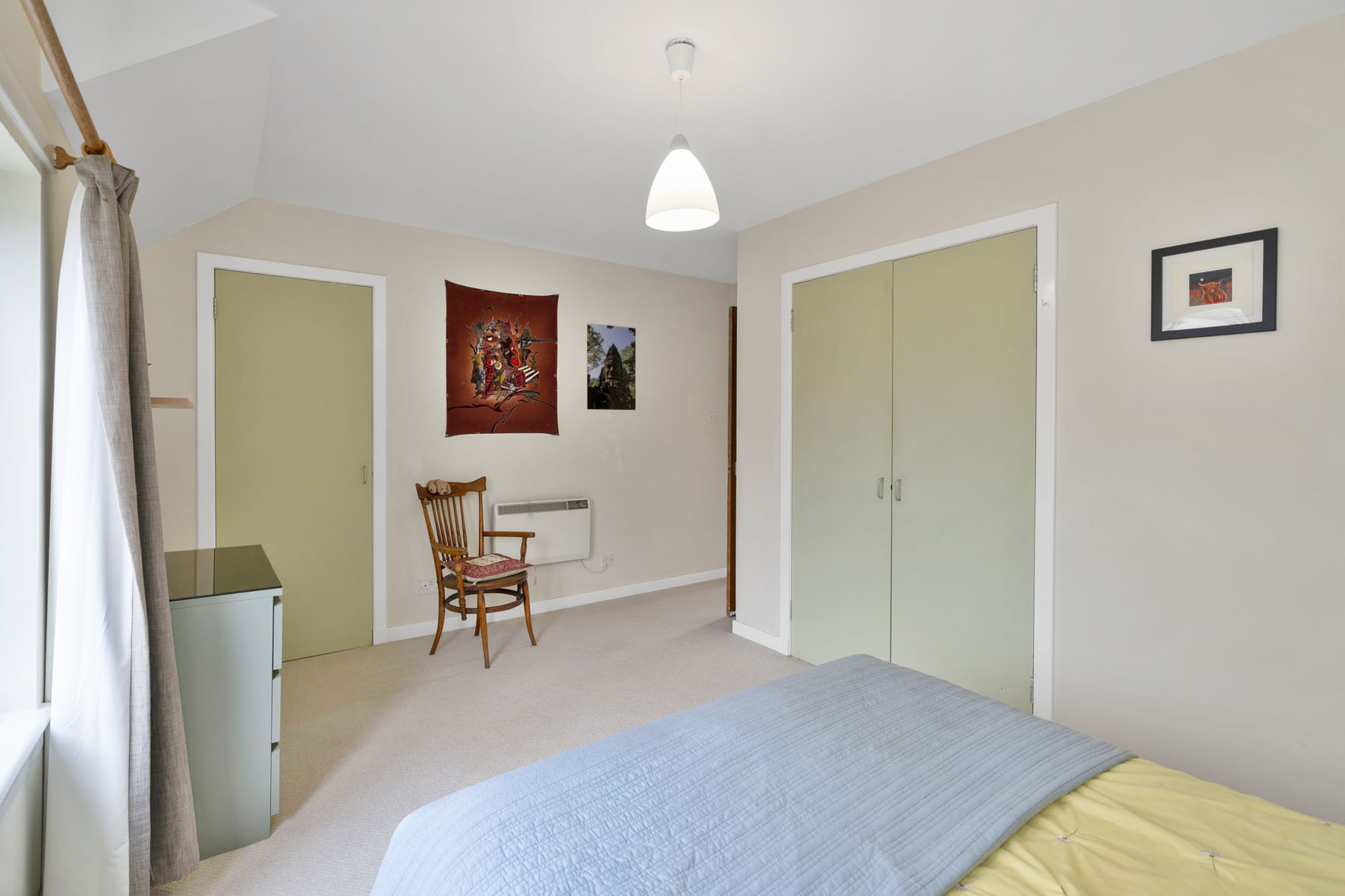 On the first floor, a landing leads to two softly carpeted double bedrooms, both equipped with fitted wardrobes. The principal bedroom stretches across the front projection and benefits from additional cupboard storage.