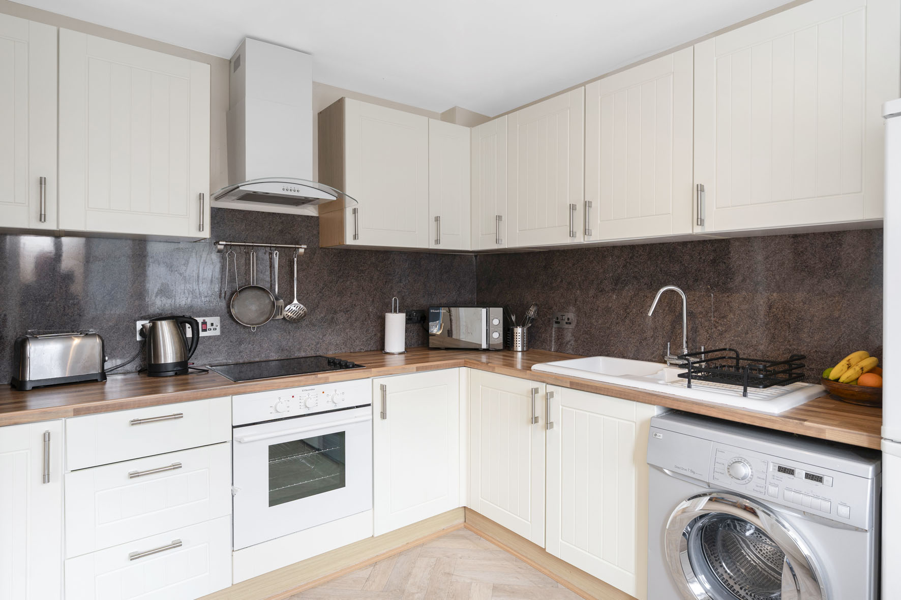 The sun-filled breakfasting kitchen also opens onto the garden and offers space for seating. It features a contemporary design in tasteful neutral and wood tones, including stylish herringbone-inspired flooring. An electric oven and hob with a feature hood are integrated, whilst an undercounter washing machine and tall fridge freezer are also included.