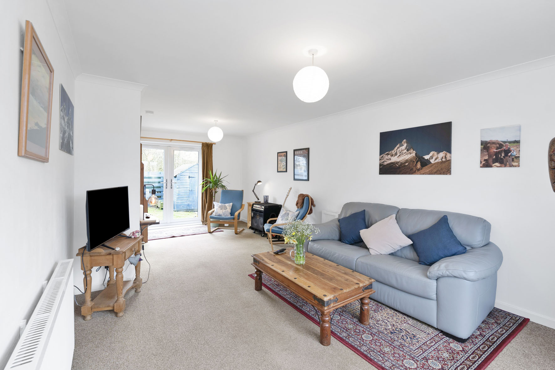 The naturally lit entrance hall houses practical storage and flows into the reception room, which spans the full depth of the house and enjoys a bright dual aspect, including French doors opening onto the garden. It is a comfortable carpeted space allowing flexible zones for relaxation and dining, with the added convenience of direct kitchen access.