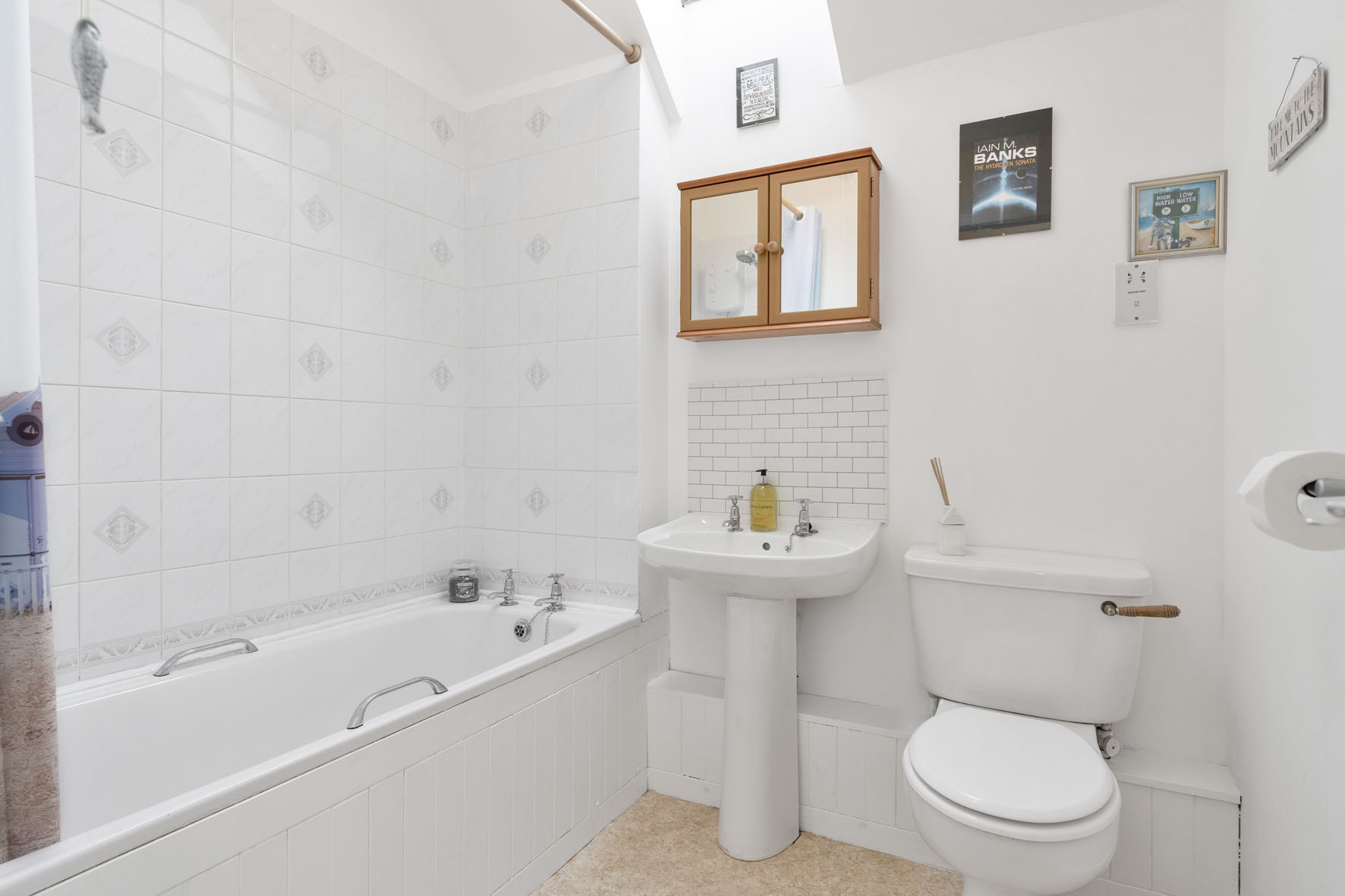 Also on this level is a simply styled bathroom, naturally lit by a skylight and fitted with a bath and overhead shower.