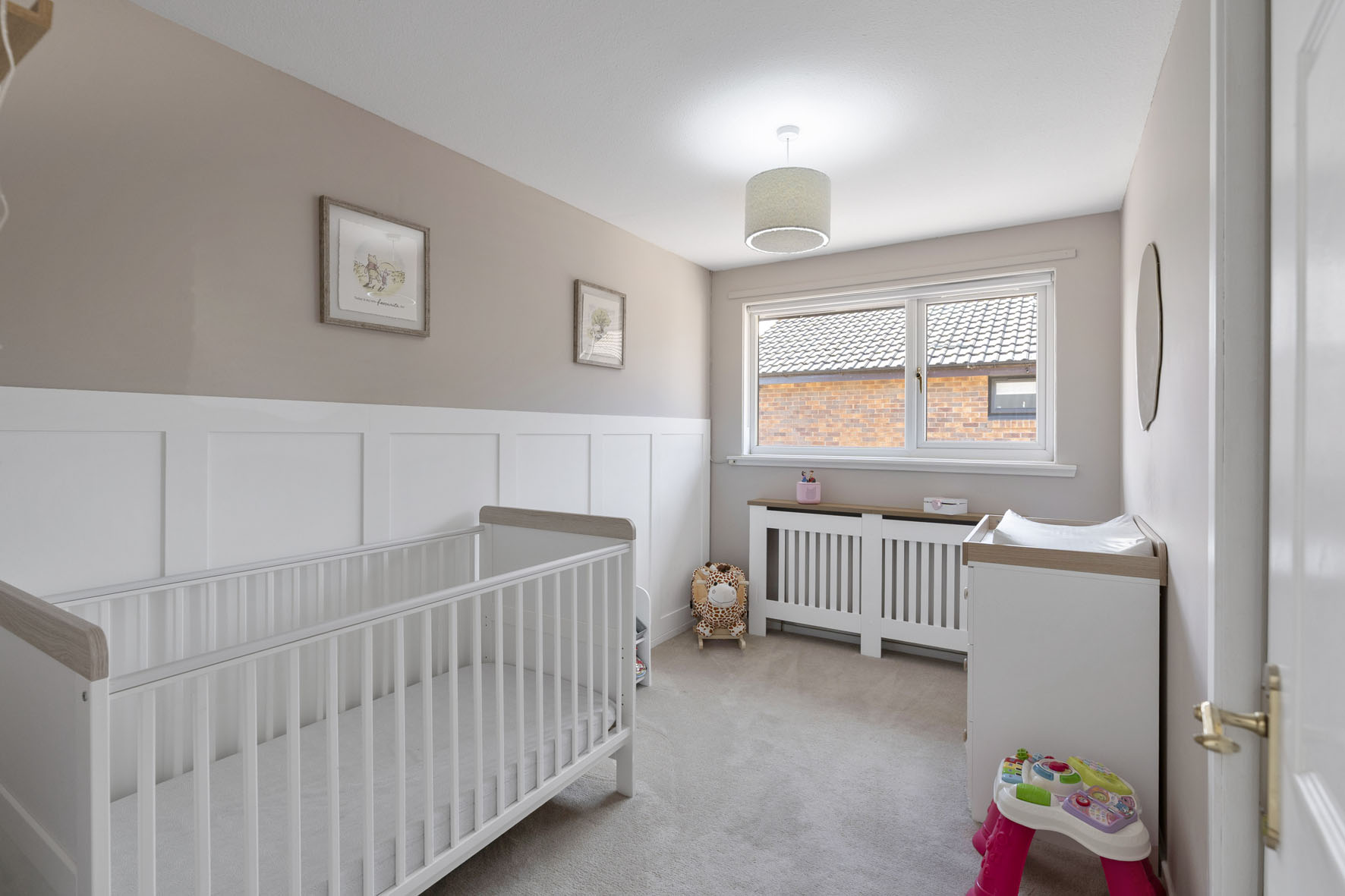 The principal bedroom is a particularly generous double with fitted storage and an en-suite WC. Two further bedrooms provide flexibility for family life, guests, or home working, with one currently arranged as a nursery and another as a study.