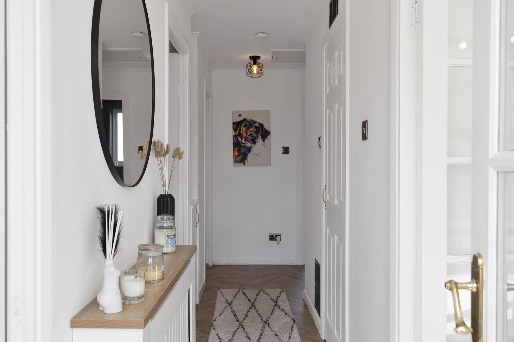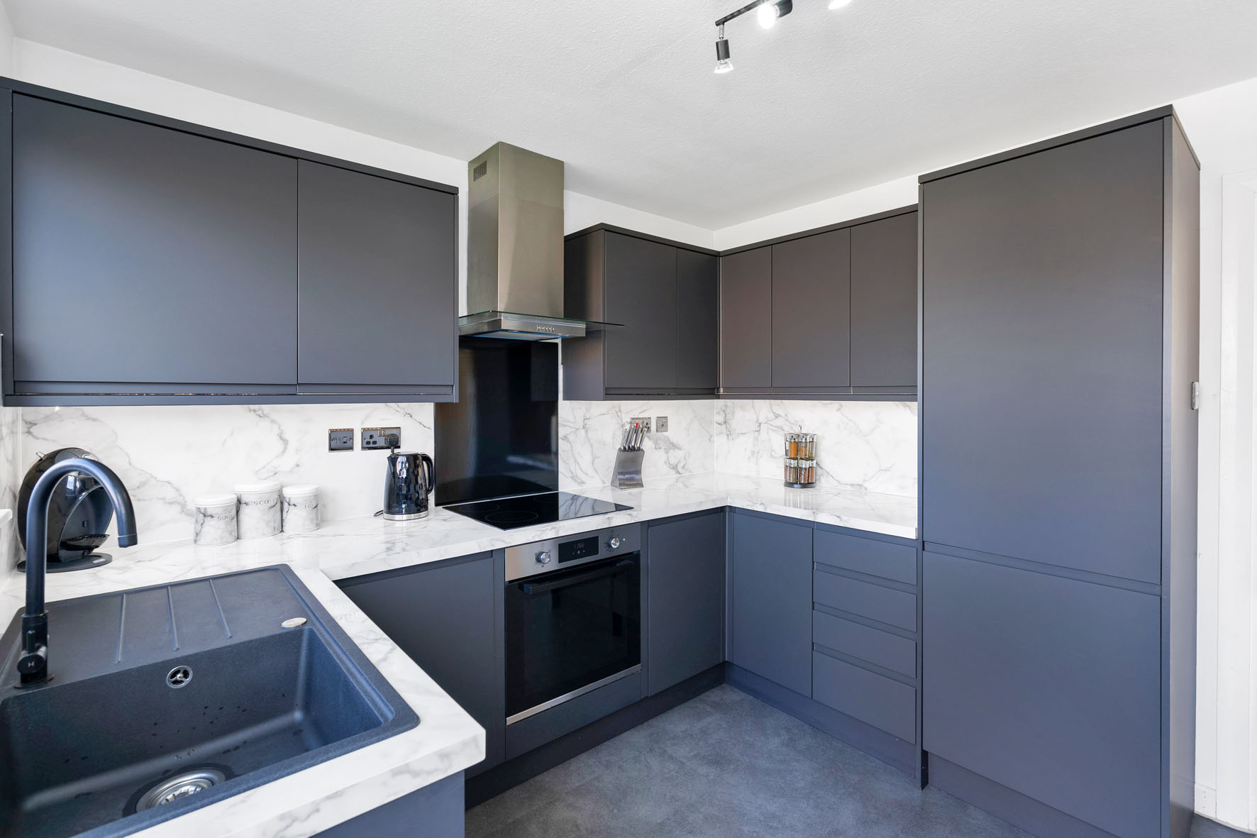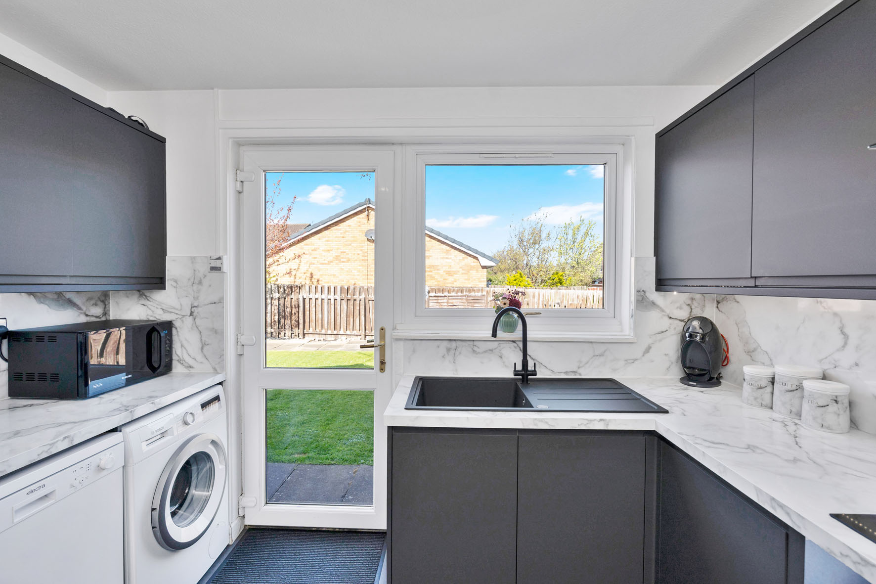 The adjoining kitchen has been stylishly upgraded with contemporary dark cabinetry, marble-inspired worktops, and integrated appliances, whilst a glazed door opens directly