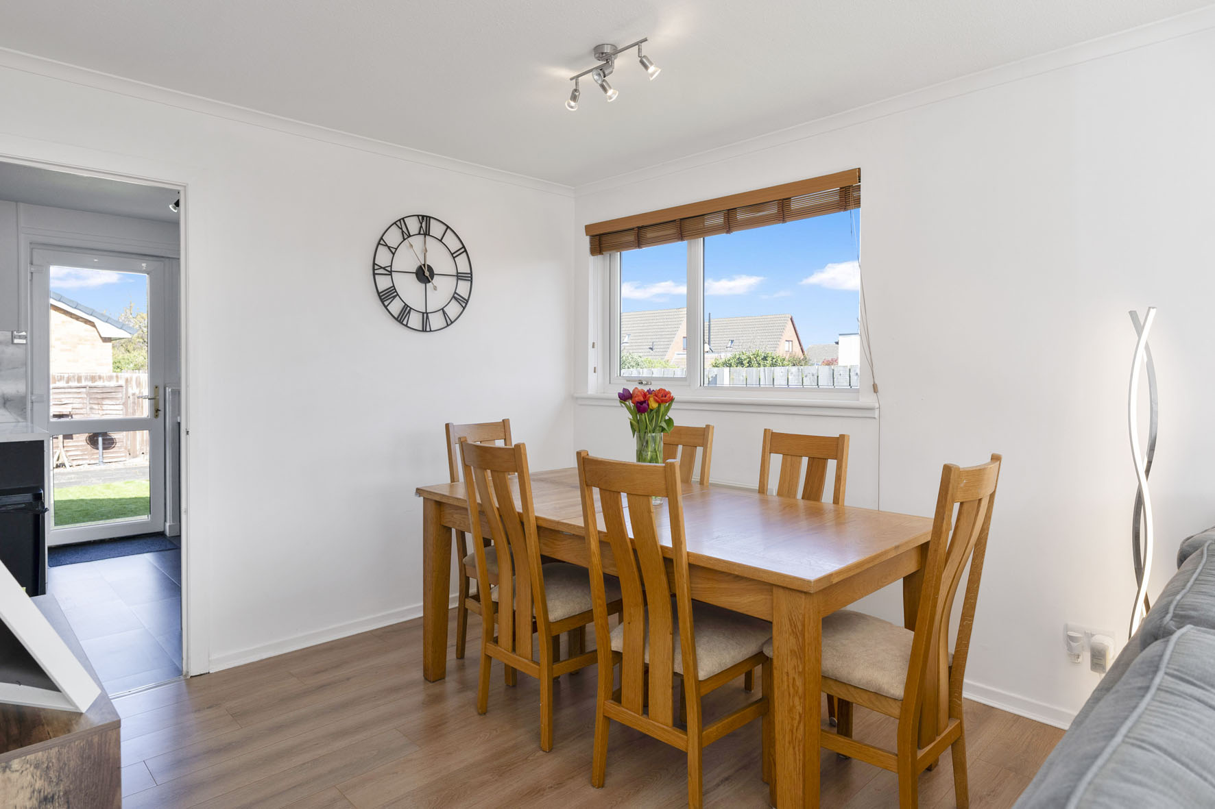 Warm wood-toned flooring and crisp white décor enhance the room’s bright and inviting atmosphere, whilst there is ample space for a large dining table beside a second window overlooking the rear garden.