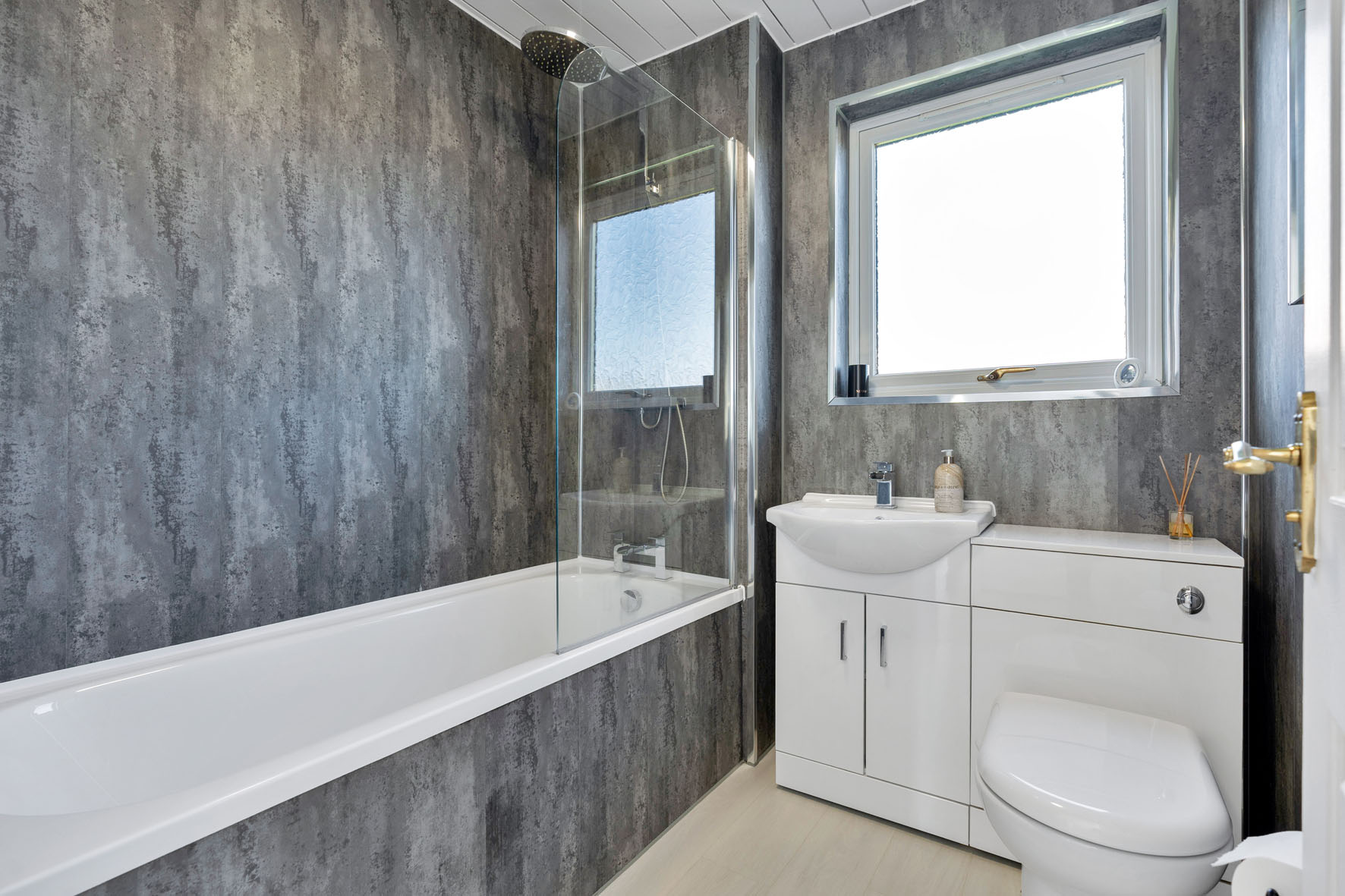 A sleek family bathroom completes the accommodation, fitted with a bath, overhead rainfall shower, and contemporary vanity storage.
