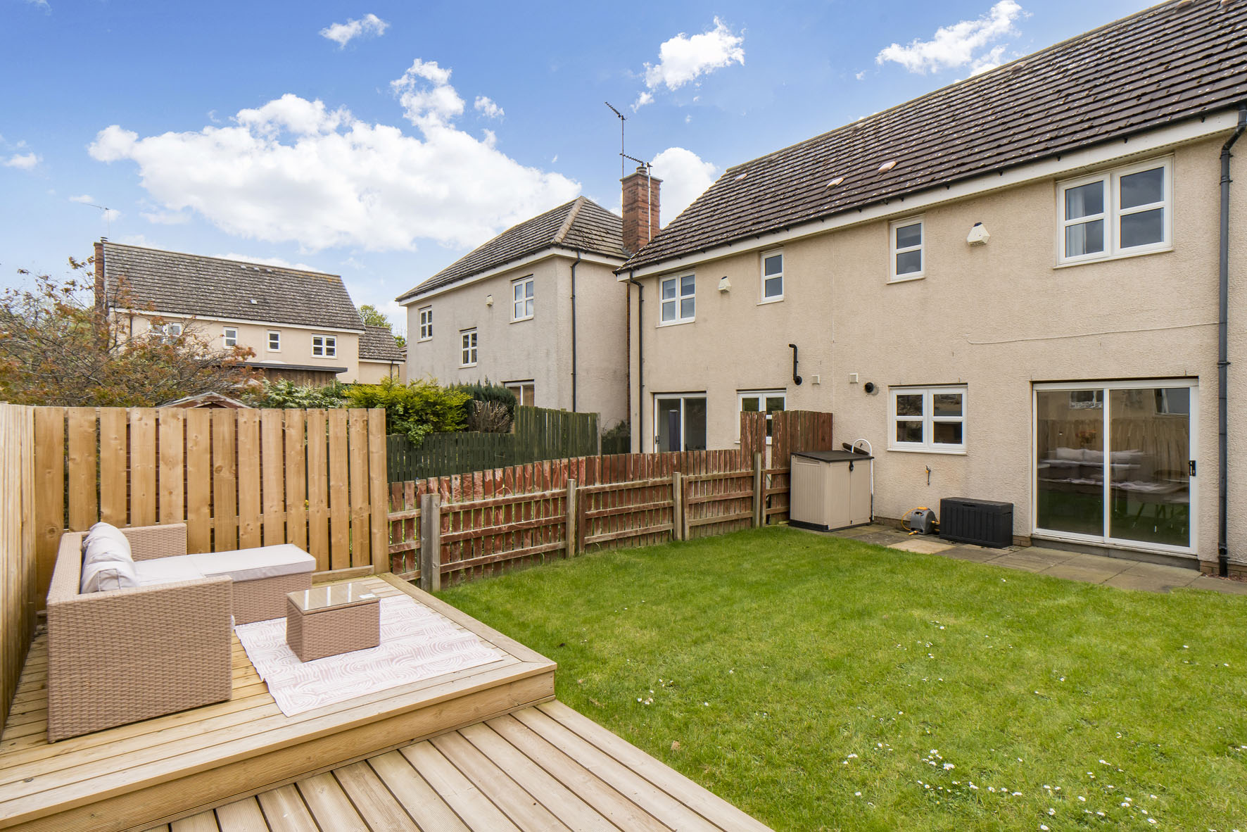 Outside, the home has a neat front lawn and a private driveway for off-street parking. It also has a fully-enclosed rear garden with a stretch of lawn backed by decking which offers a delightful space for relaxing and dining in the sun.