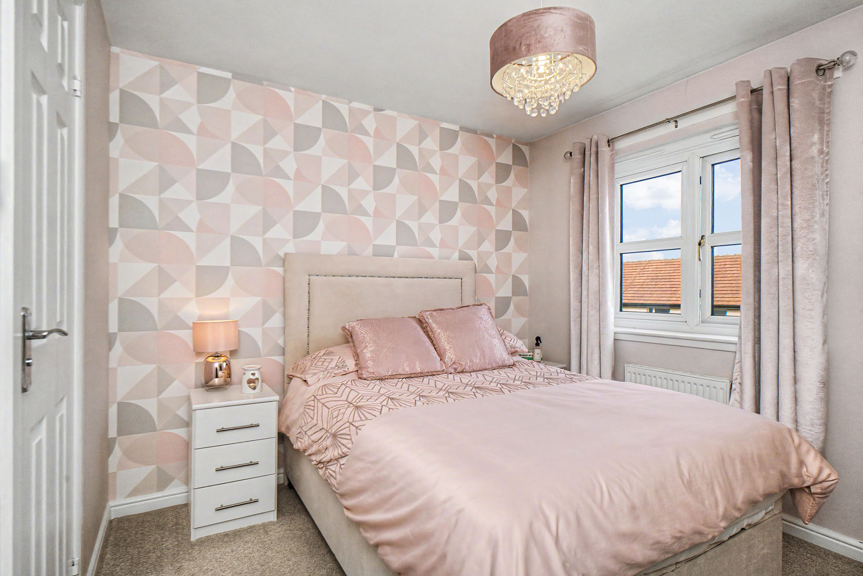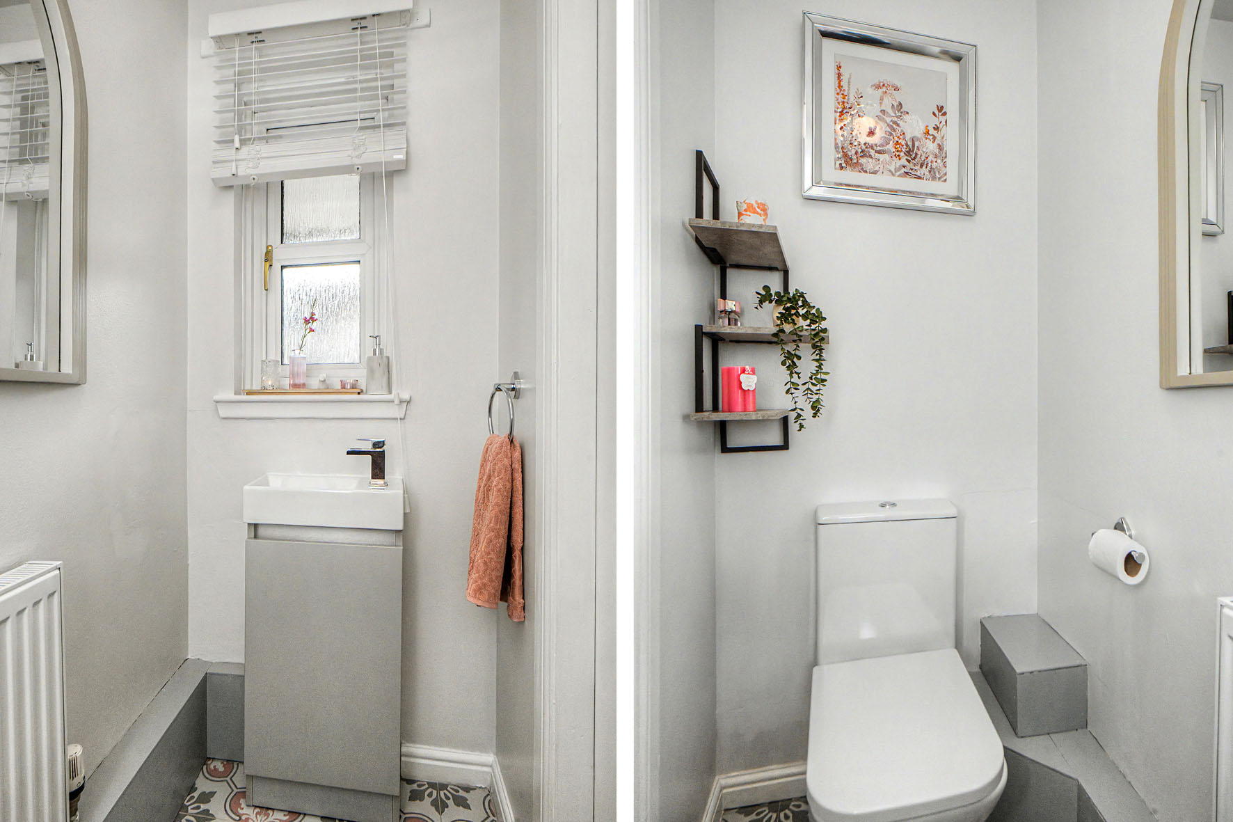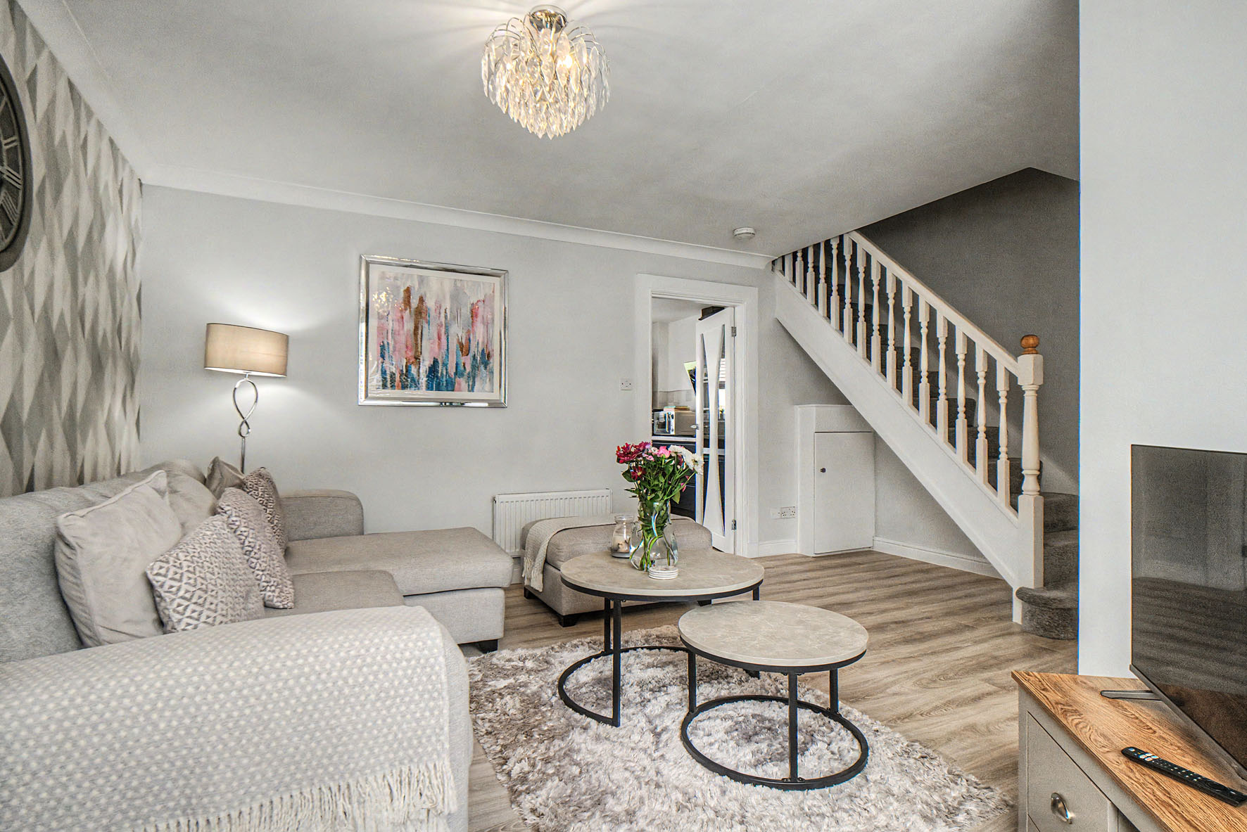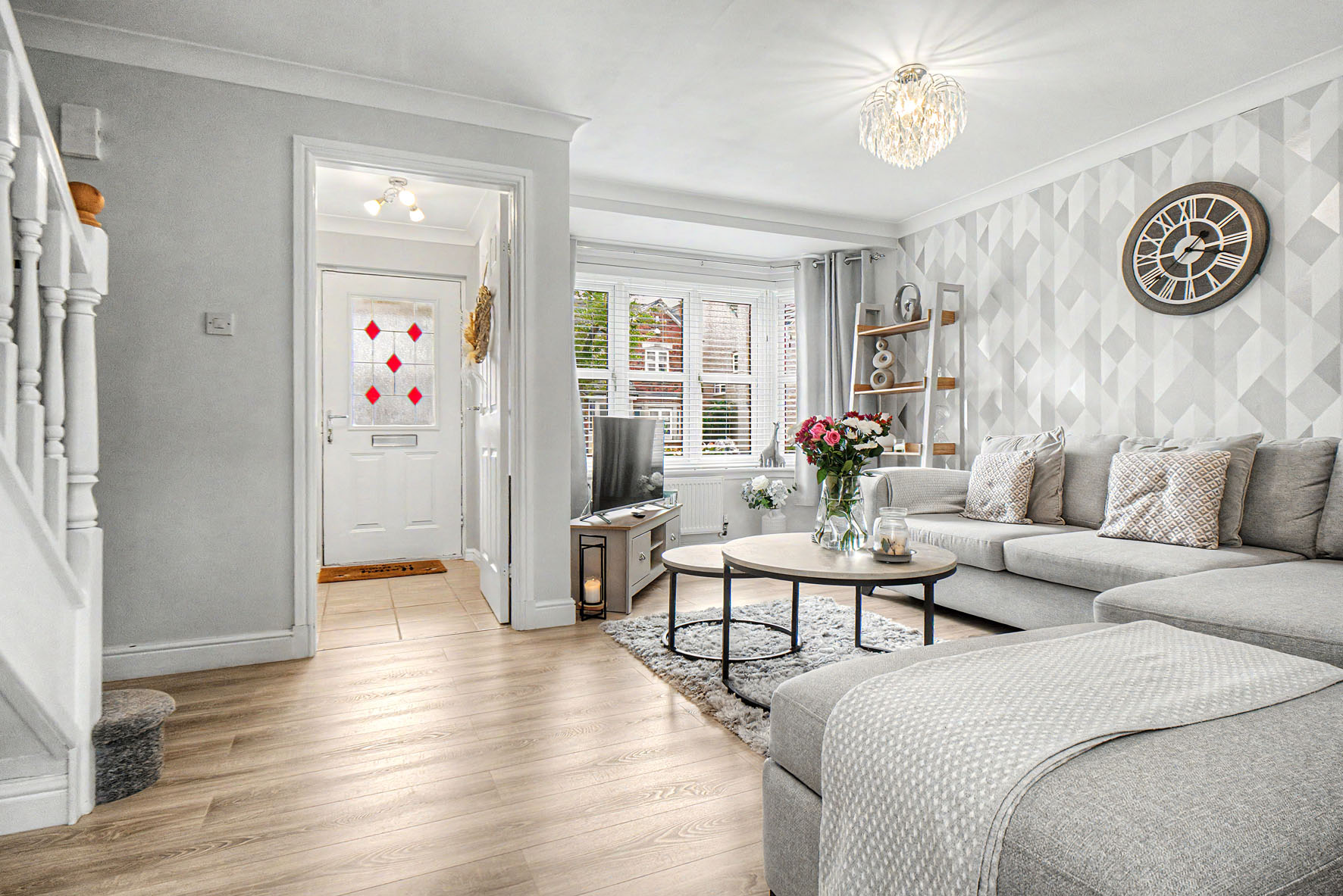 A hall welcomes you into the home providing a lovely first impression and a WC before leading directly into the living room. Here, neutral tones are enlivened by an accent wall and a wood-effect floor creating an elegant aesthetic. It has a spacious footprint for comfy lounge furniture and southwest-facing windows for a cascade of natural light.