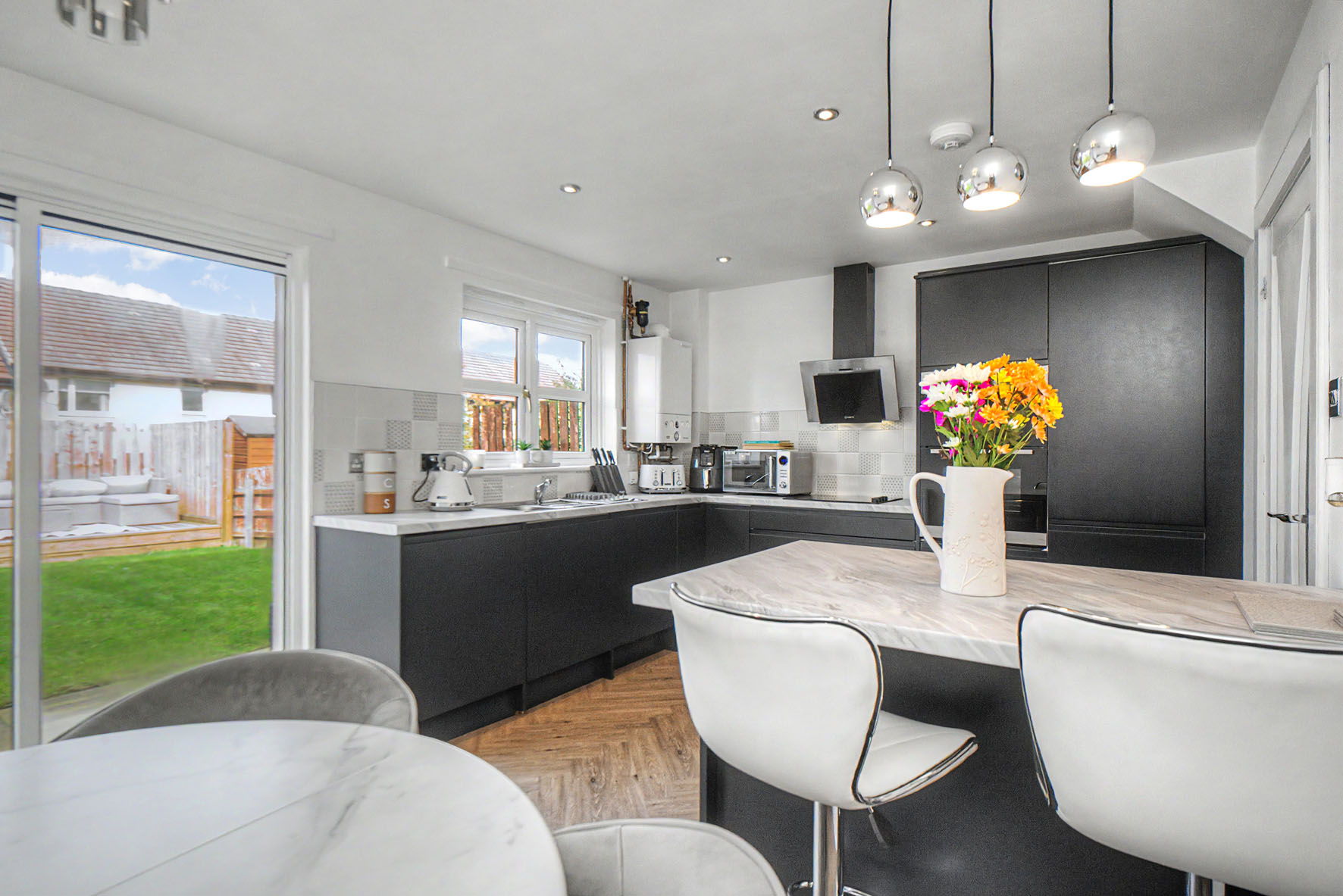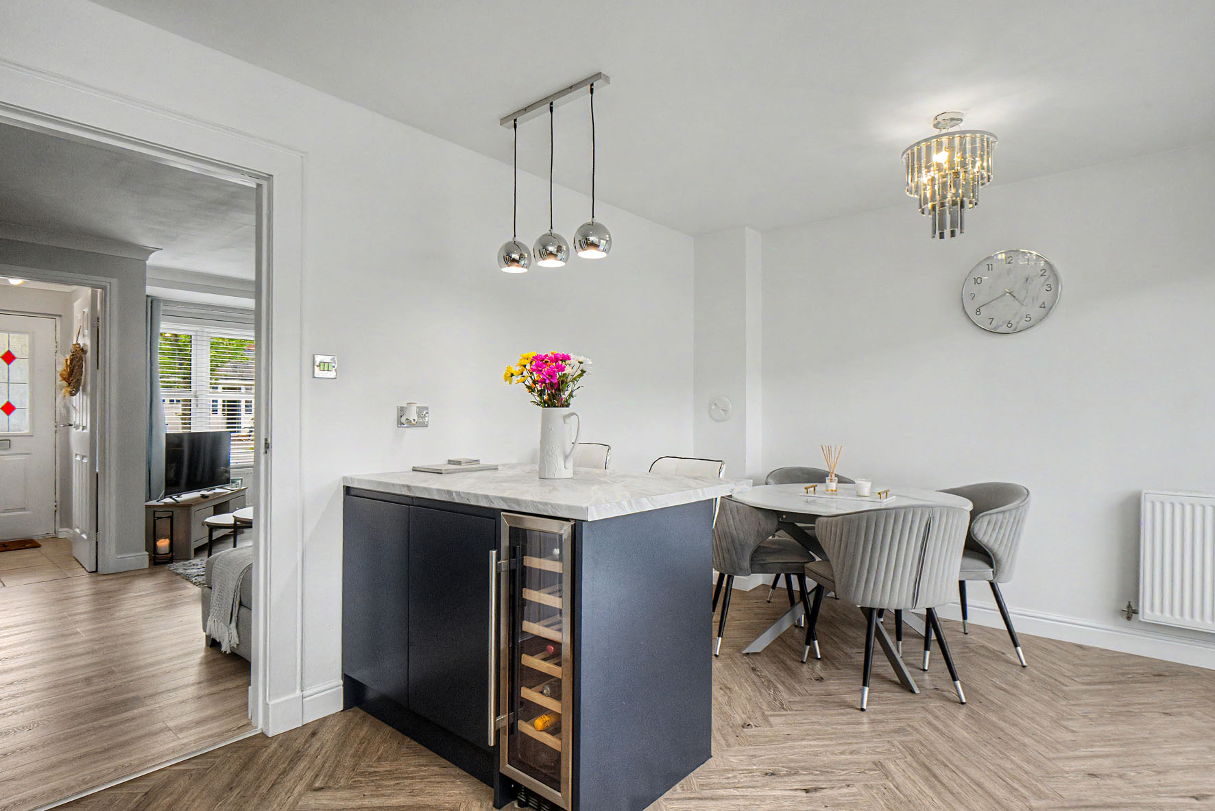 Next door, the breakfasting kitchen/dining room has a stylish arrangement of handle-less cabinets and marble-inspired worktops that include a fitted breakfast bar. It is a sophisticated design and colour palette reinforced by premium integrated appliances. There is plenty of space for a dining table as well, and patio doors to the garden.