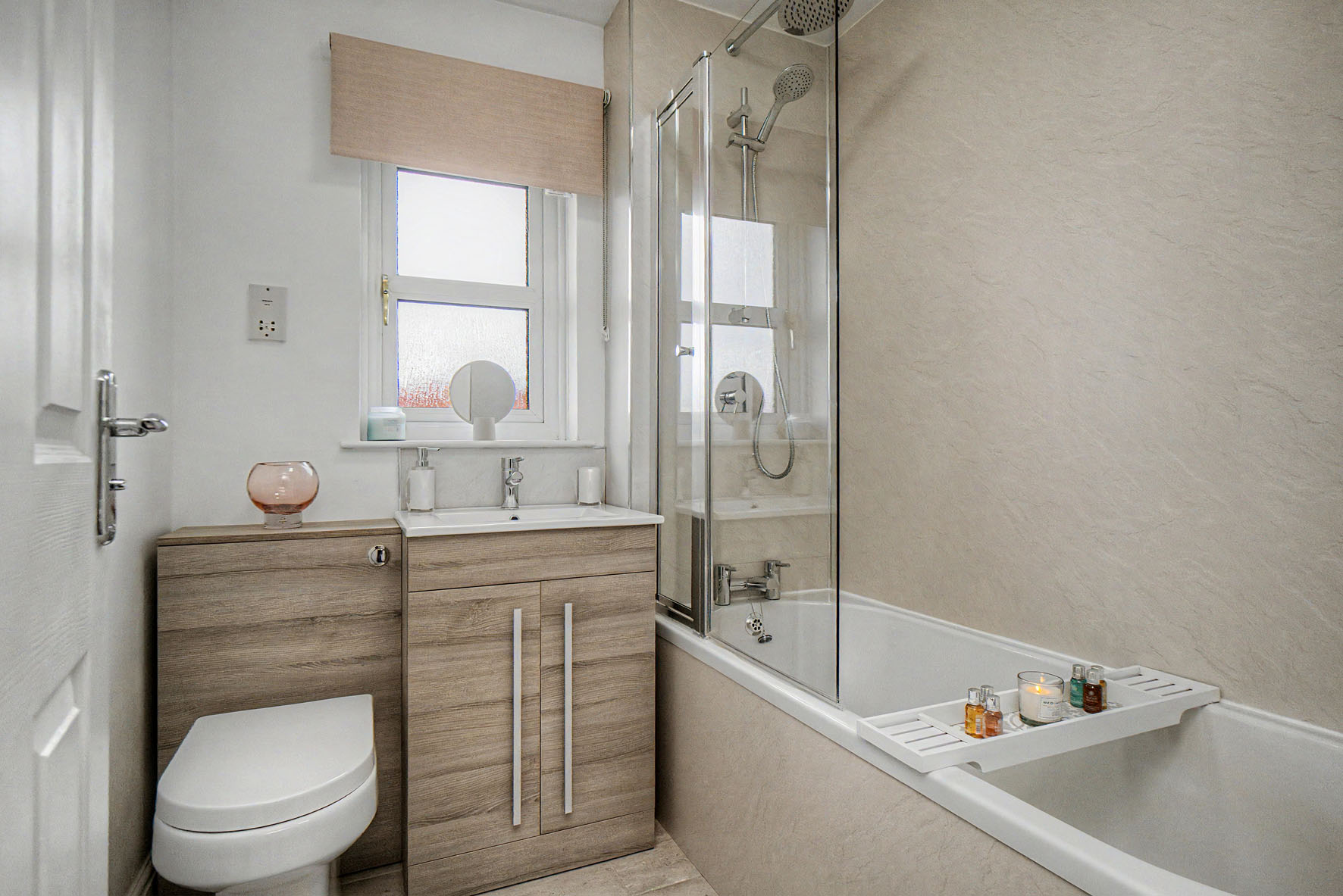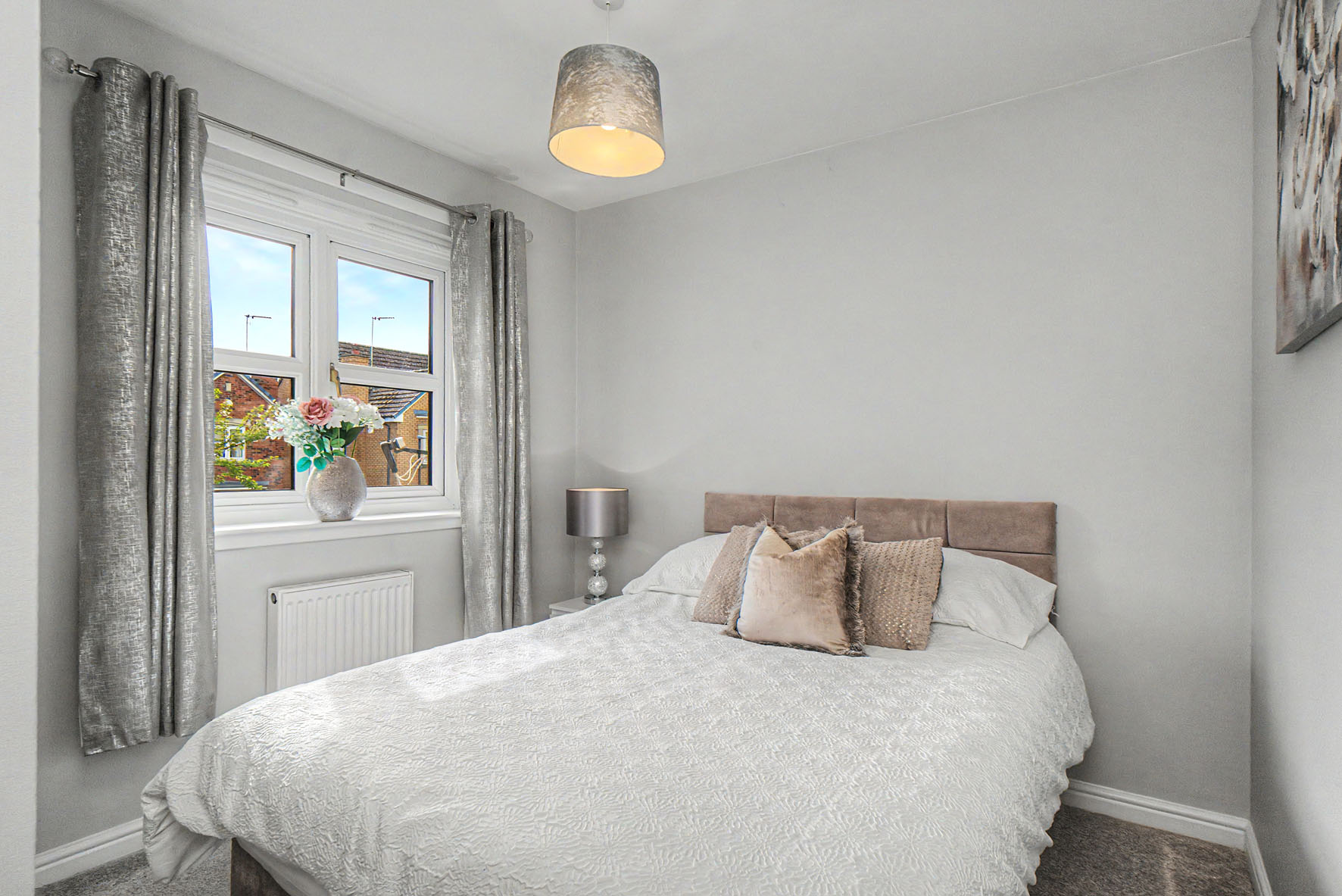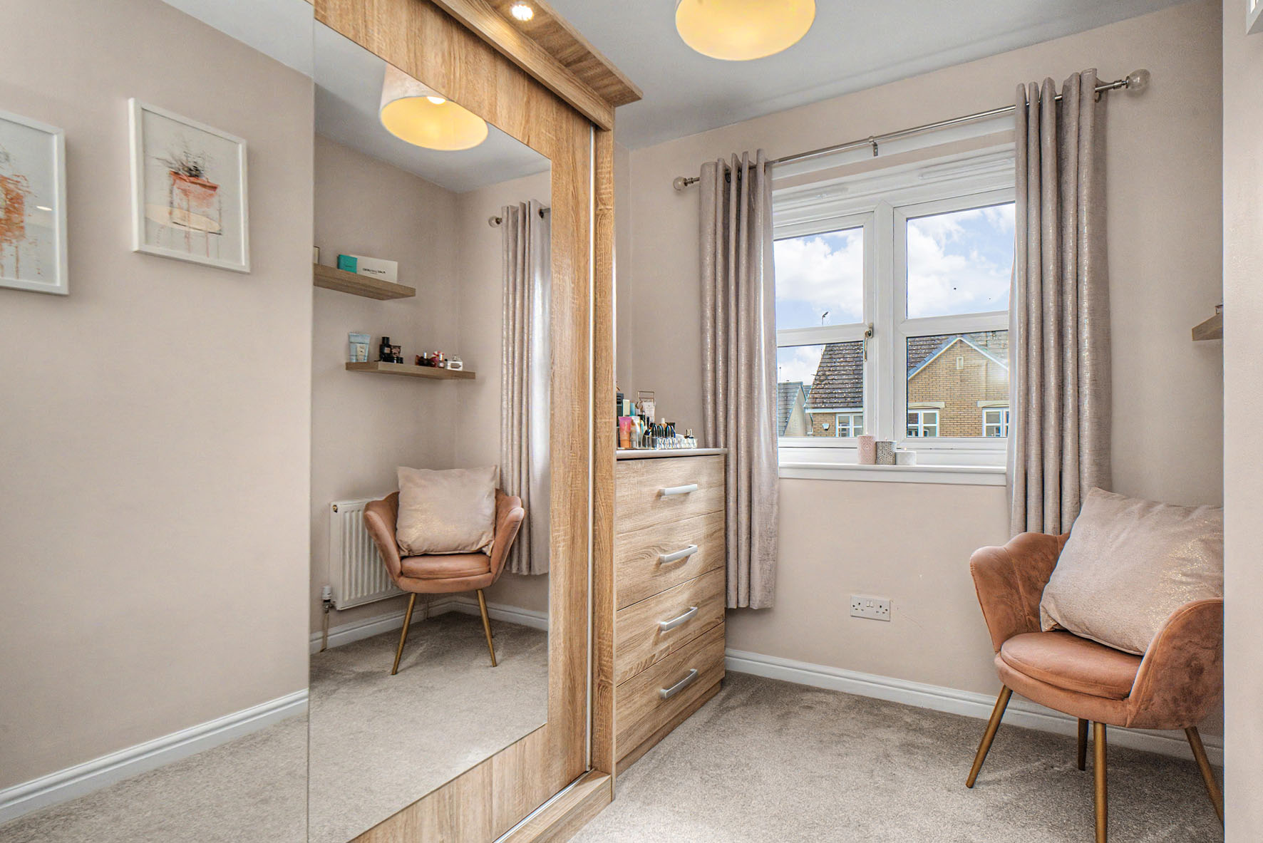 Upstairs, the three bedrooms all maintain the high standards, enjoying modern styling and plush carpets. The principal bedroom is a double with the luxury of a contemporary en-suite shower room that includes a walk-in rainfall shower. The second double bedroom has a built-in wardrobe, as does the third bedroom which is a flexible single currently used as a dressing/vanity room. The interiors are finished by a high-end family bathroom with two overhead showers. Gas central heating and double glazing ensure year-round comfort.